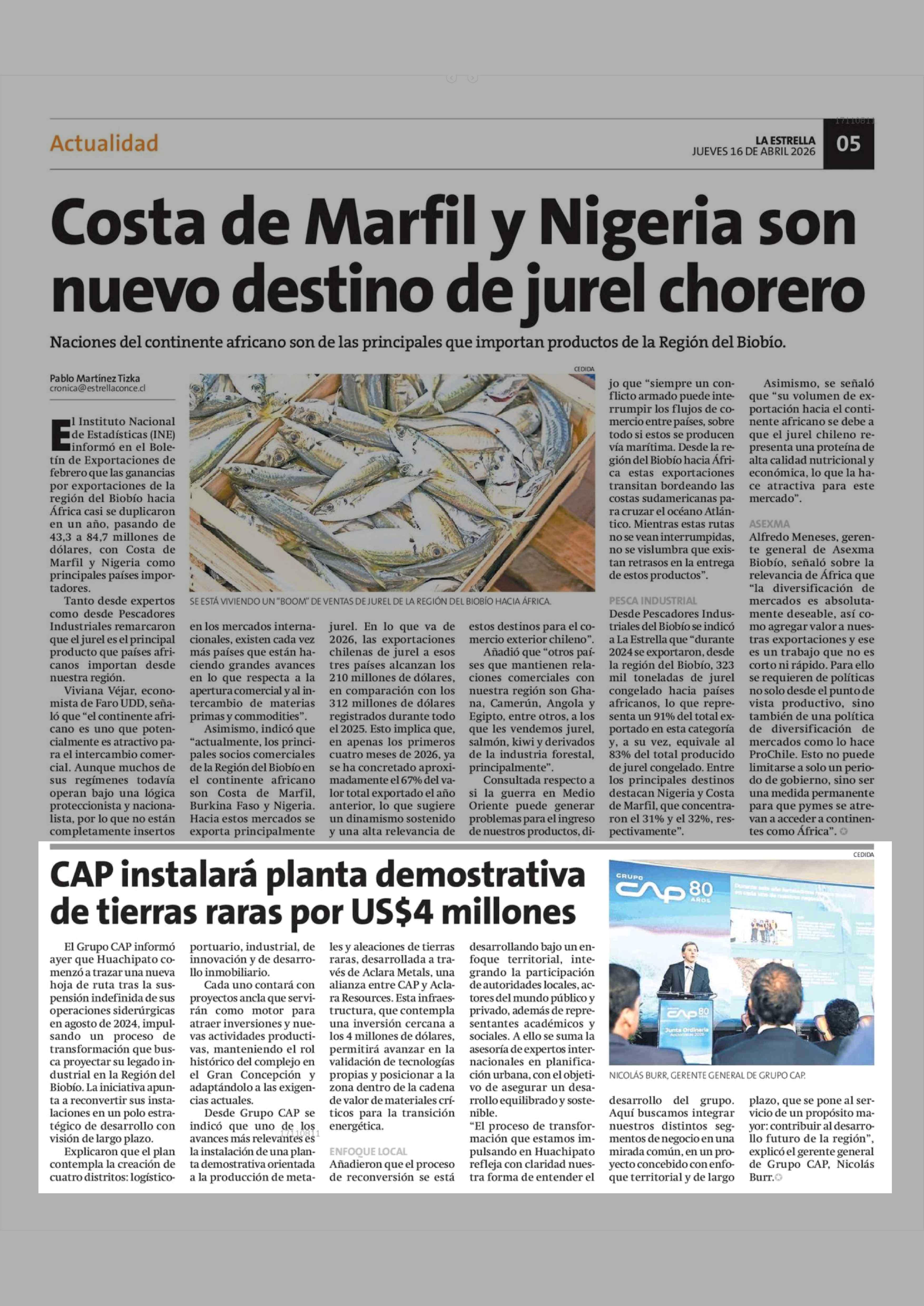 CAP instalará planta demostrativa de tierras raras por US$4 millones 16-04-2026 La Estrella de Concepción |