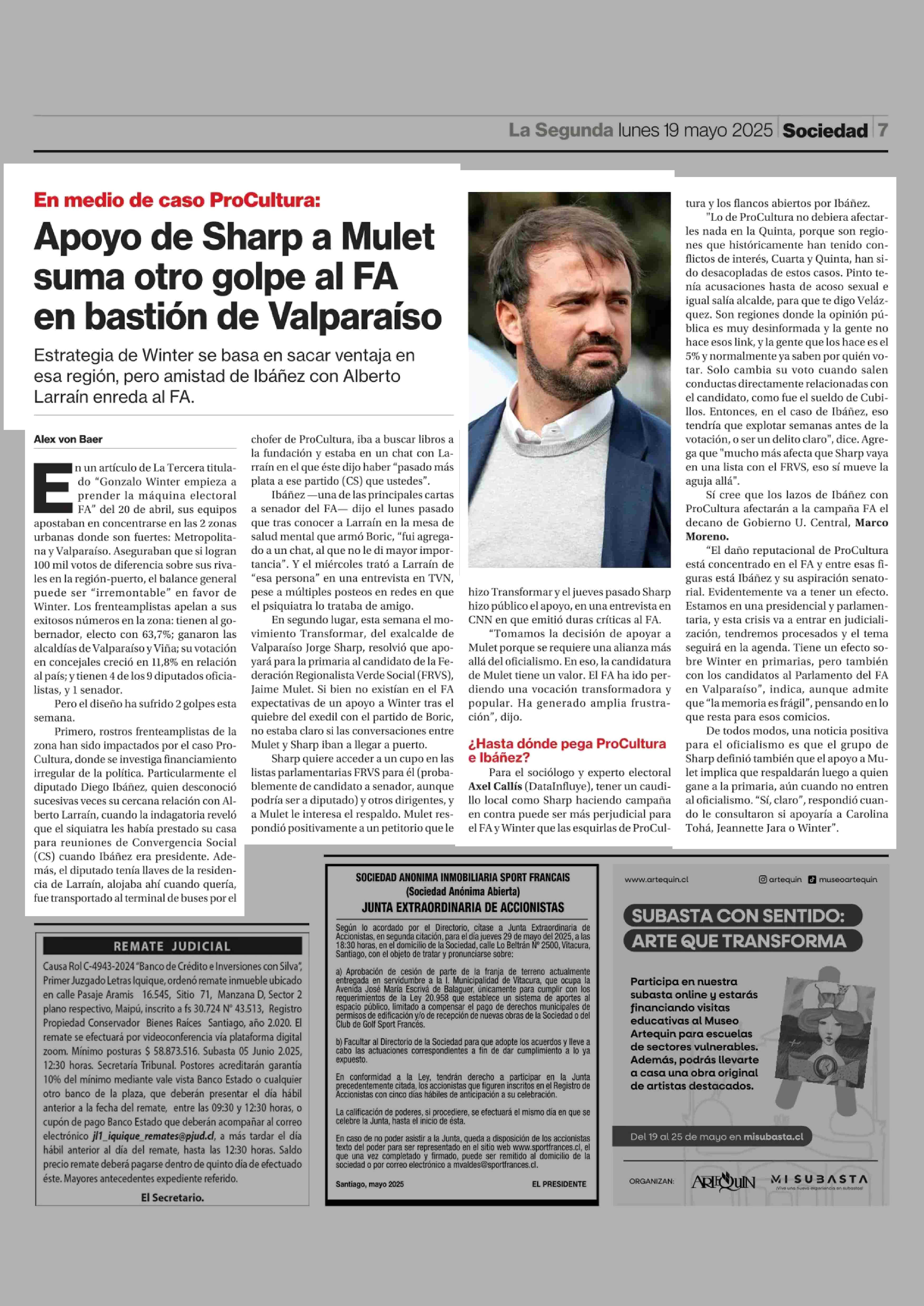 Apoyo de Sharp a Mulet suma otro golpe al FA en bastión de Valparaíso 19-05-2025 La Segunda |