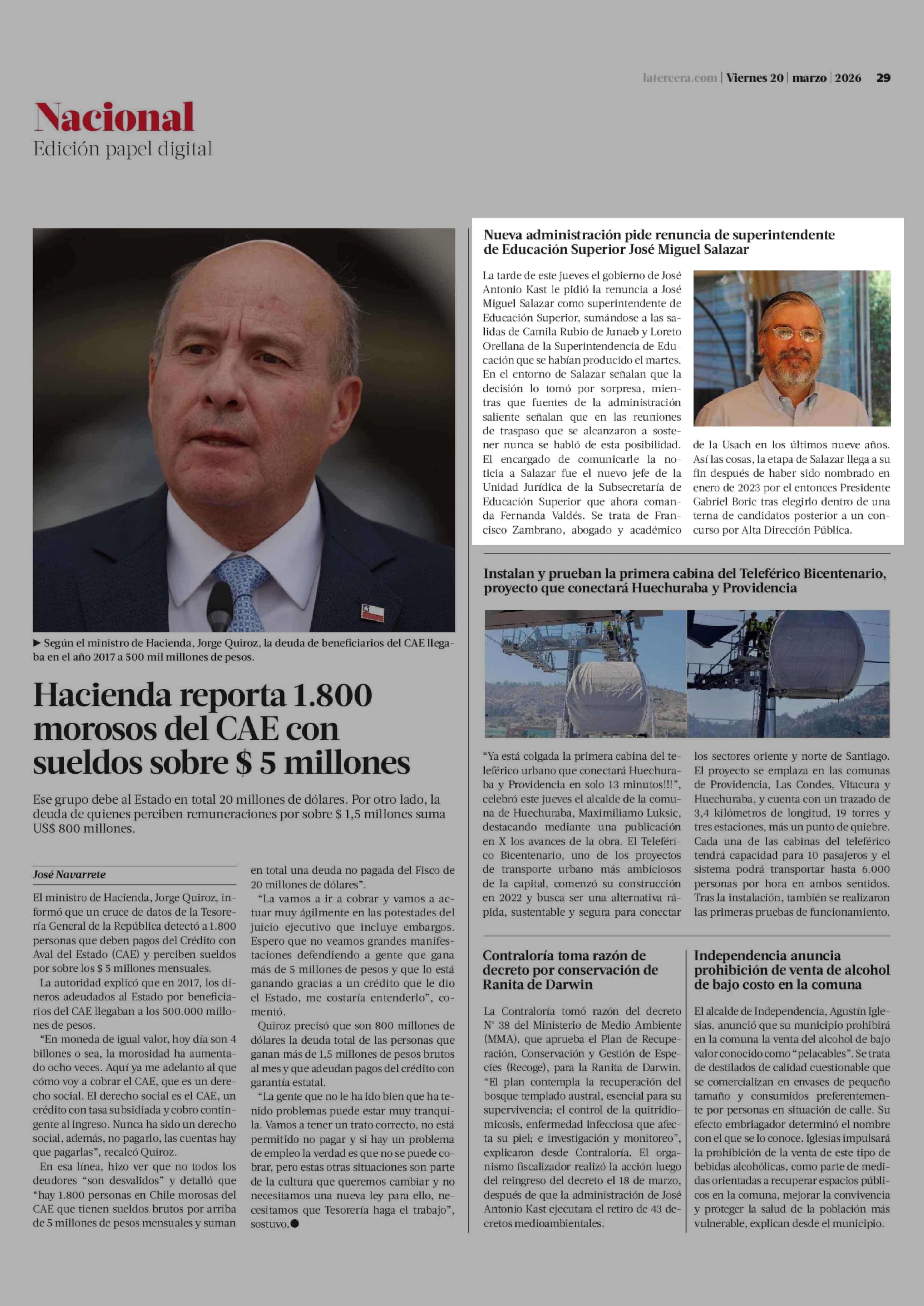 Nueva administración pide renuncia de superintendente de Educación Superior José Miguel Salazar 20-03-2026 La Tercera |