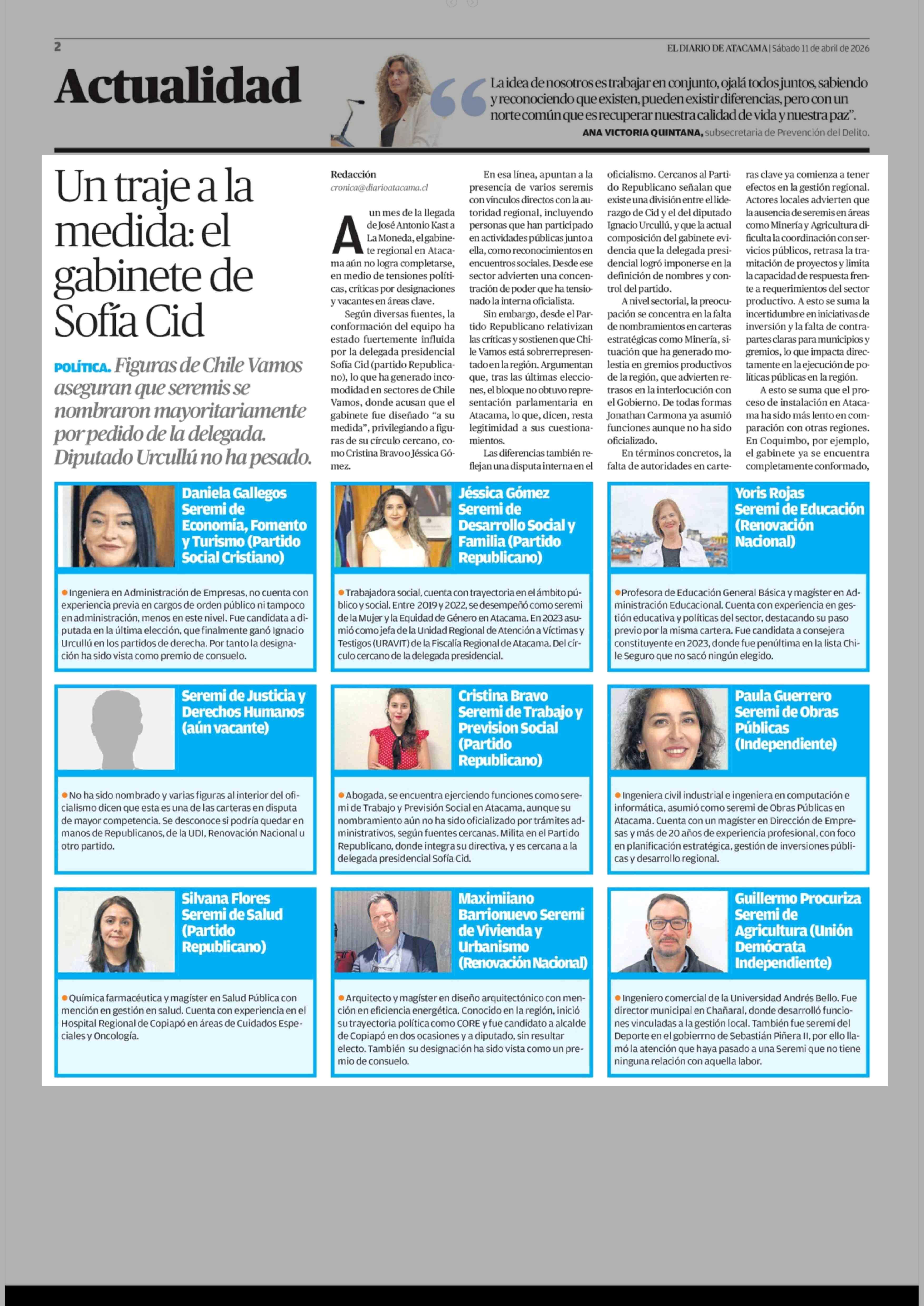 Un traje a la medida: el gabinete de Sofía Cid 11-04-2026 El Diario de Atacama |