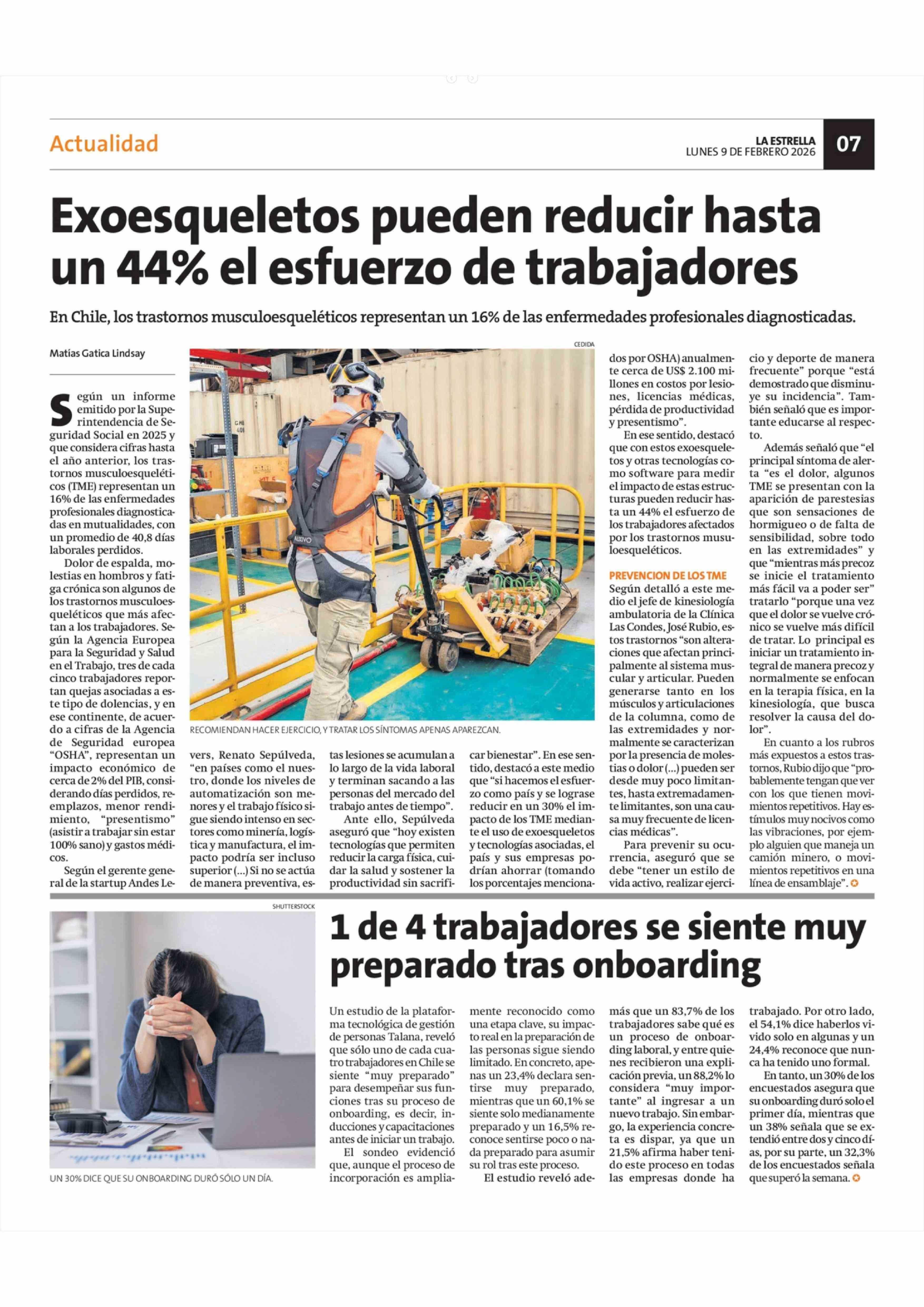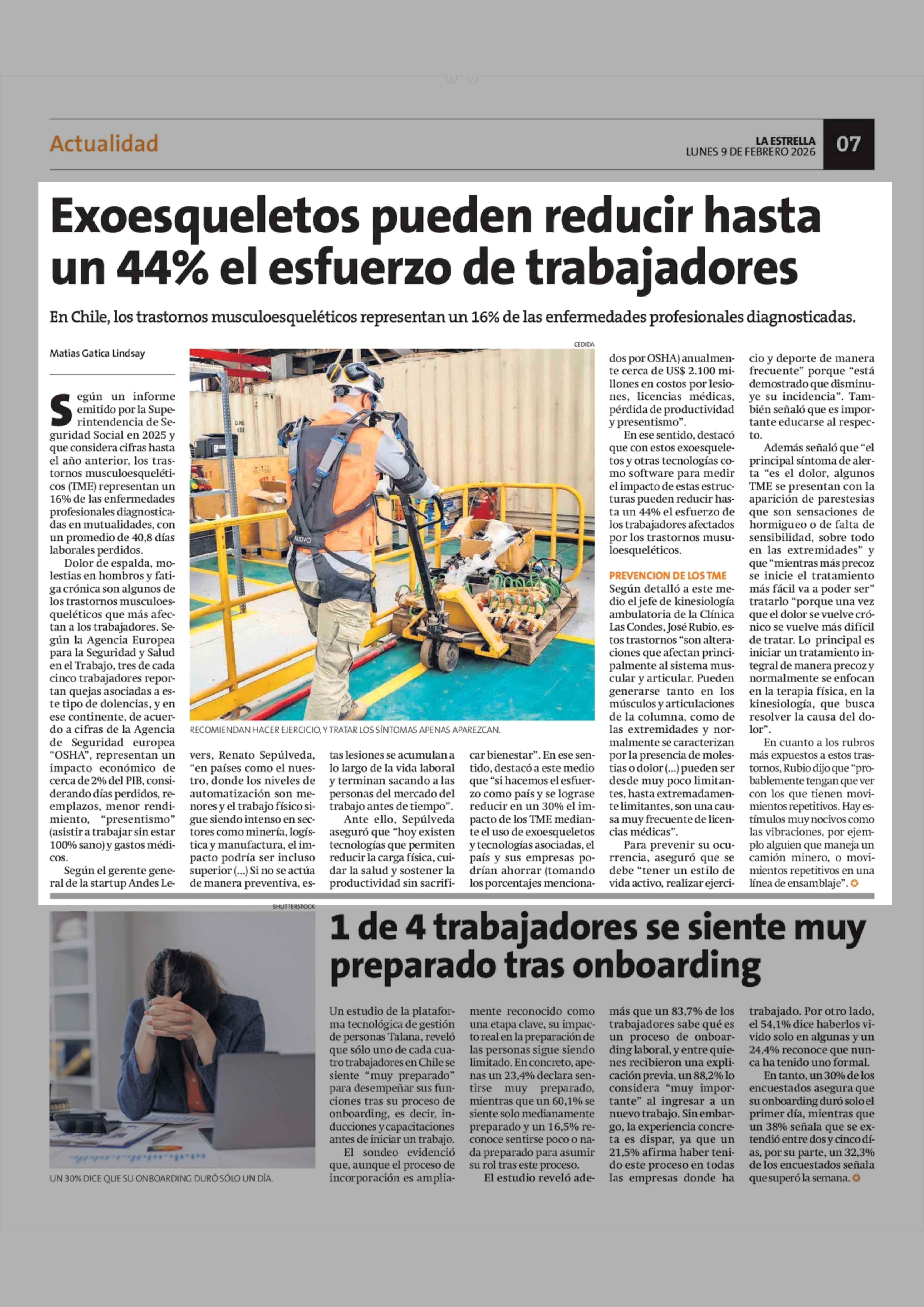 Exoesqueletos pueden reducir hasta un 44% el esfuerzo de trabajadores 09-02-2026 La Estrella de Concepción |