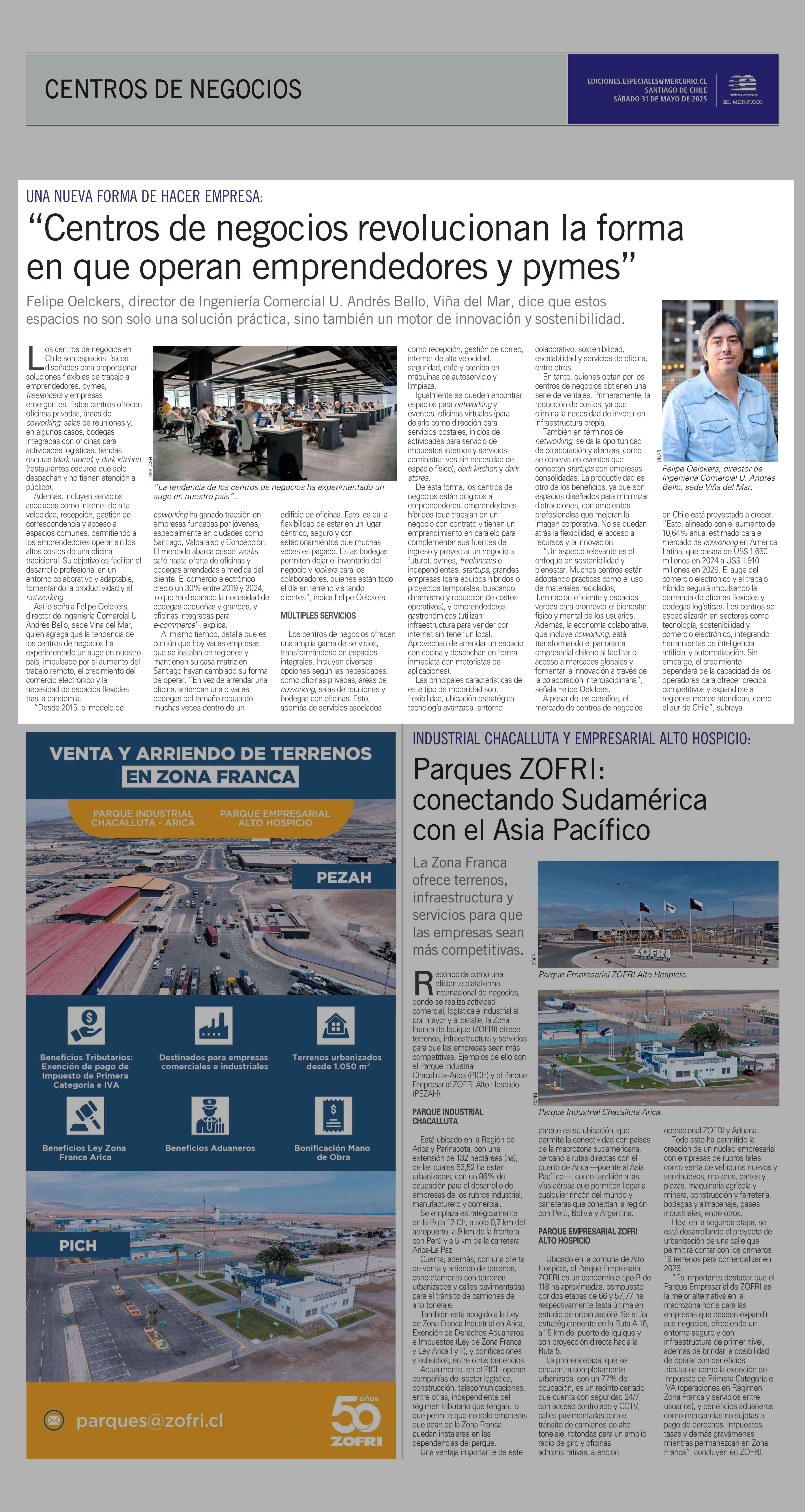 “Centros de negocios revolucionan la forma en que operan emprendedores y pymes” 31-05-2025 El Mercurio |