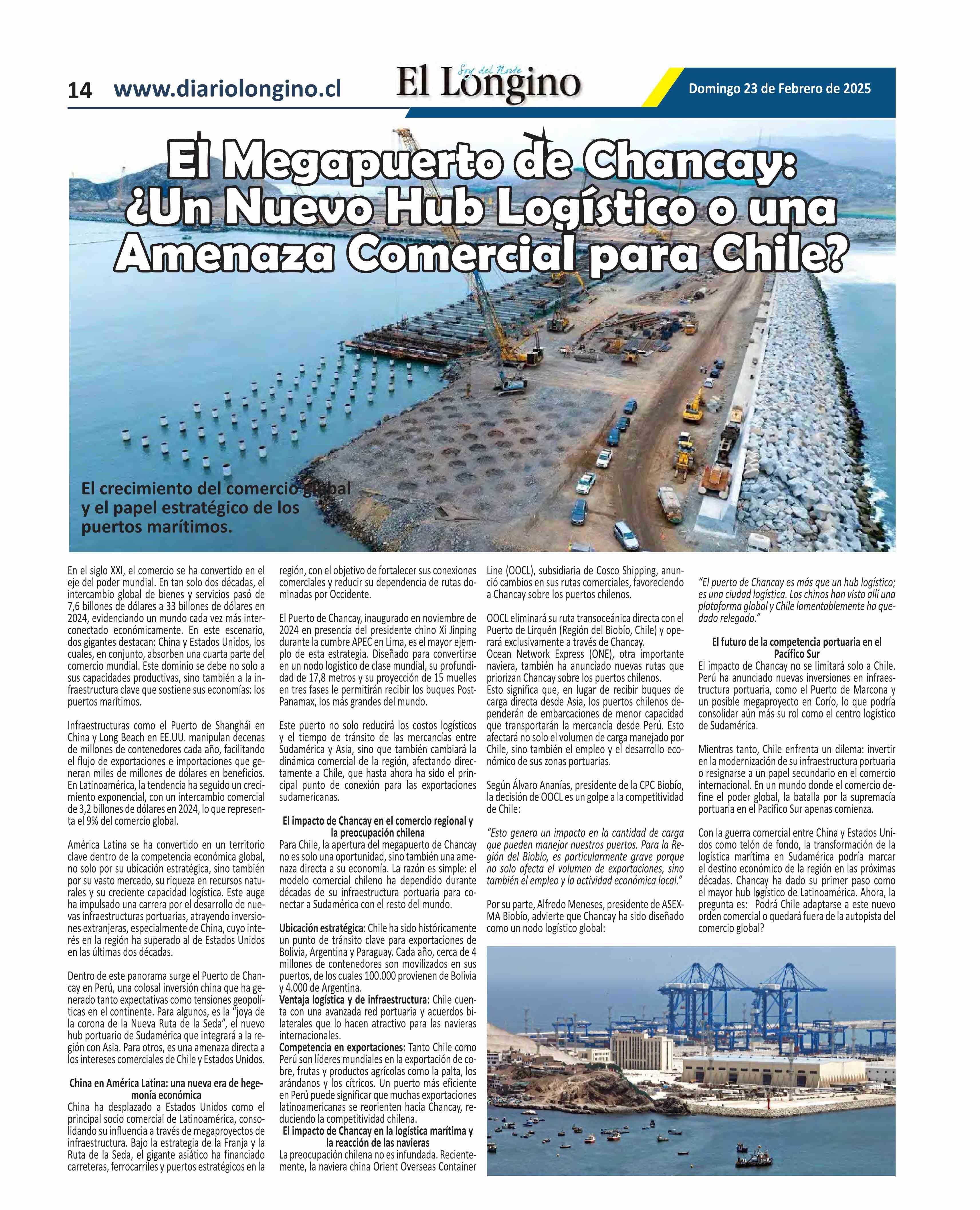 El Megapuerto de Chancay: El Megapuerto de Chancay: ¿Un Nuevo Hub Logístico o una ¿Un Nuevo Hub Logístico o una Amenaza Comercial para Chile? Amenaza Comercial para Chile? 23-02-2025 El Longino |