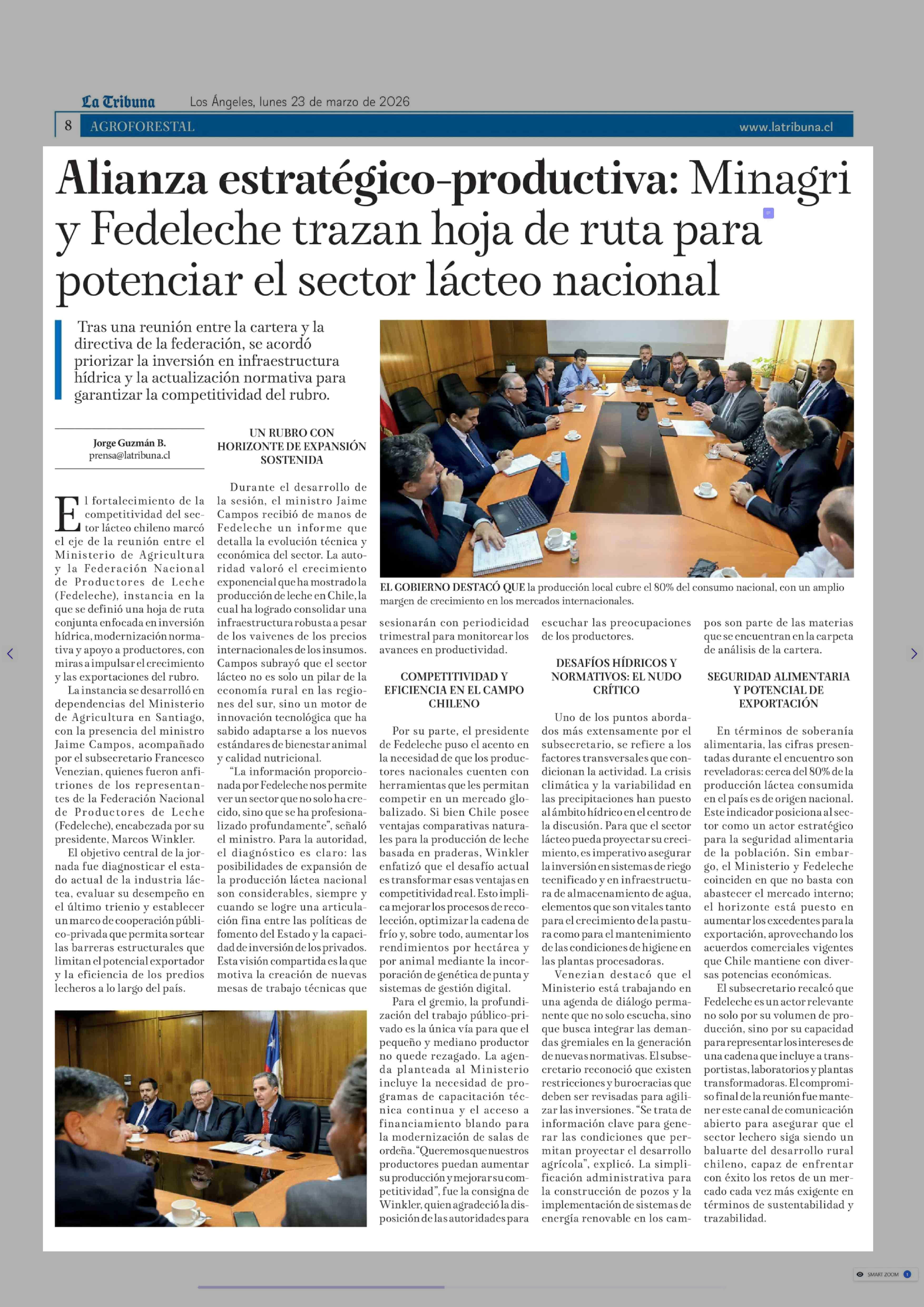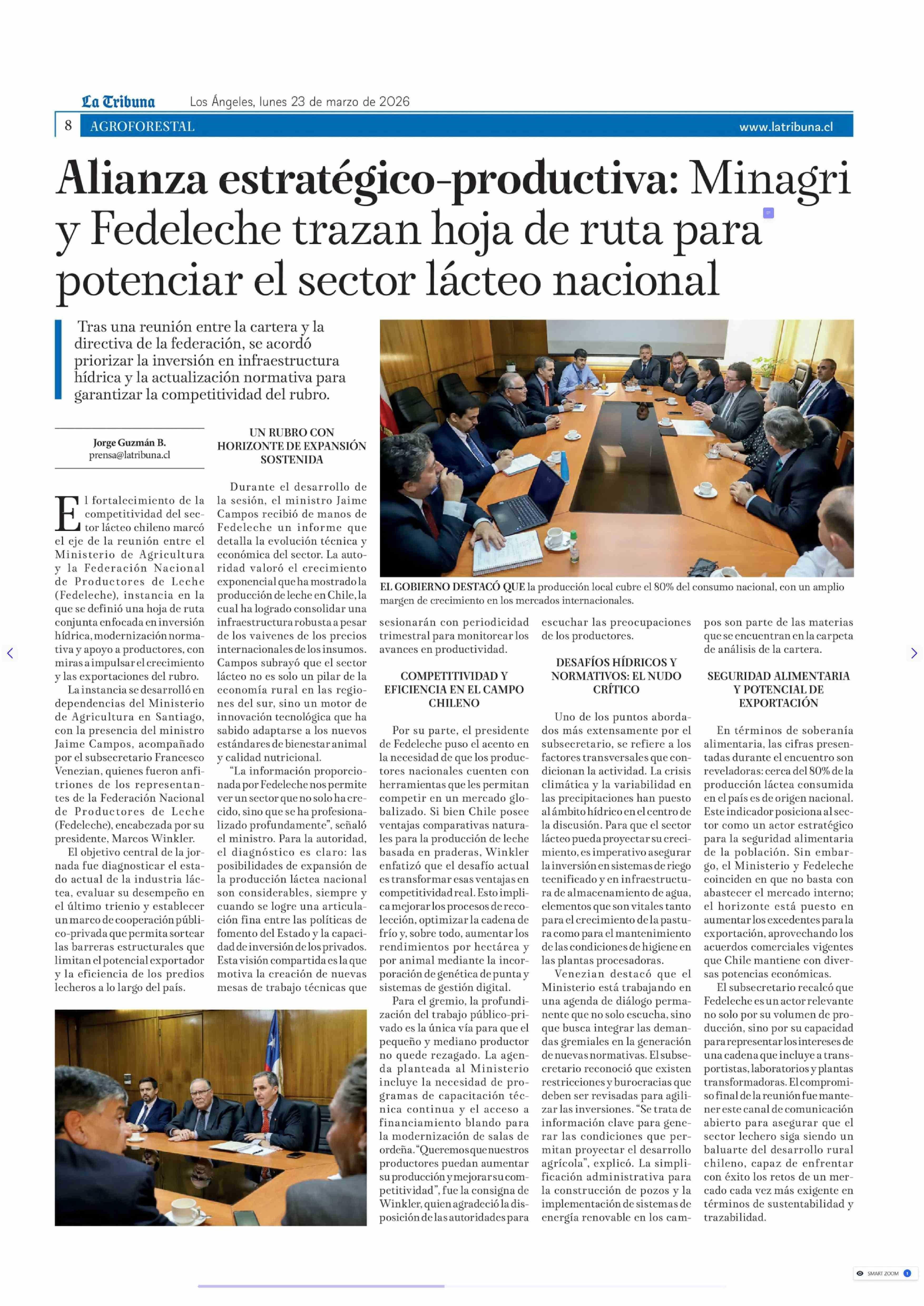 Alianza estratégico-productiva: Minagri y Fedeleche trazan hoja de ruta para potenciar el sector lácteo nacional 23-03-2026 La Tribuna |