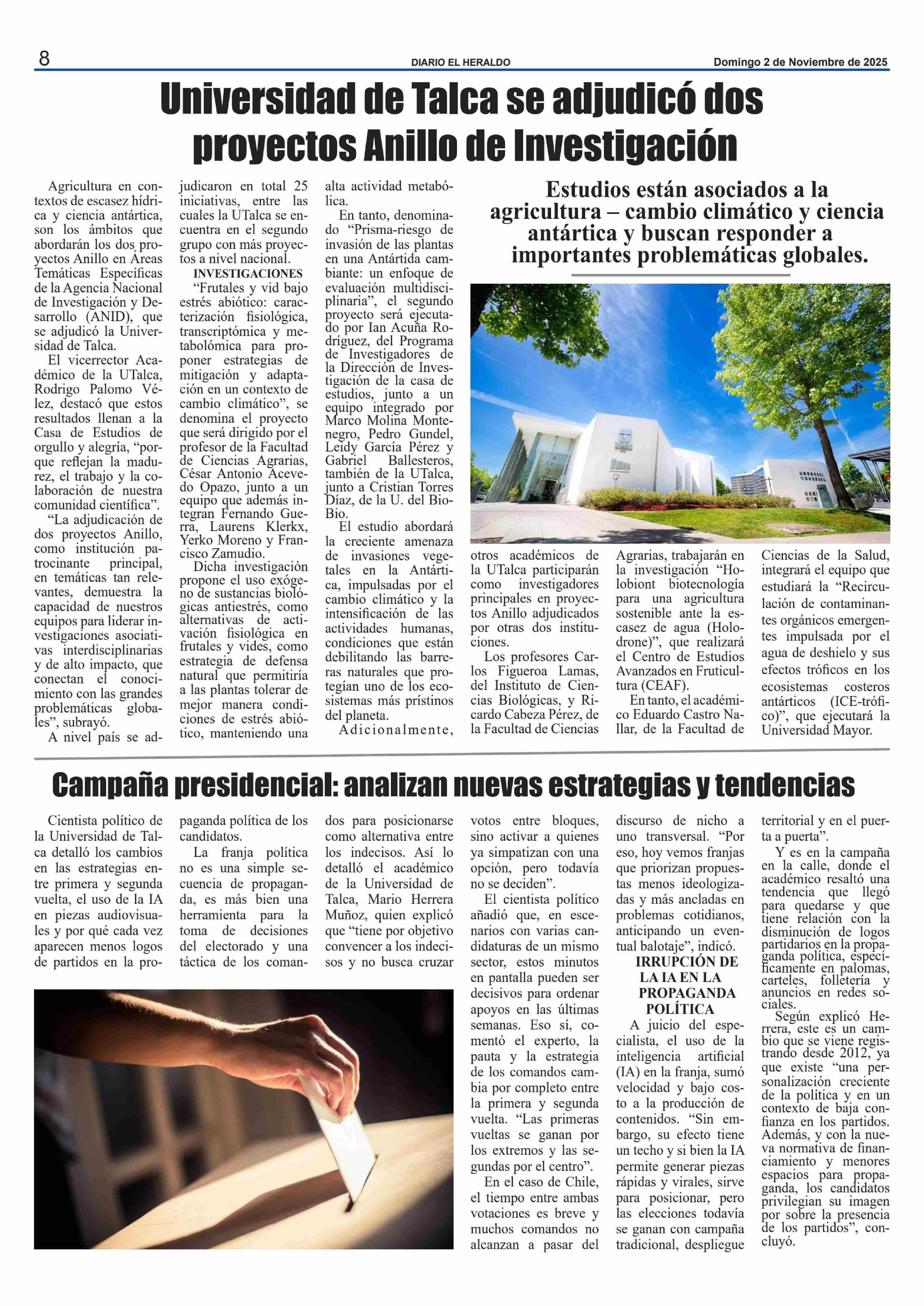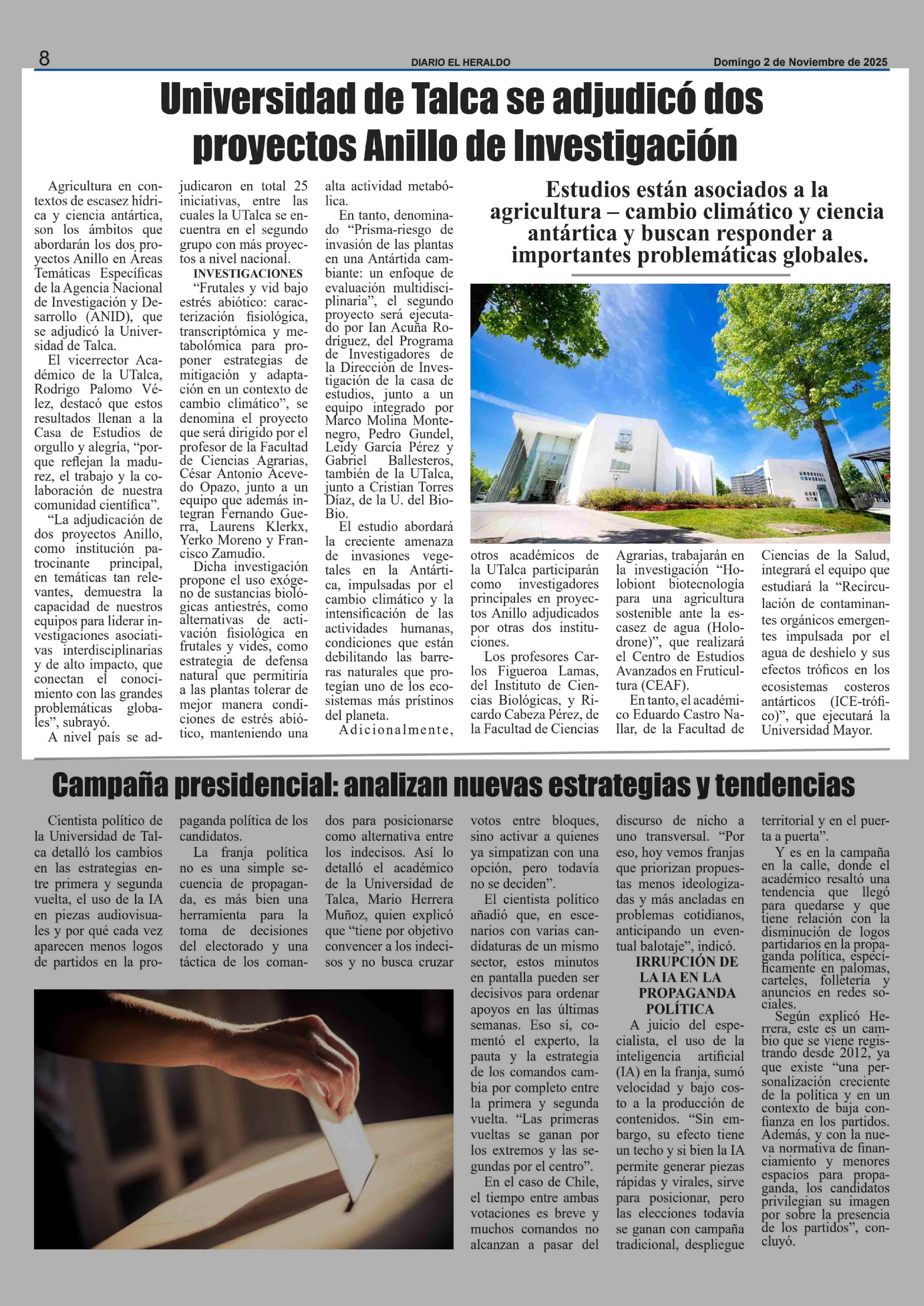 Universidad de Talca se adjudicó dos proyectos Anillo de Investigación 02-11-2025 El Heraldo  |