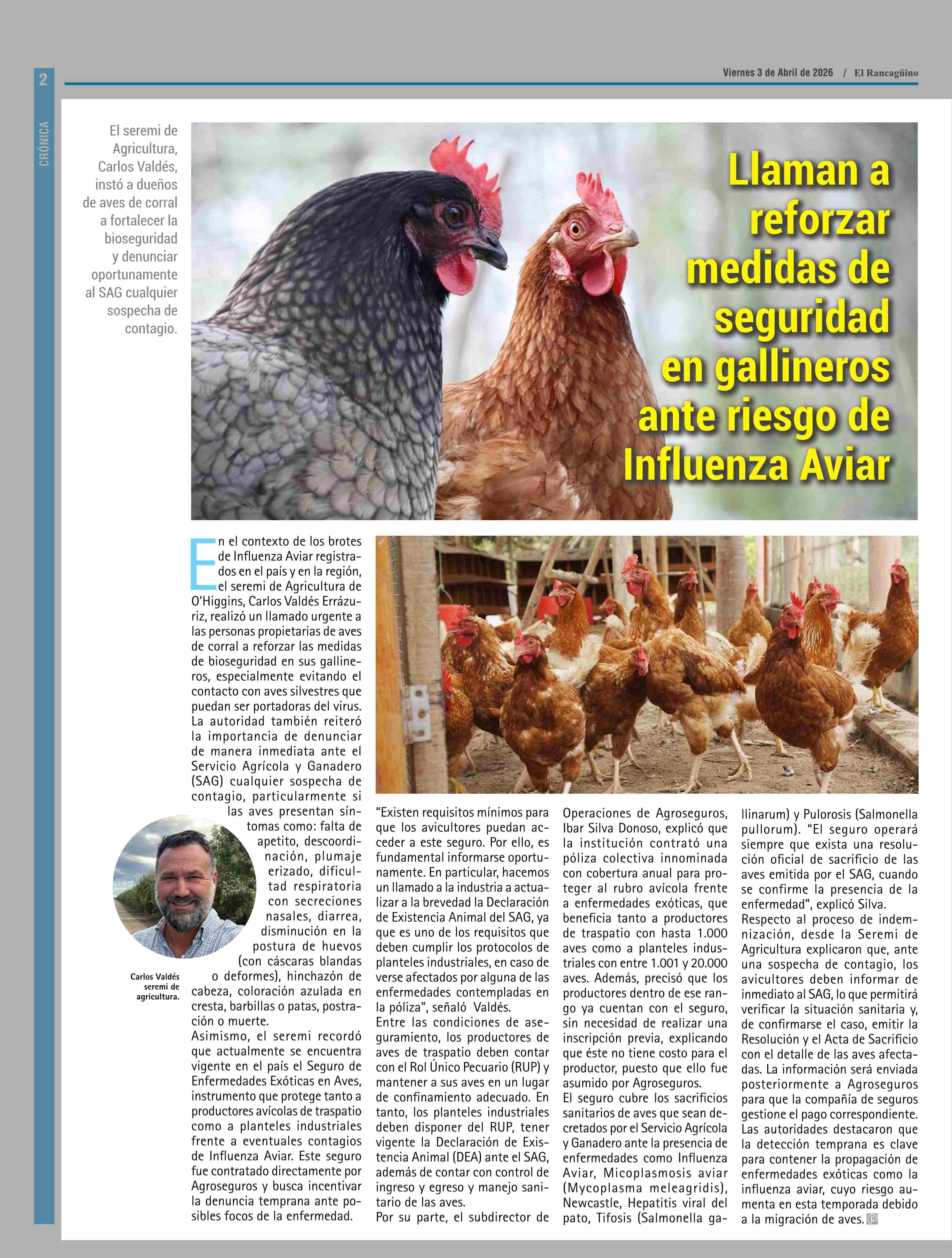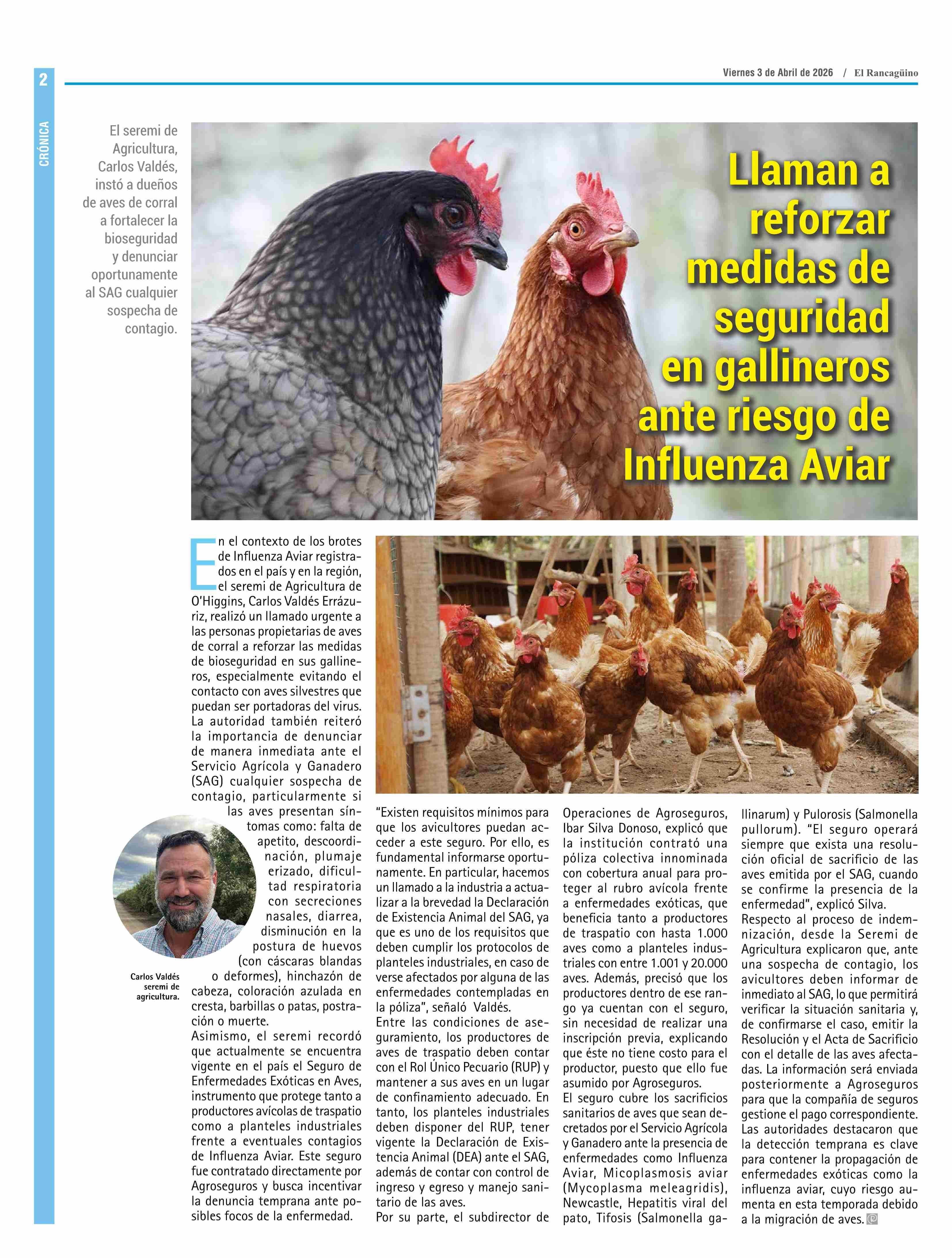 Llaman a reforzar medidas de seguridad en gallineros ante riesgo de Influenza Aviar 03-04-2026 El Rancagüino |