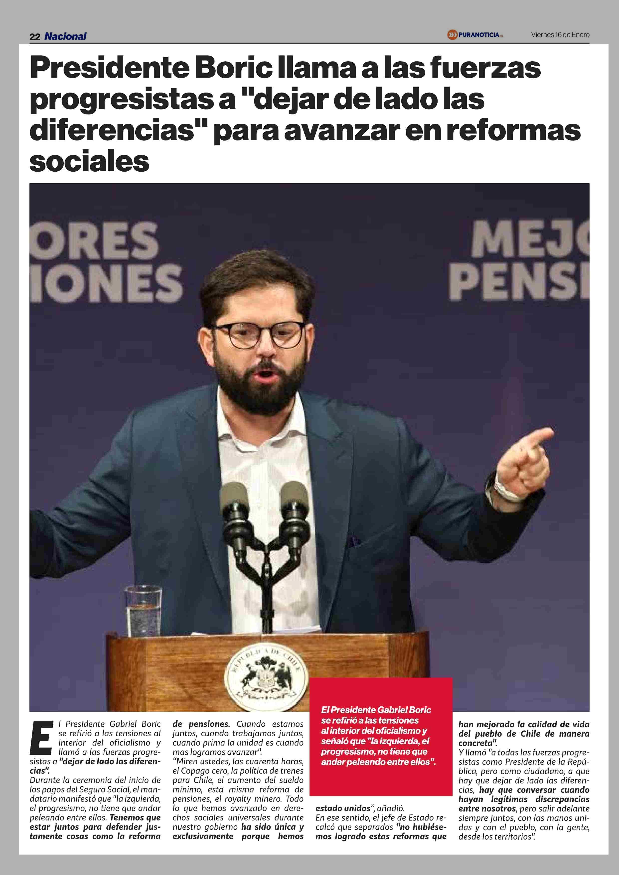Presidente Boric llama a las fuerzas progresistas a “dejar de lado las diferencias” para avanzar en reformas 16-01-2026 Puranoticia.cl |