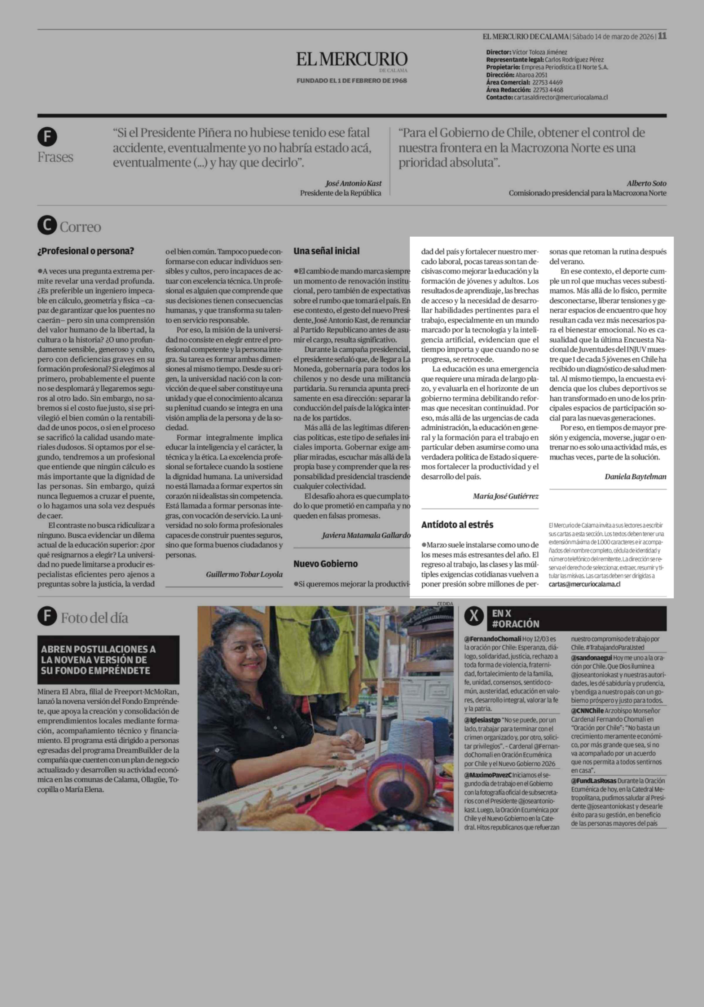 Cartas: Antídoto al estrés 14-03-2026 El Mercurio de Calama |
