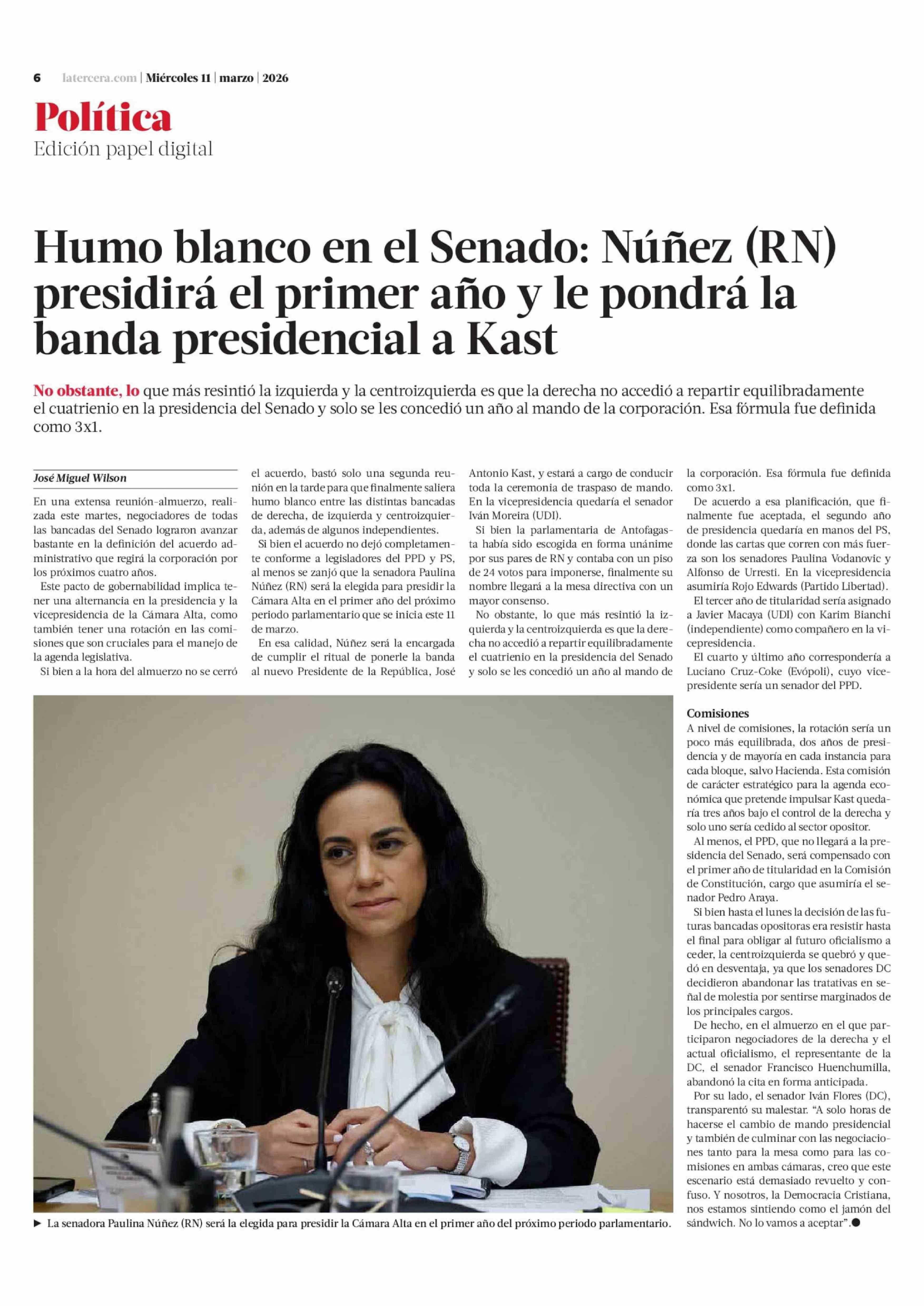 Humo blanco en el Senado: Núñez (RN) presidirá el primer año y le pondrá la banda presidencial a Kast 11-03-2026 La Tercera |