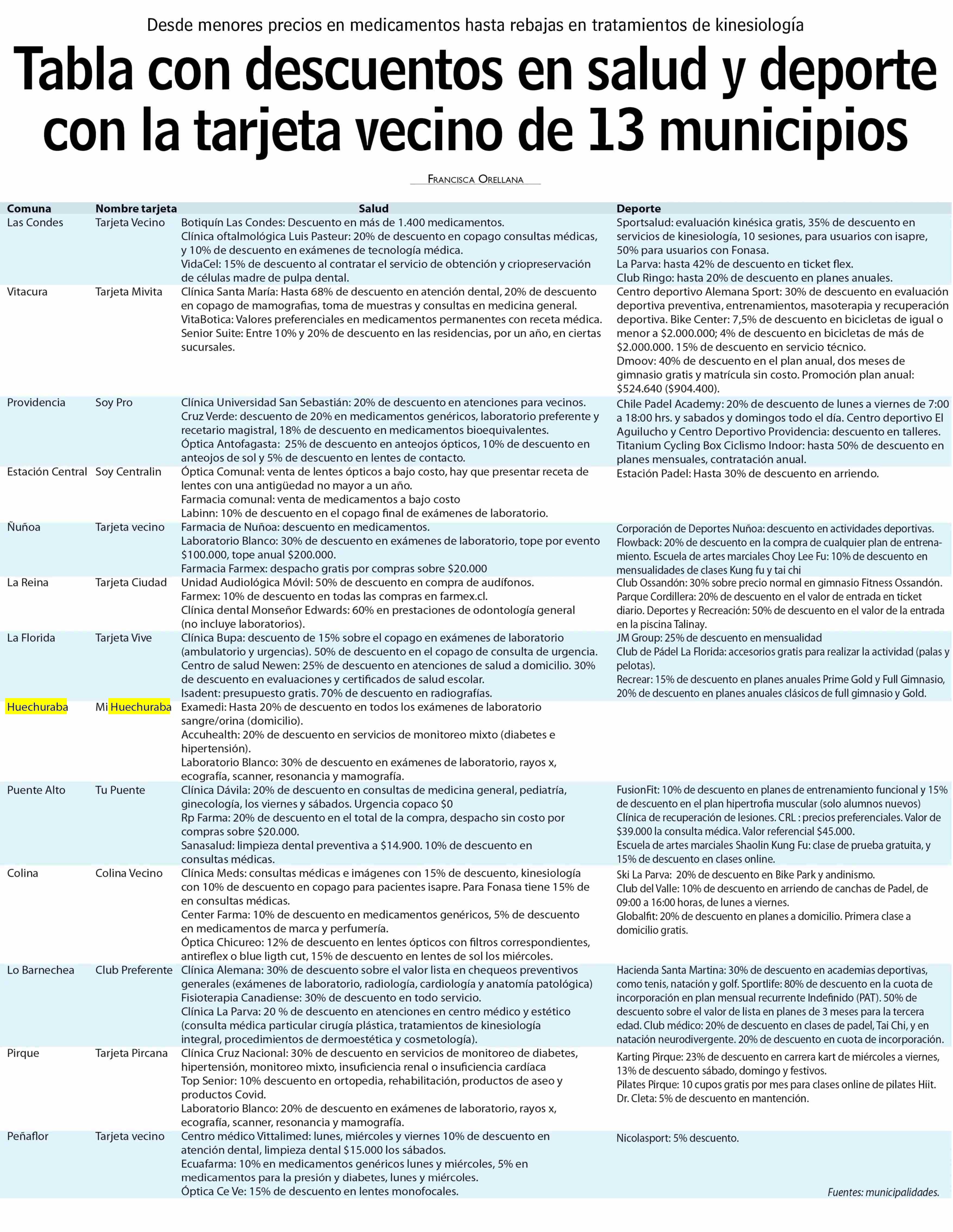Tabla con descuentos en salud y deporte con la tarjeta vecino de 13 municipios 15-06-2025 Las Últimas Noticias |