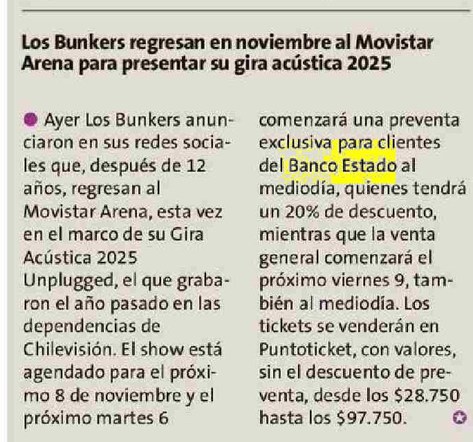 | Título: | Los Bunkers regresan en noviembre al Movistar Arena para presentar su gira acústica 2025 |