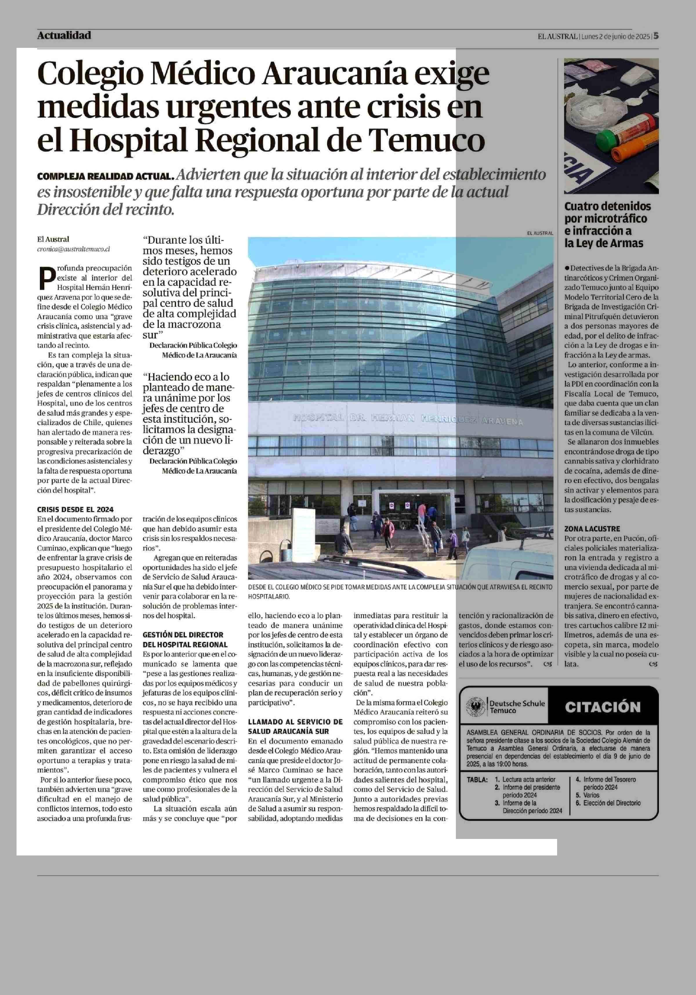 Colegio Médico Araucanía exige medidas urgentes ante crisis en el Hospital Regional de Temuco 02-06-2025 El Austral de la Araucanía |