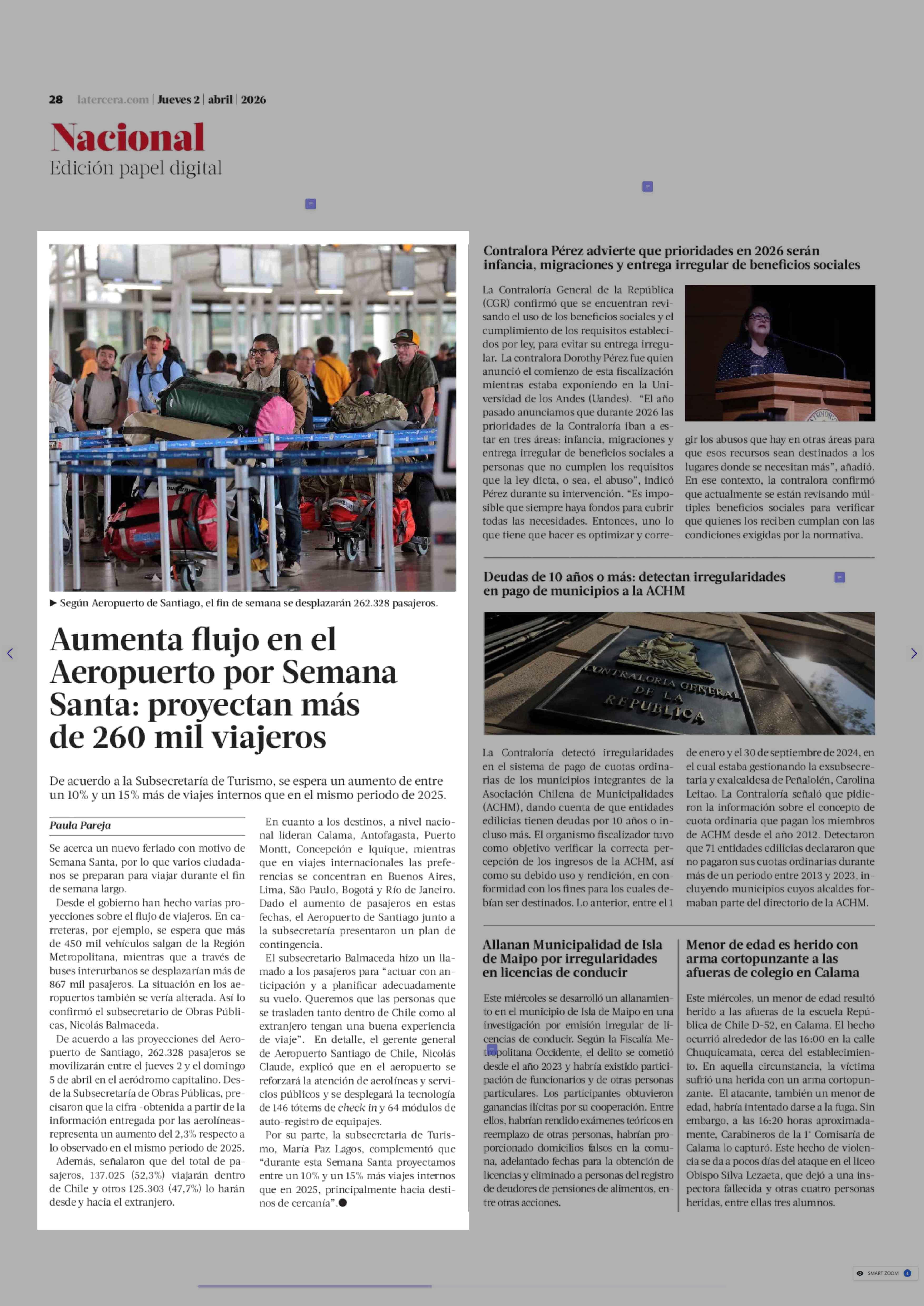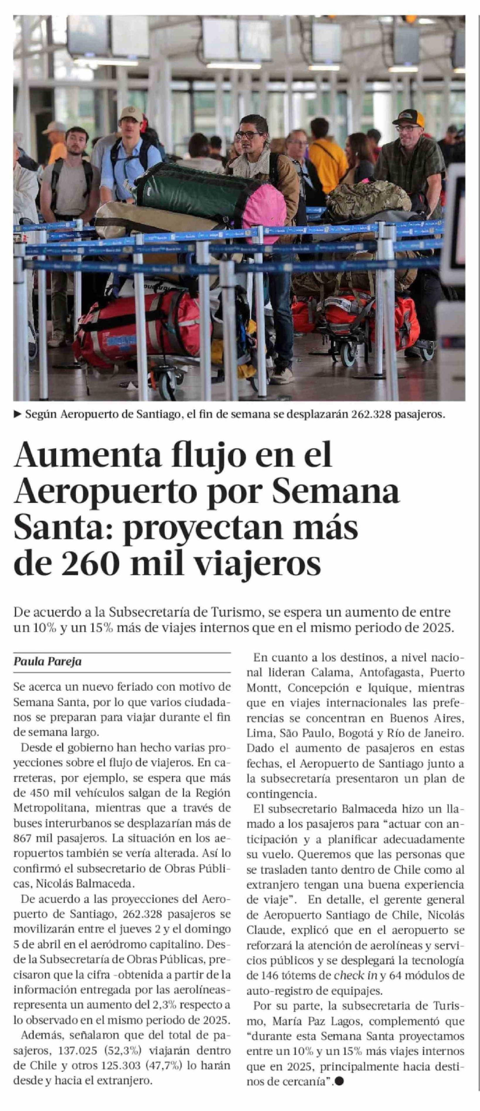 Aumenta flujo en el Aeropuerto por Semana Santa: proyectan más de 260 mil viajeros 02-04-2026 La Tercera |
