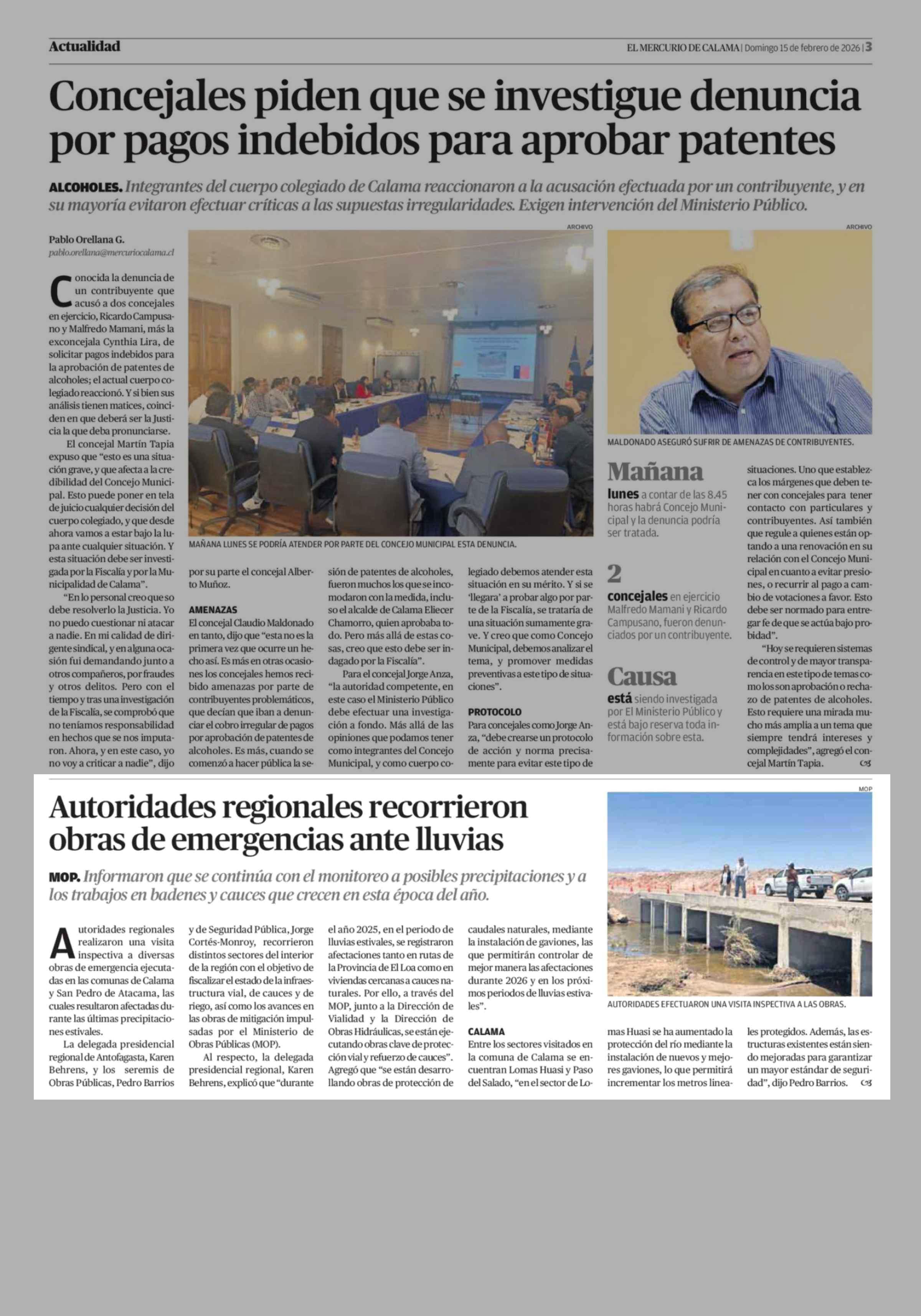 Autoridades regionales recorrieron obras de emergencias ante lluvias 15-02-2026 El Mercurio de Calama |