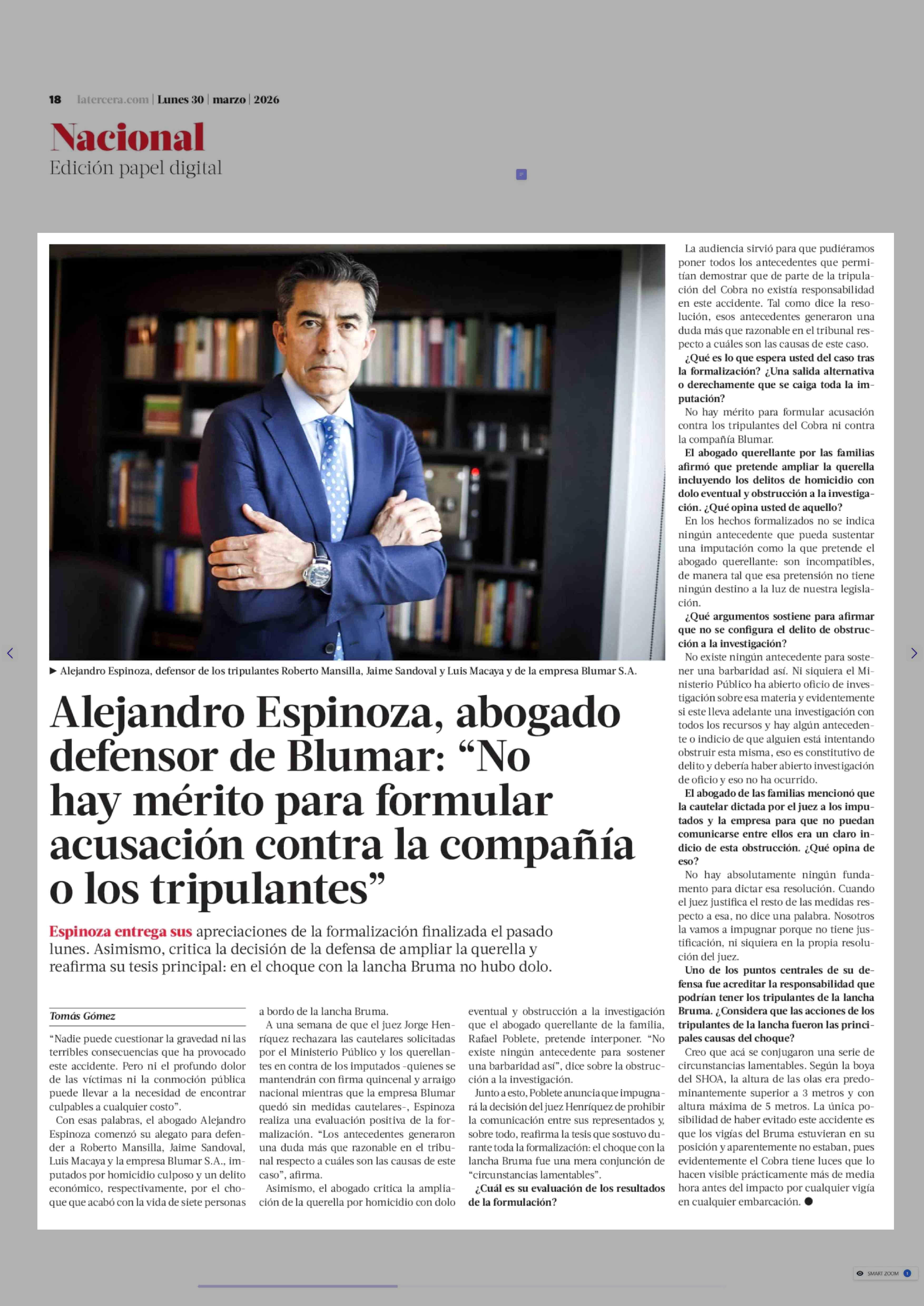 Alejandro Espinoza, abogado defensor de Blumar: "No hay mérito para formular acusación contra la compañía o los tripulantes" 30-03-2026 La Tercera |