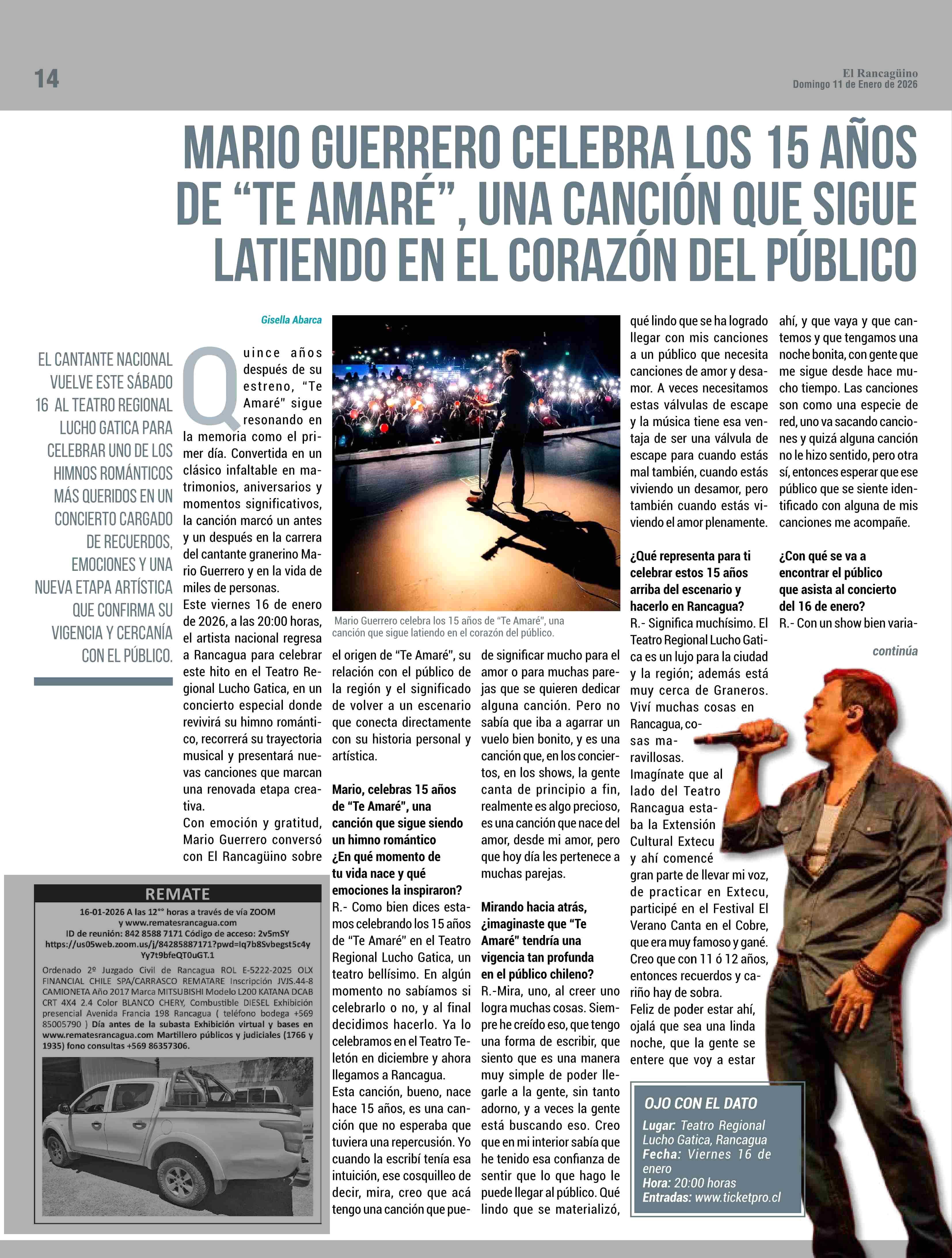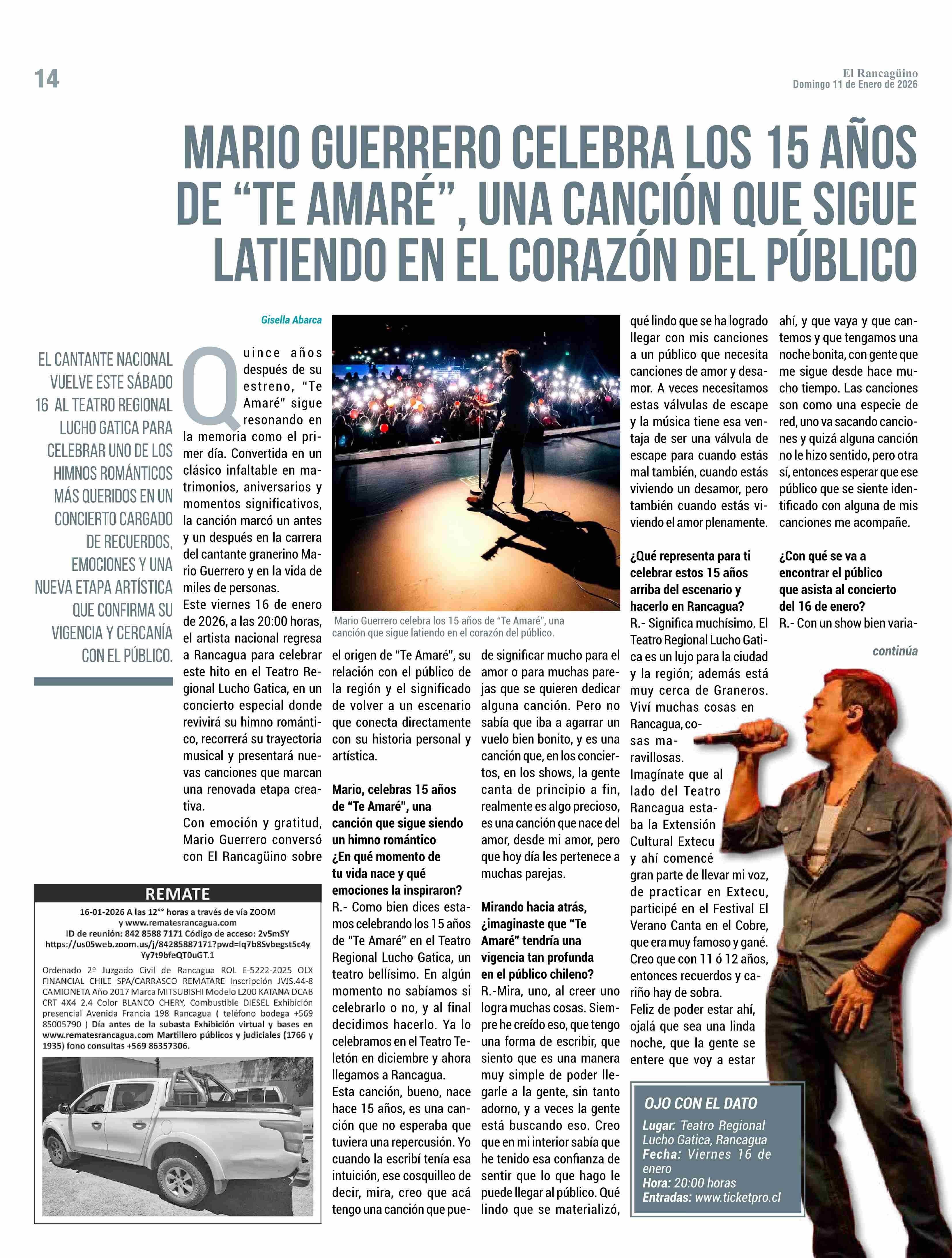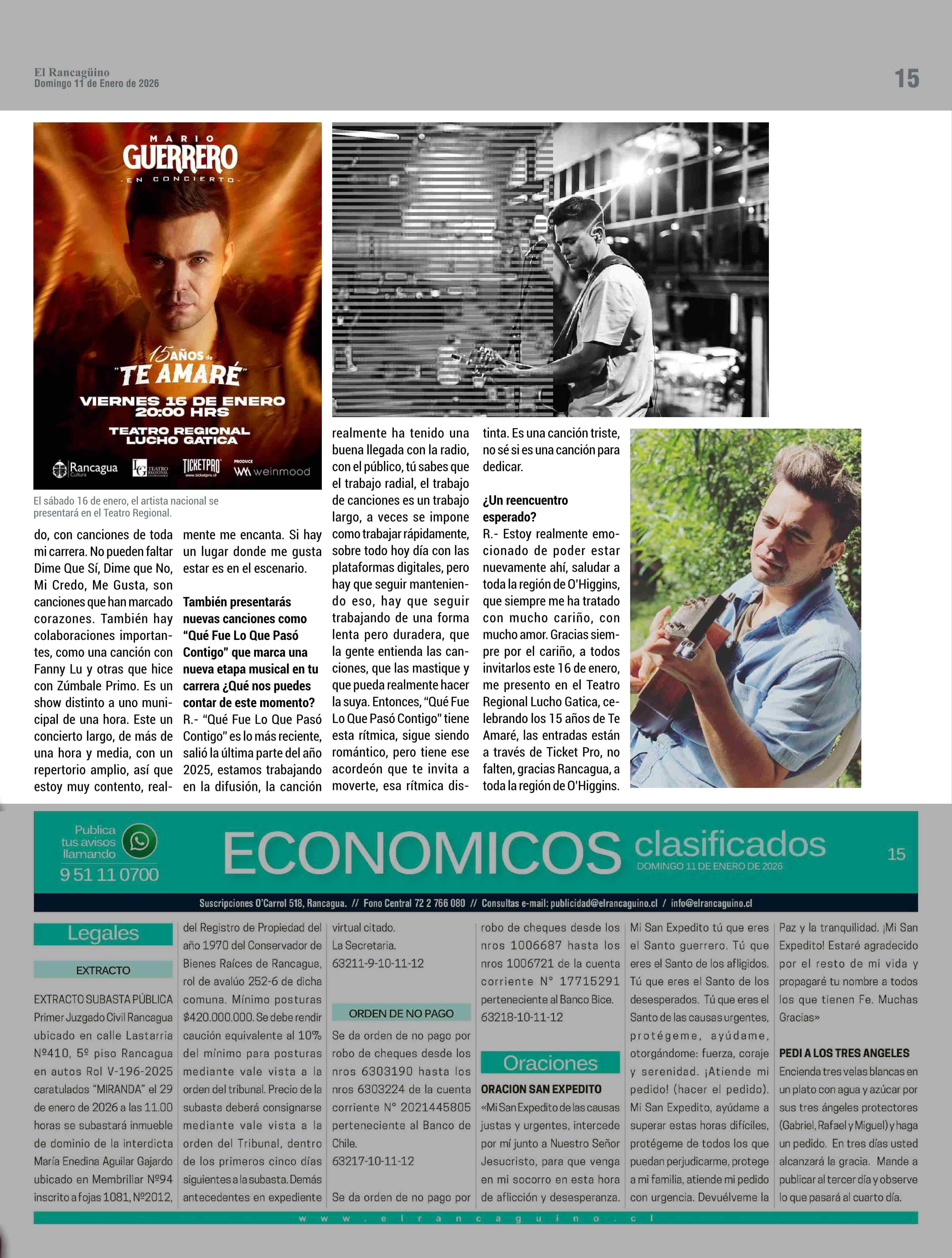 MARIO GUERRERO CELEBRA LOS 15 AÑOS DE “TE AMARÉ”, UNA CANCIÓN QUE SIGUE LATIENDO EN EL CORAZÓN DEL PÚBLICO 11-01-2026 El Rancagüino |