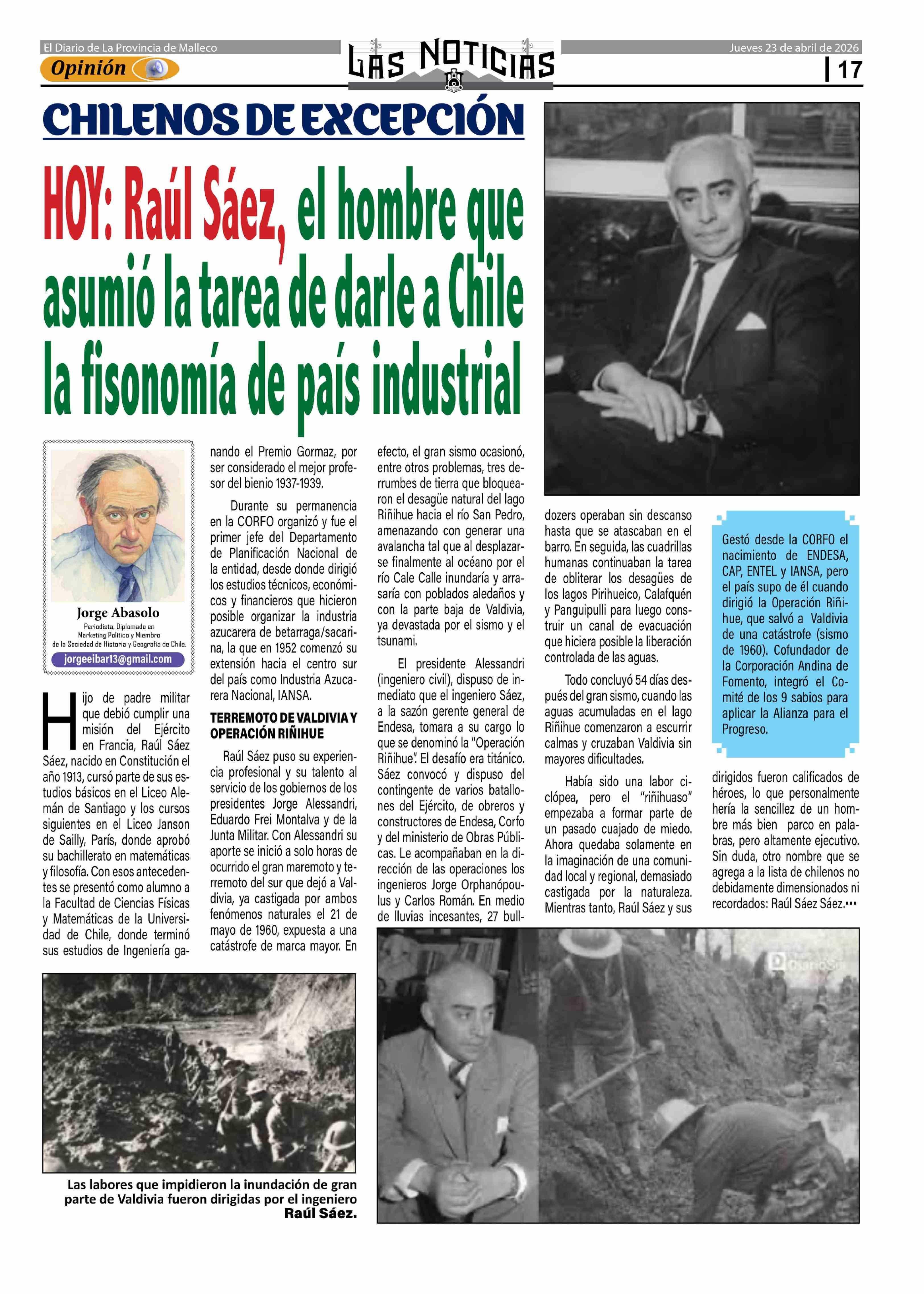 Columnas de Opinión: HOY: Raúl Sáez, el hombre que asumió la tarea de darle a Chile la fisonomía de país industrial 23-04-2026 Las Noticias |