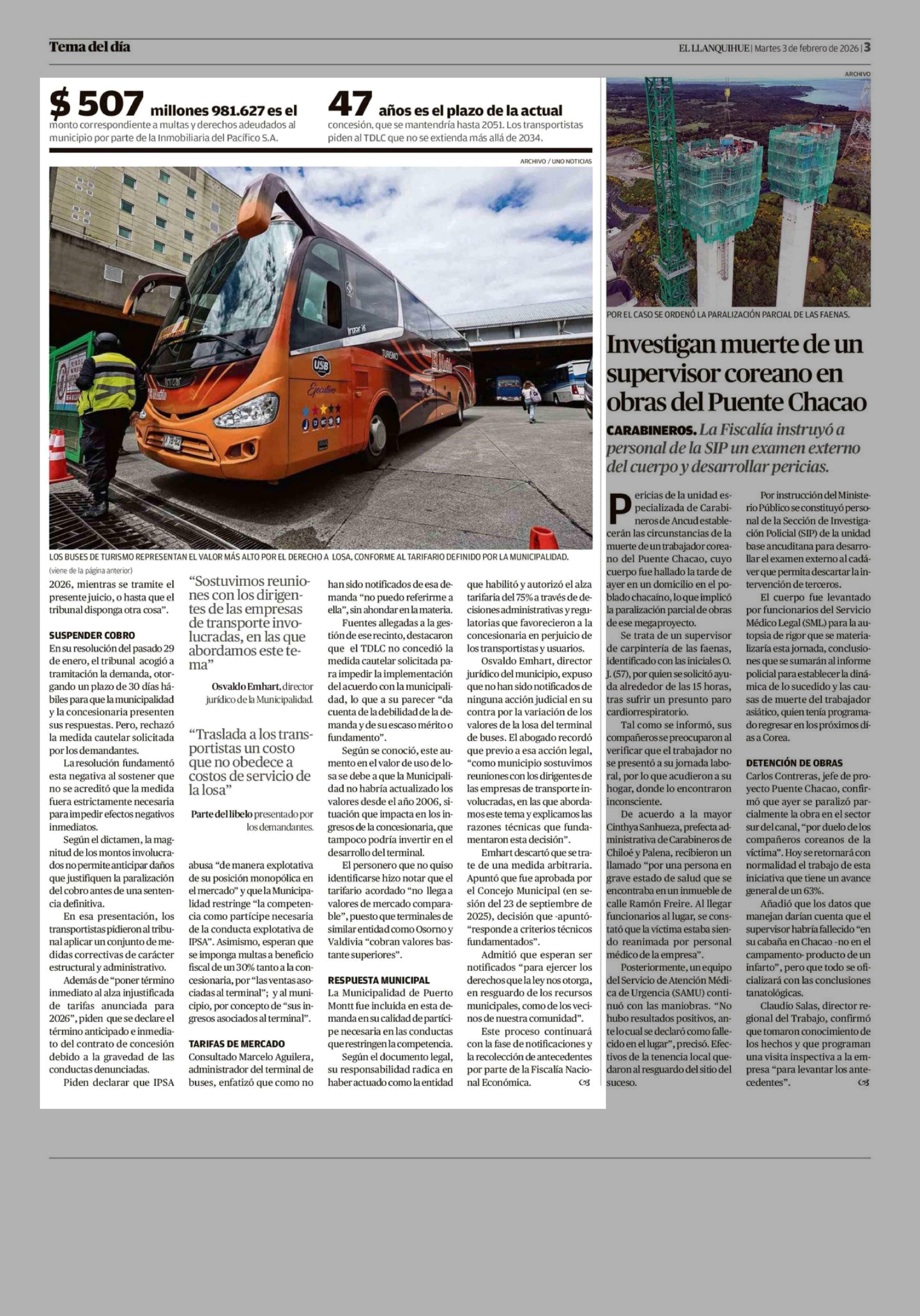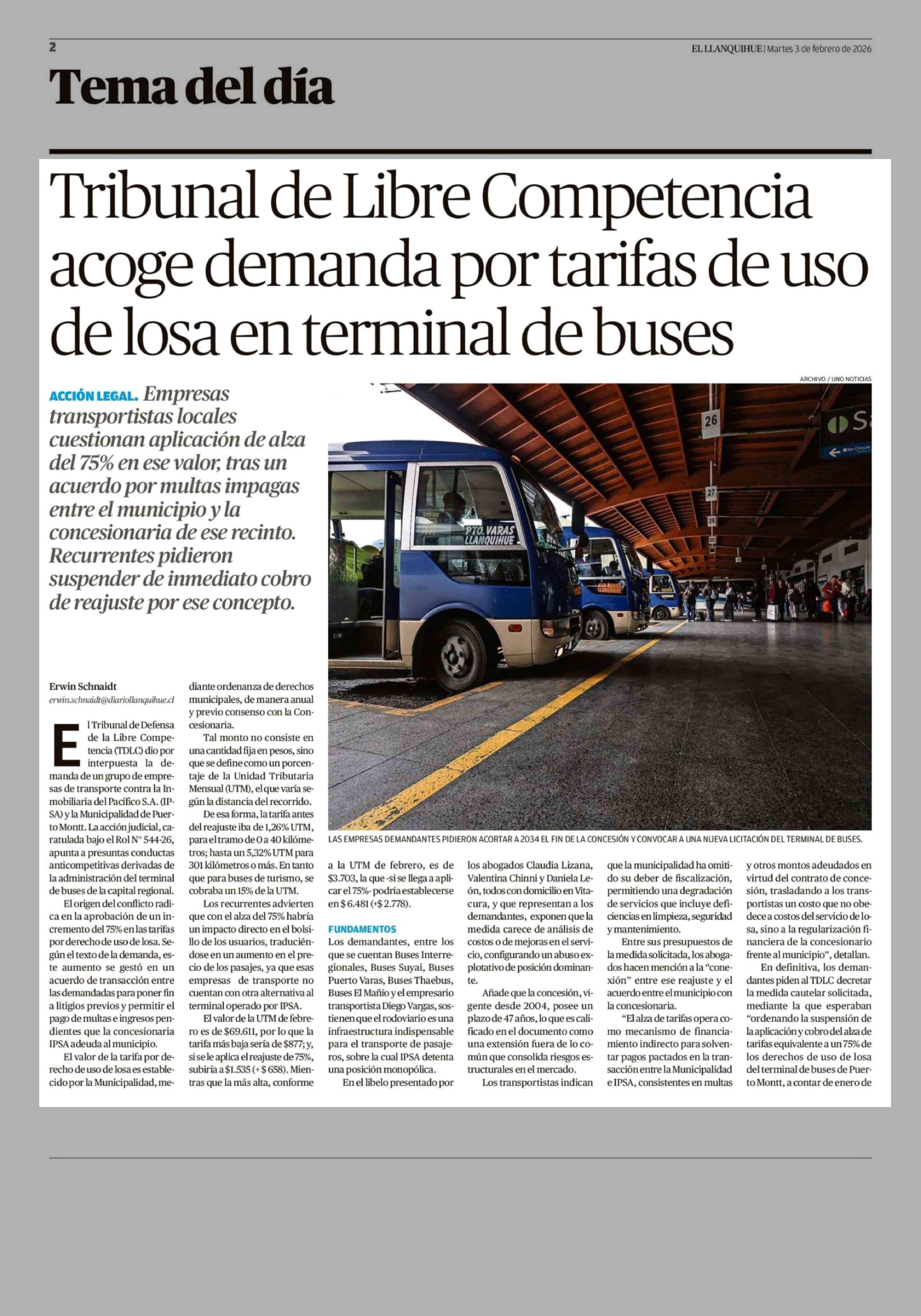 Tribunal de Libre Competencia acoge demanda por tarifas de uso de losa en terminal de buses 03-02-2026 El Llanquihue |