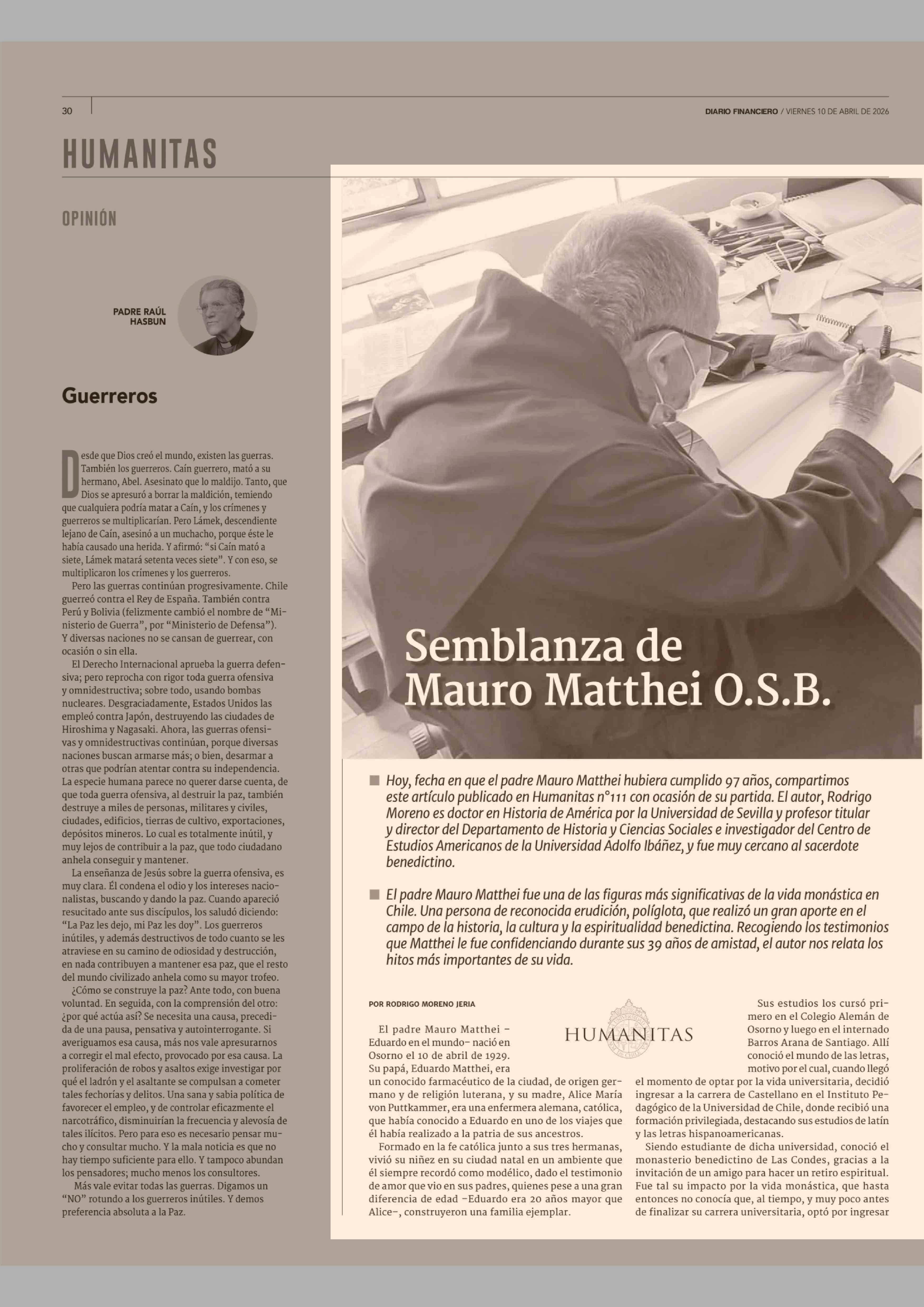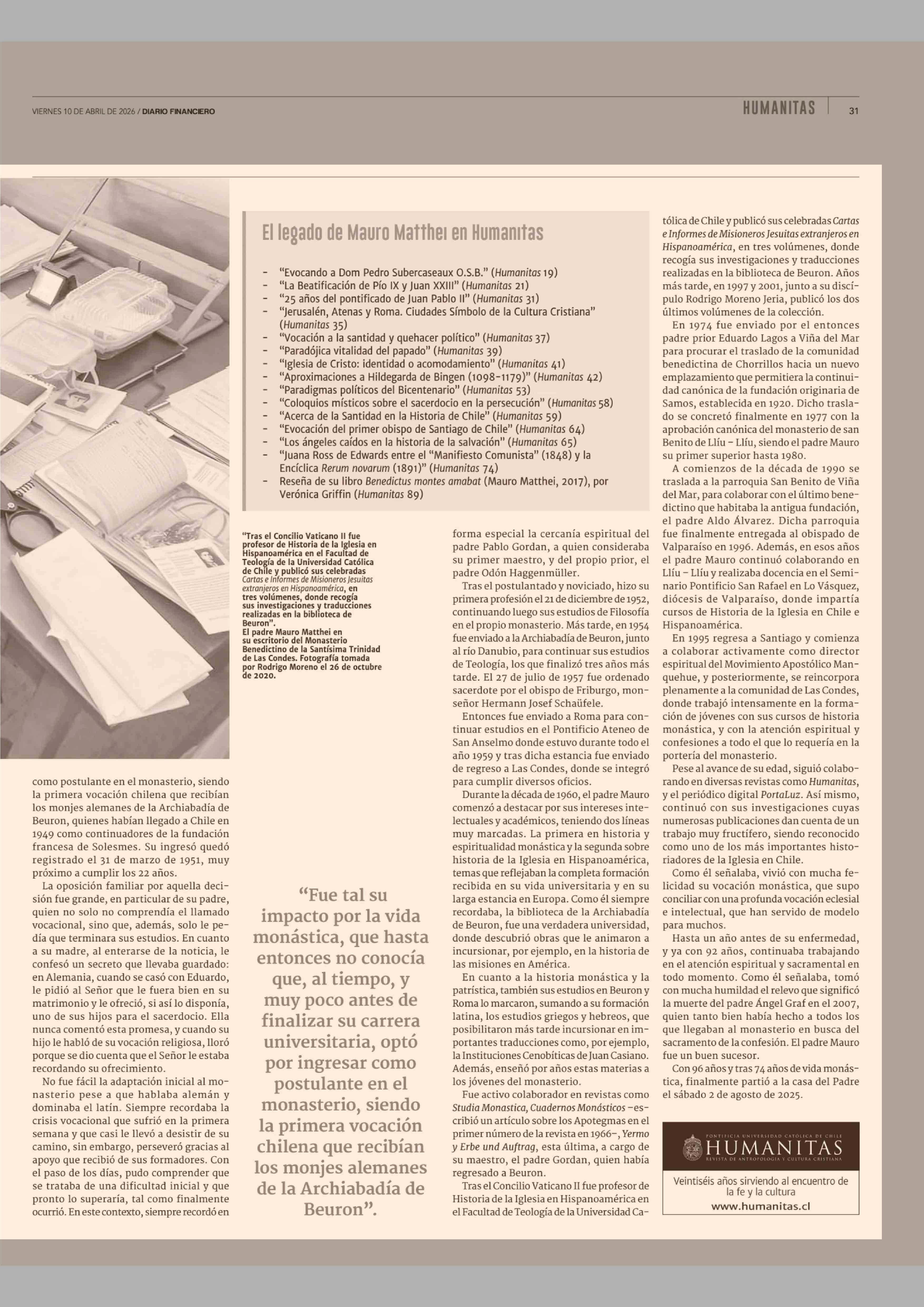 Semblanza de Mauro Matthei O.S.B. 10-04-2026 Diario Financiero |