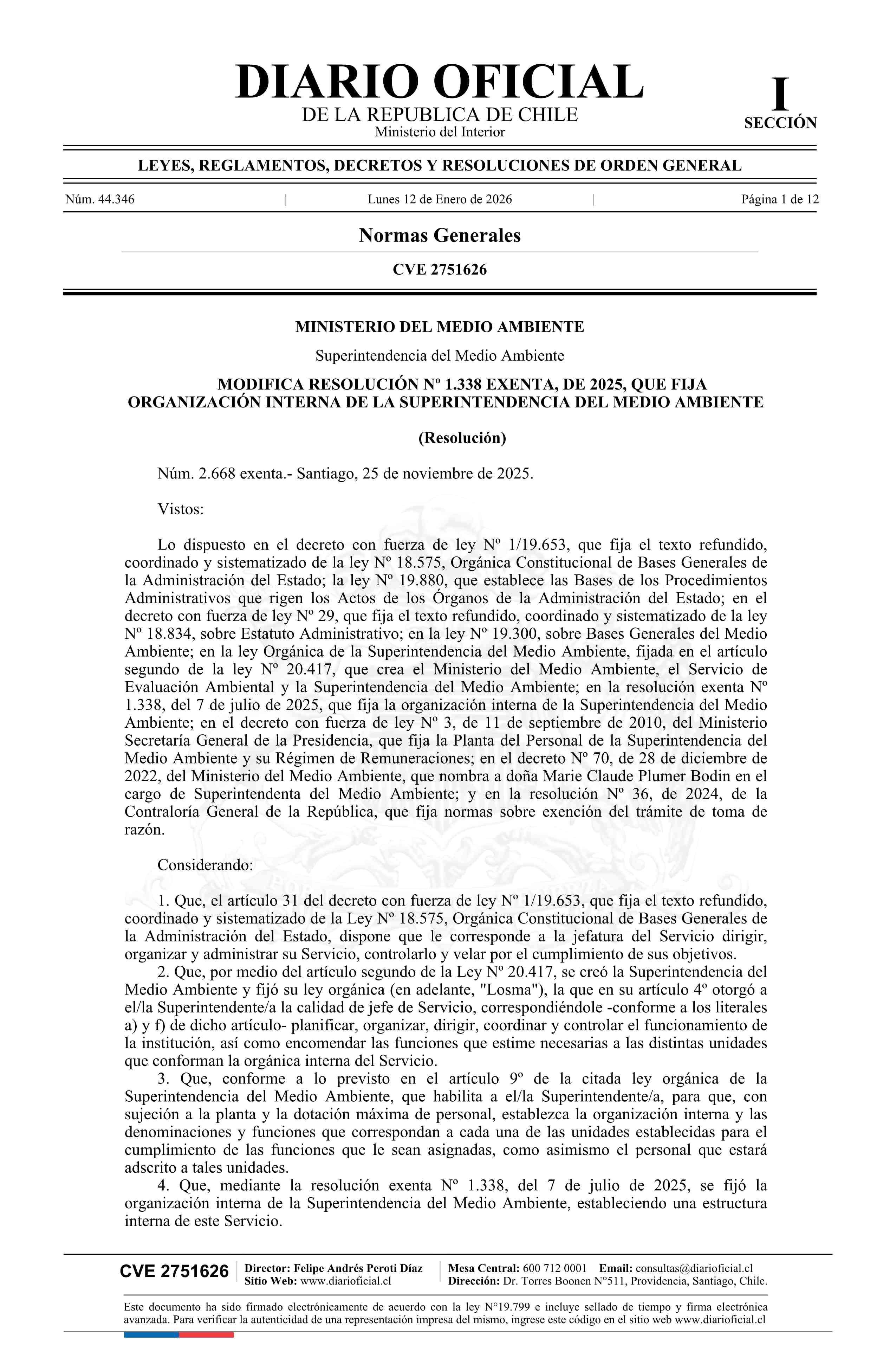 Título: Resolución exenta número 2.668, de 2025.- Modifica resolución Nº 1.338 exenta, de 2025, que fija organización interna de la Superintendencia del Medio Ambiente