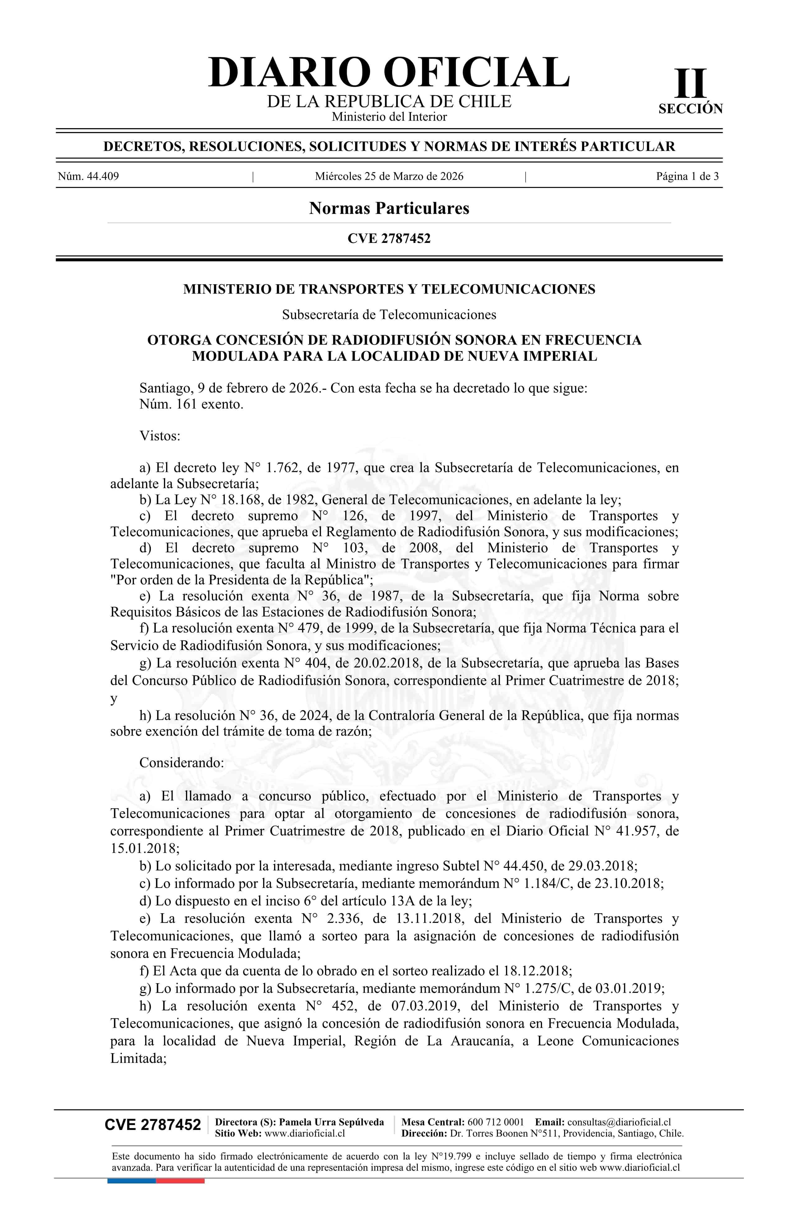 Decreto exento número 161, de 2026.- Otorga concesión de radiodifusión sonora en frecuencia modulada para la localidad de Nueva Imperial 25-03-2026 Diario Oficial Edición Electrónica |