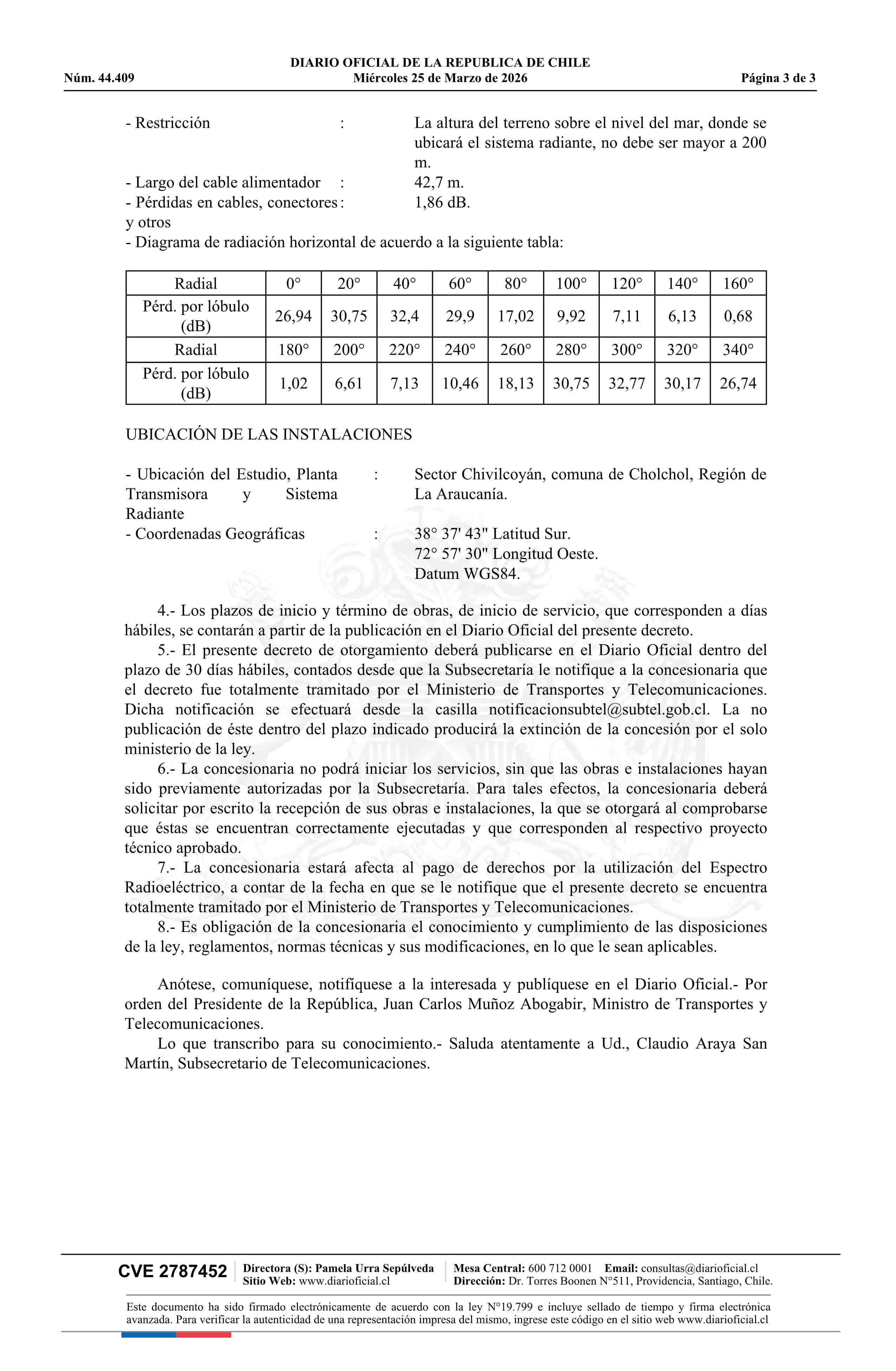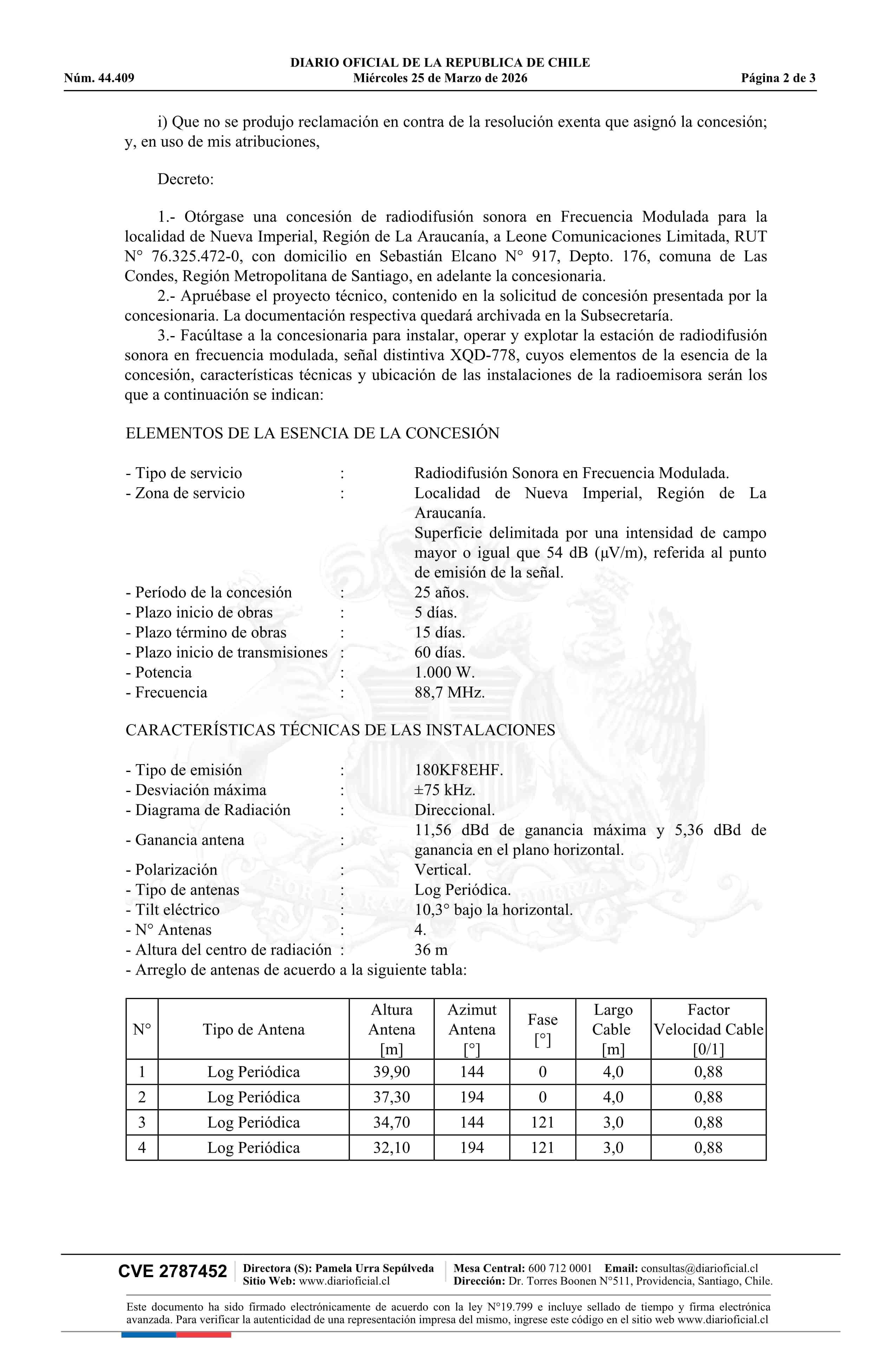 | Título: | Decreto exento número 161, de 2026.- Otorga concesión de radiodifusión sonora en frecuencia modulada para la localidad de Nueva Imperial |