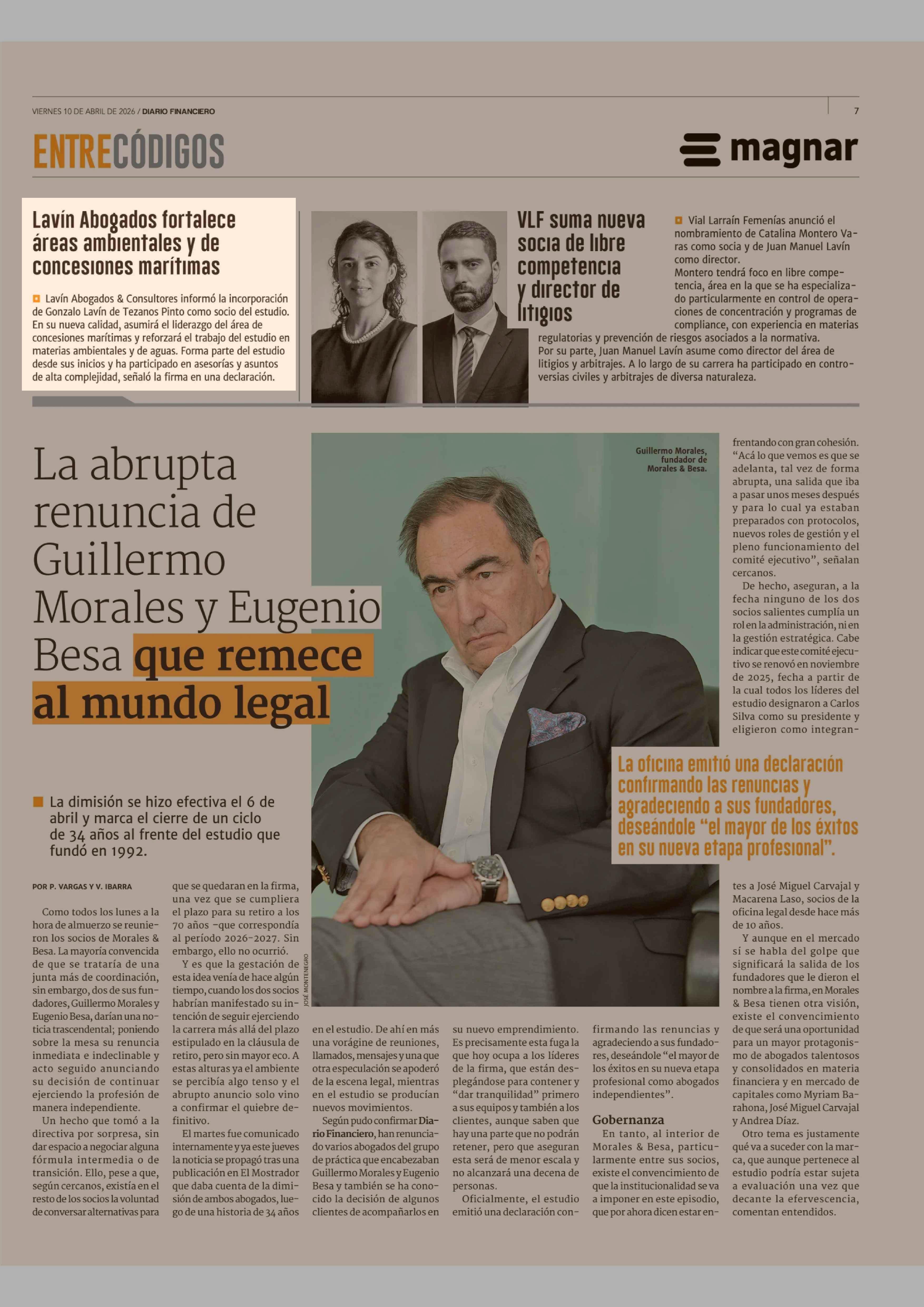 Lavín Abogados fortalece áreas ambientales y de concesiones marítimas 10-04-2026 Diario Financiero |