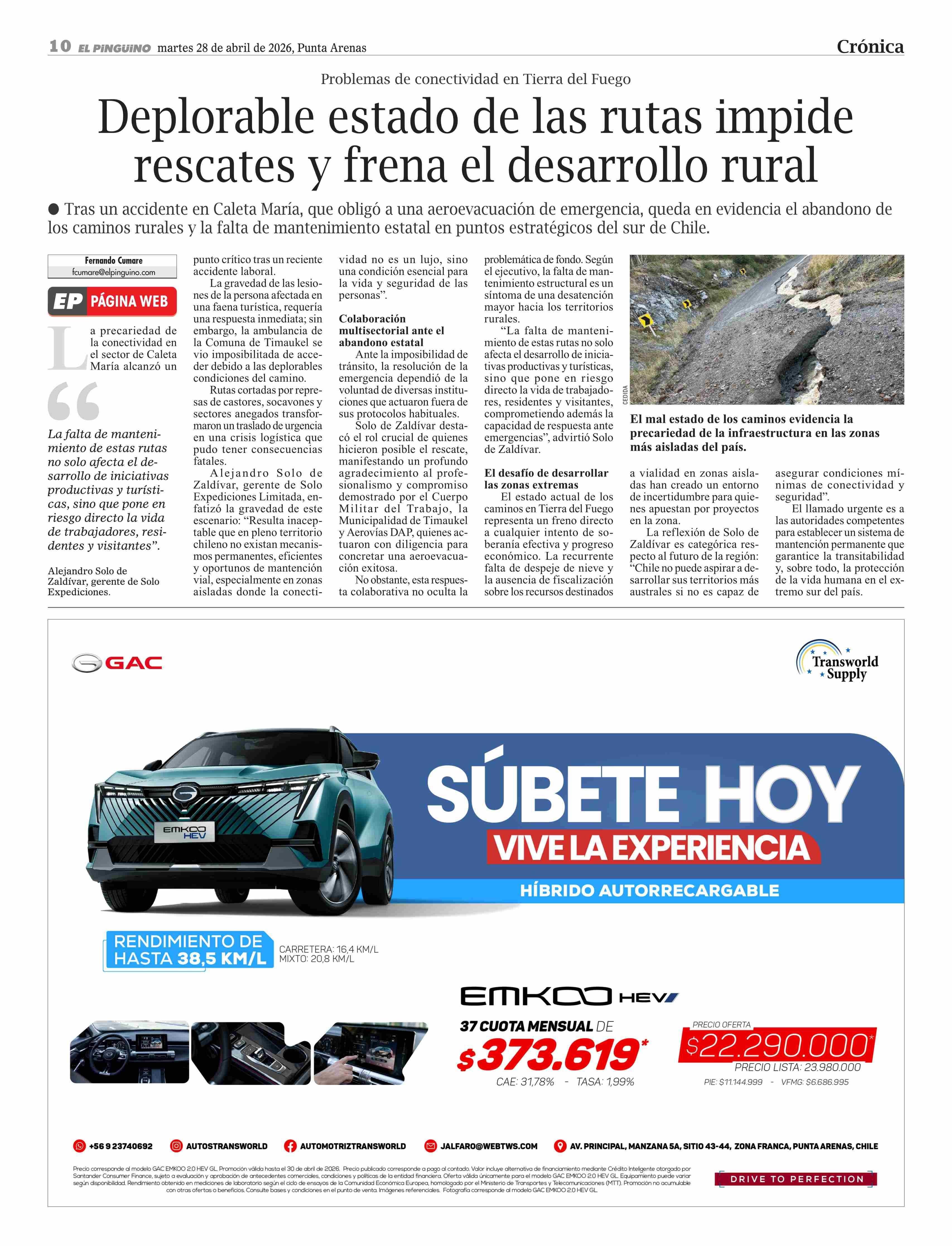 Deplorable estado de las rutas impide rescates y frena el desarrollo rural 28-04-2026 El Pingüino |