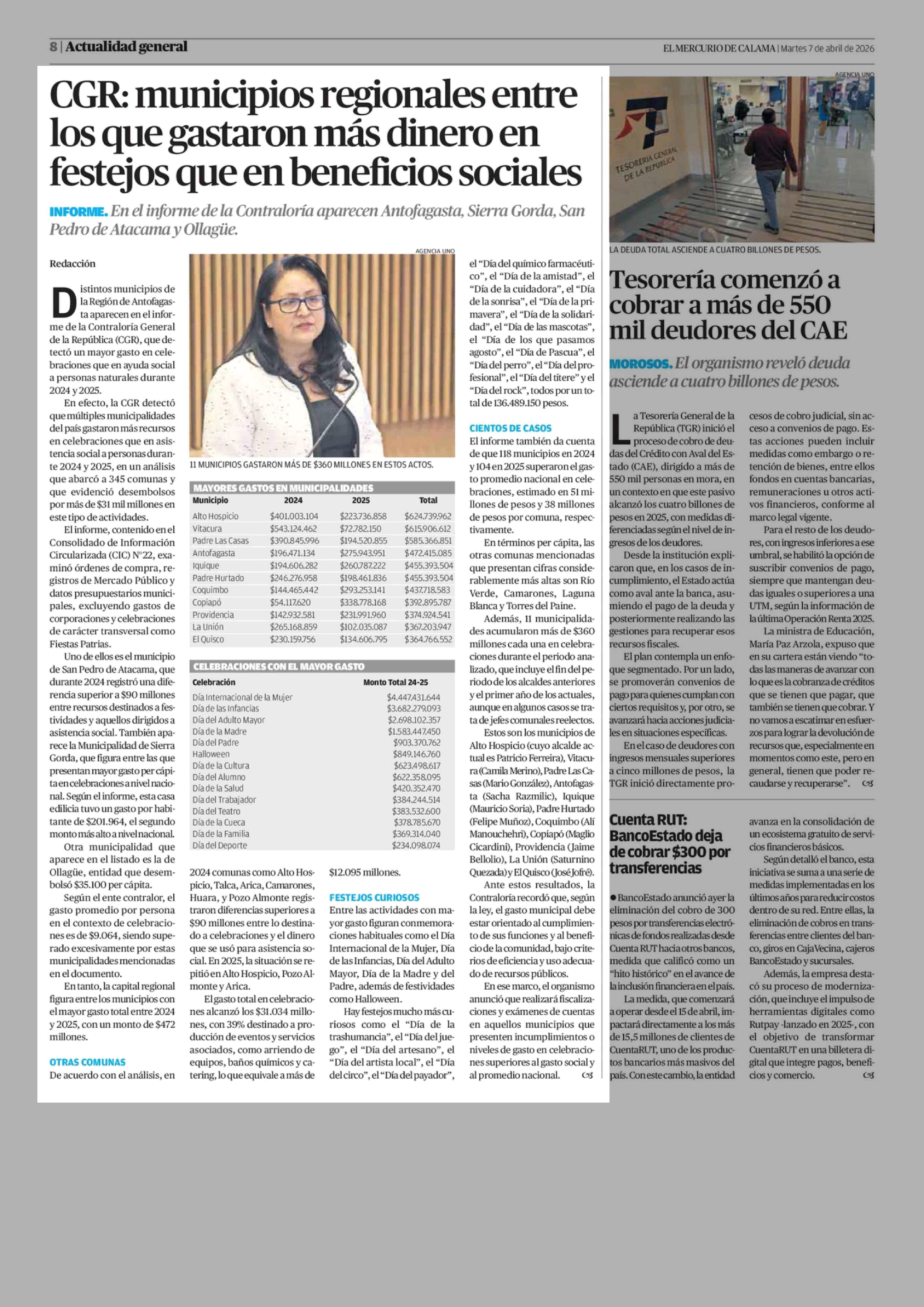 CGR: municipios regionales entre los que gastaron más dinero en festejos que en beneficios sociales 07-04-2026 El Mercurio de Calama |