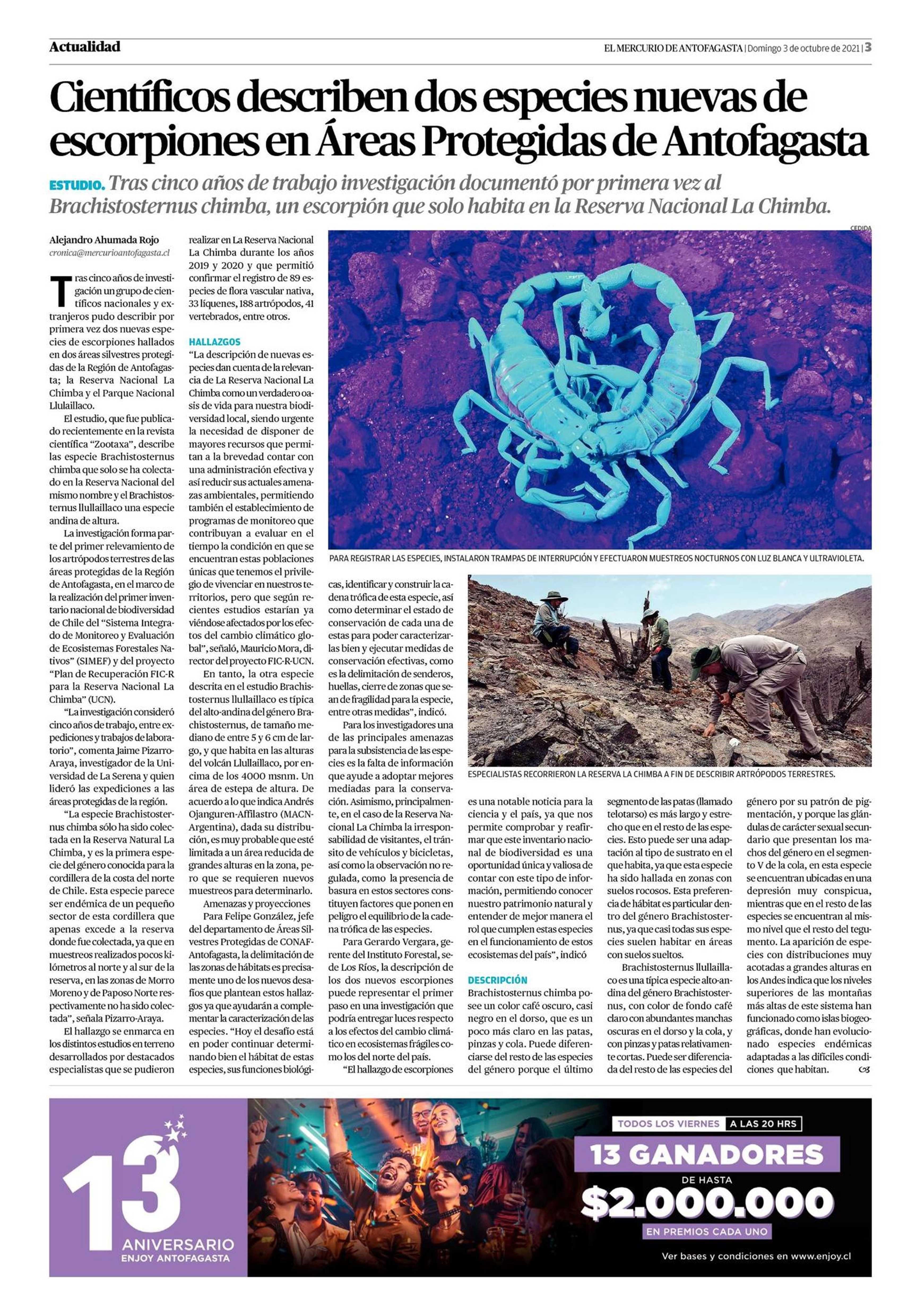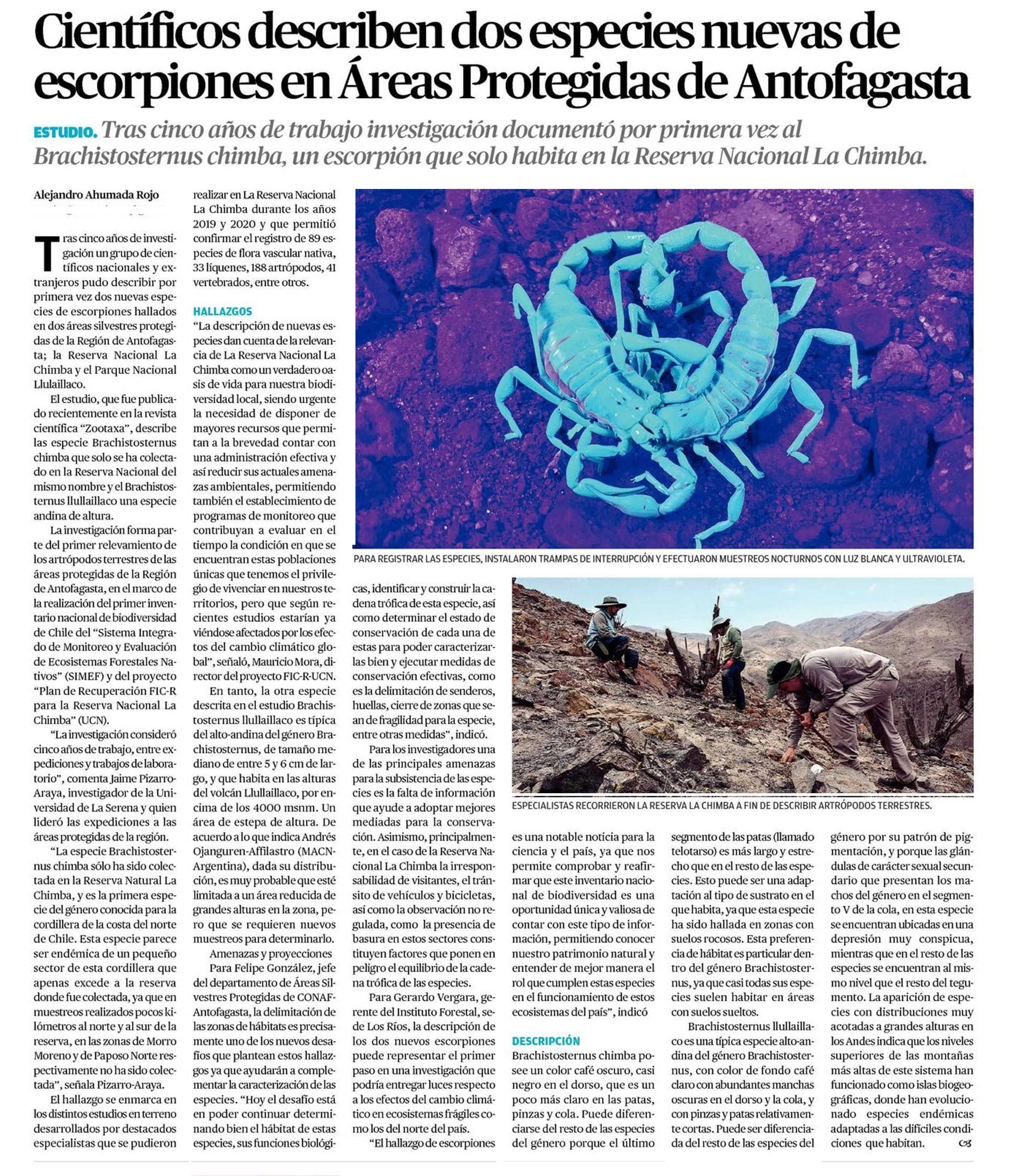Científicos describen dos especies nuevas de escorpiones en Áreas Protegidas de Antofagasta 03-10-2021 El Mercurio de Antofagasta |