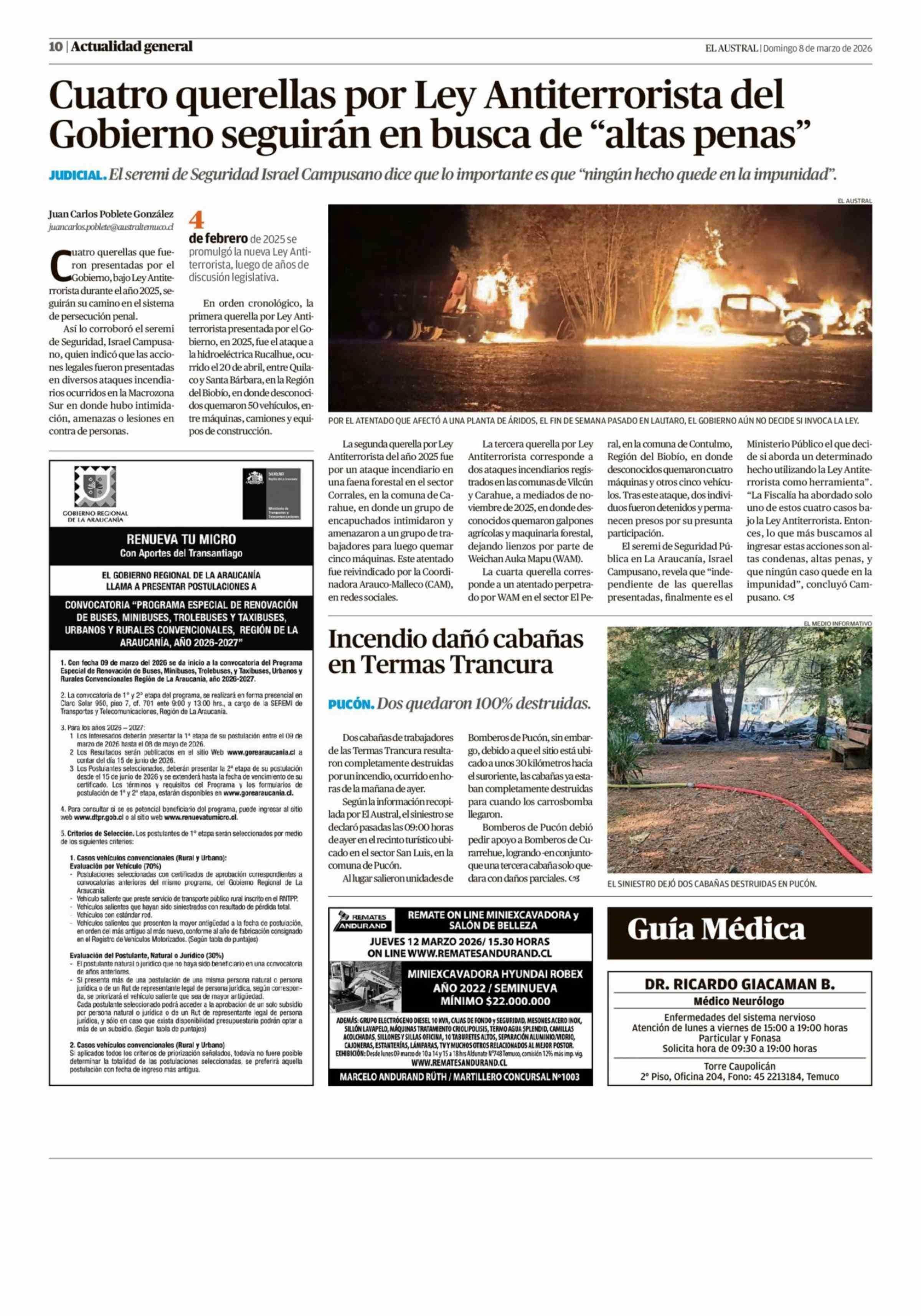 Cuatro querellas por Ley Antiterrorista del Gobierno seguirán en busca de "altas penas" 08-03-2026 El Austral de la Araucanía |