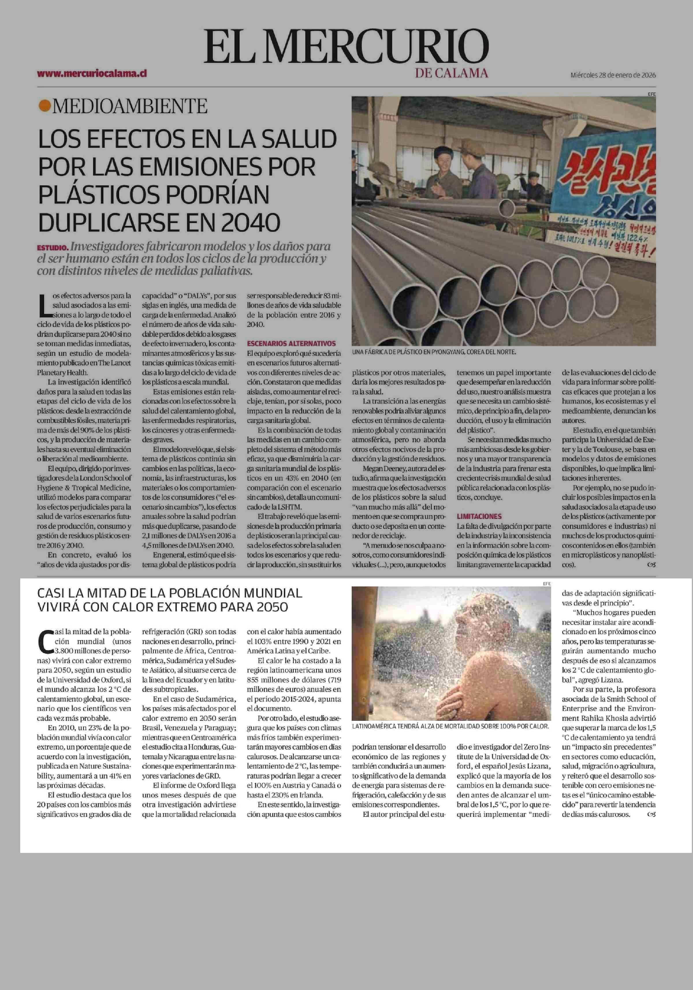 CASI LA MITAD DE LA POBLACIÓN MUNDIAL VIVIRÁ CON CALOR EXTREMO PARA 2050 28-01-2026 El Mercurio de Calama |