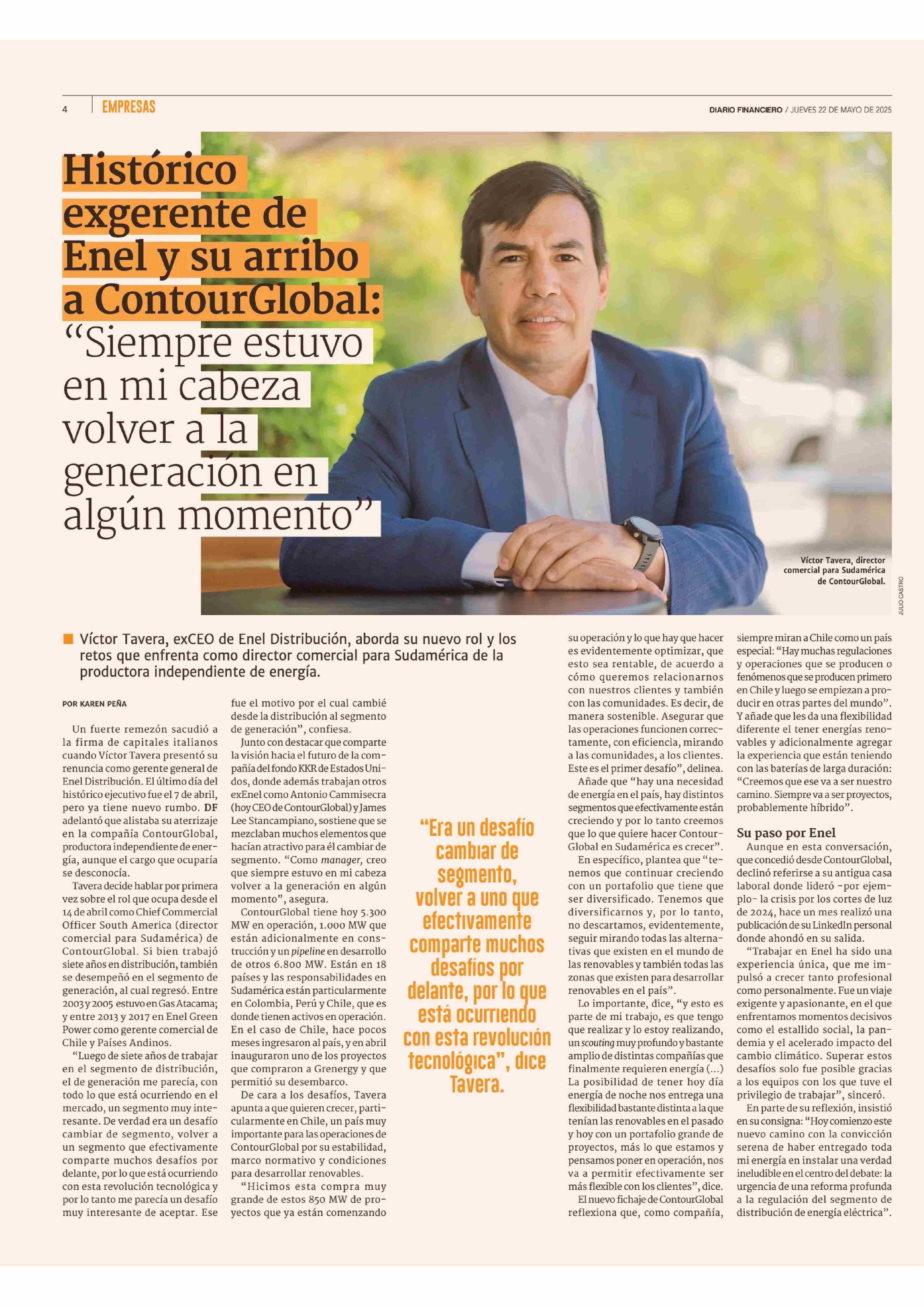 Histórico exgerente de Enel y su arribo a ContourGlobal: “Siempre estuvo. en mi cabeza volver a la generación en algún momento" 22-05-2025 Diario Financiero |