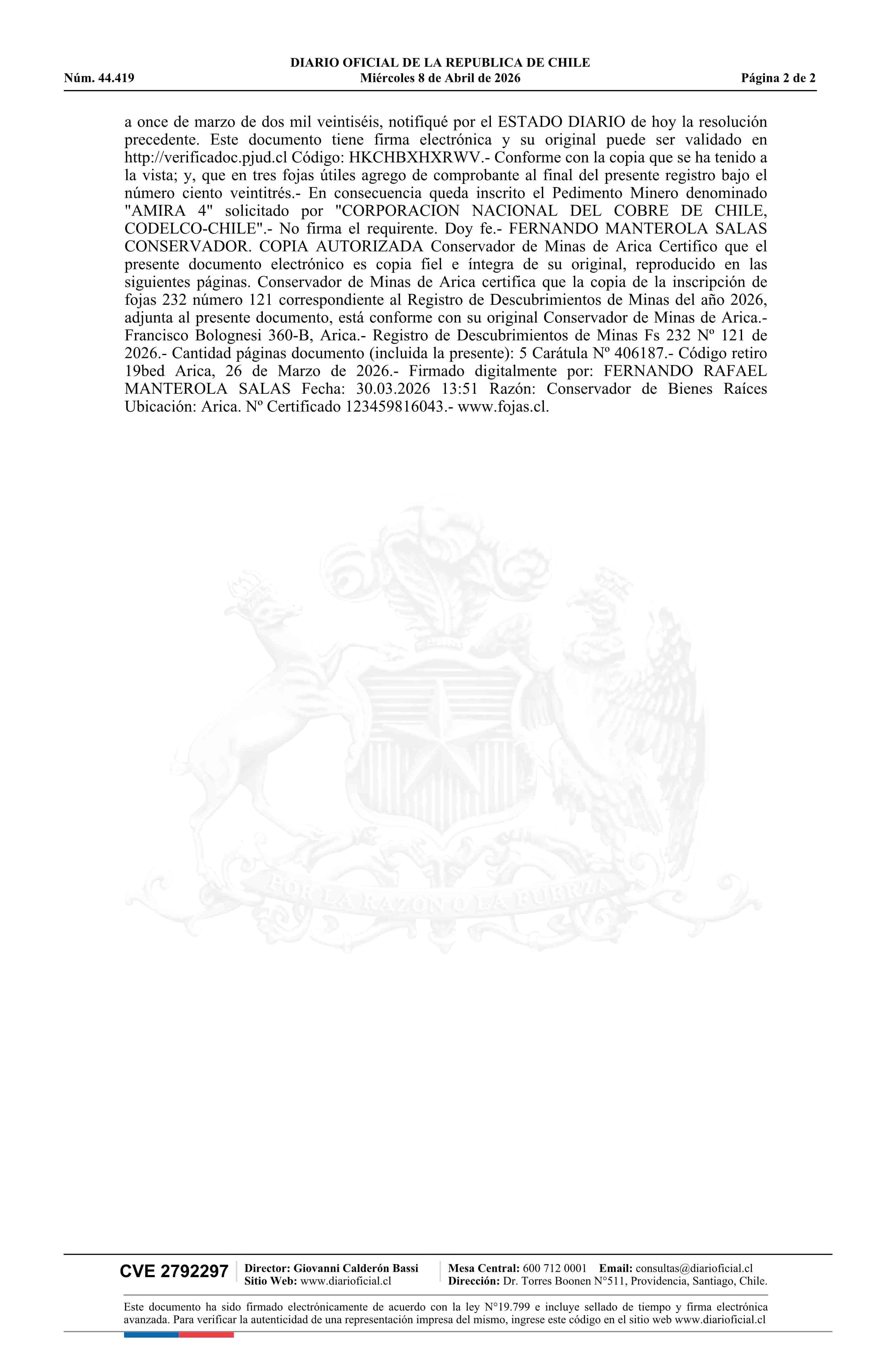 AMIRA 4 / Corporación Nacional del Cobre de Chile 08-04-2026 DIARIO OFICIAL CHILE - BOLETÍN OFICIAL DE MINERÍA |