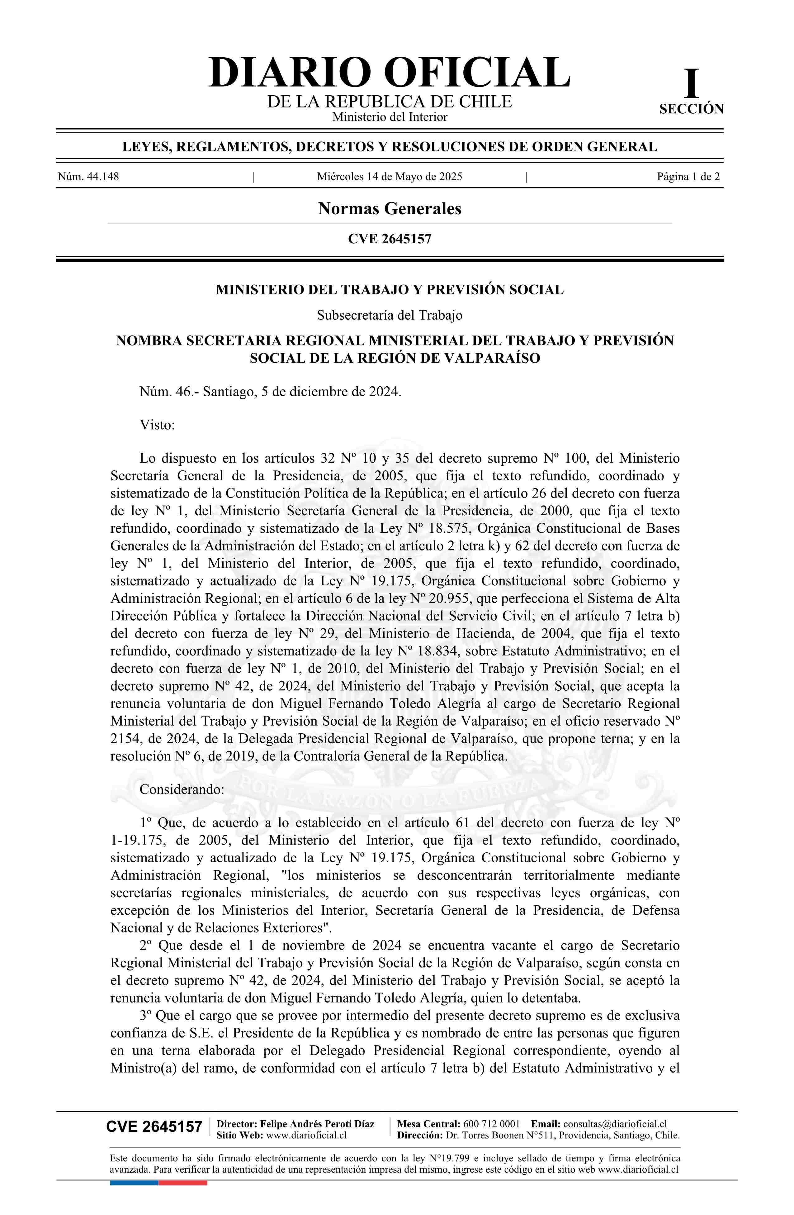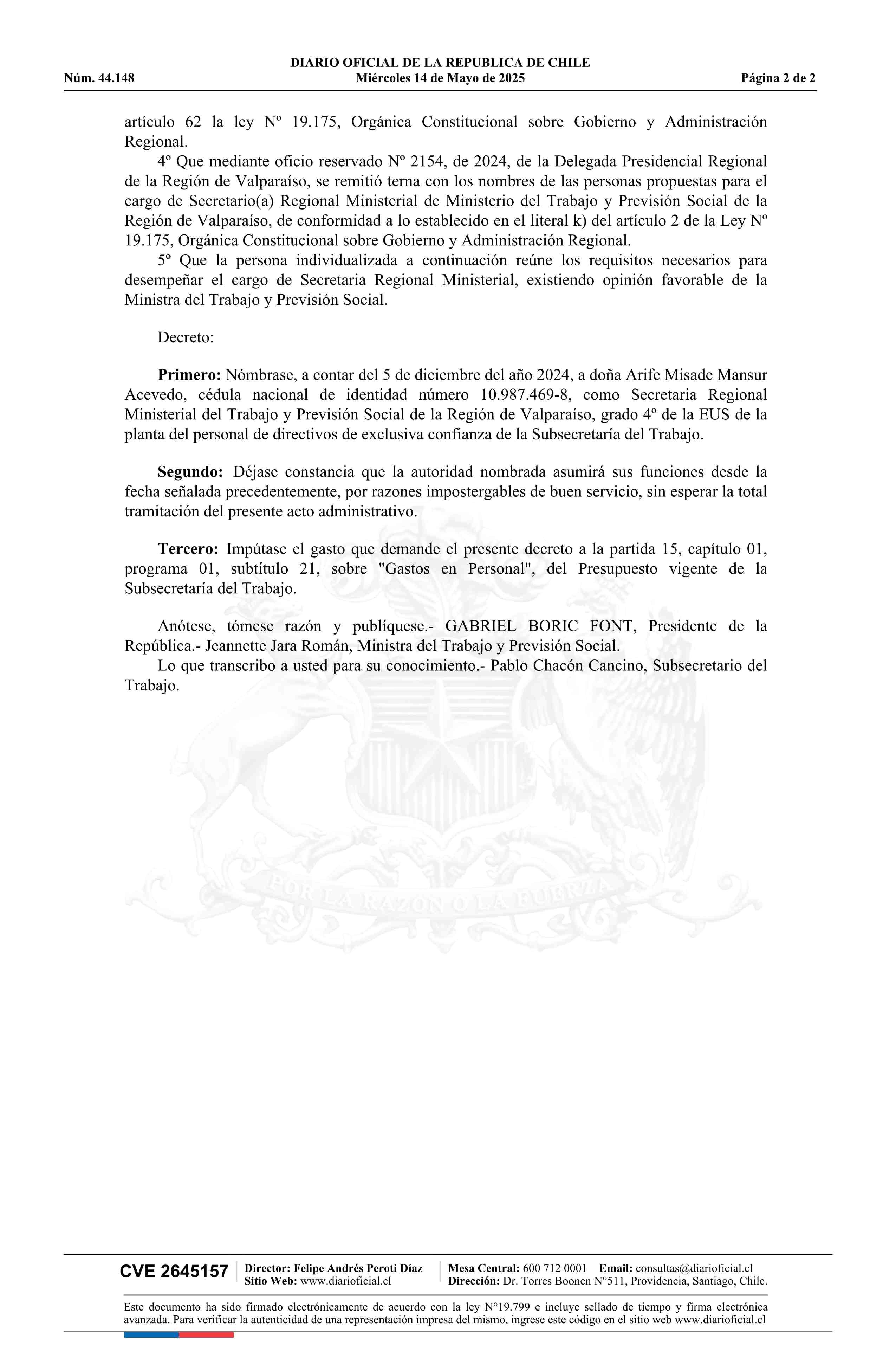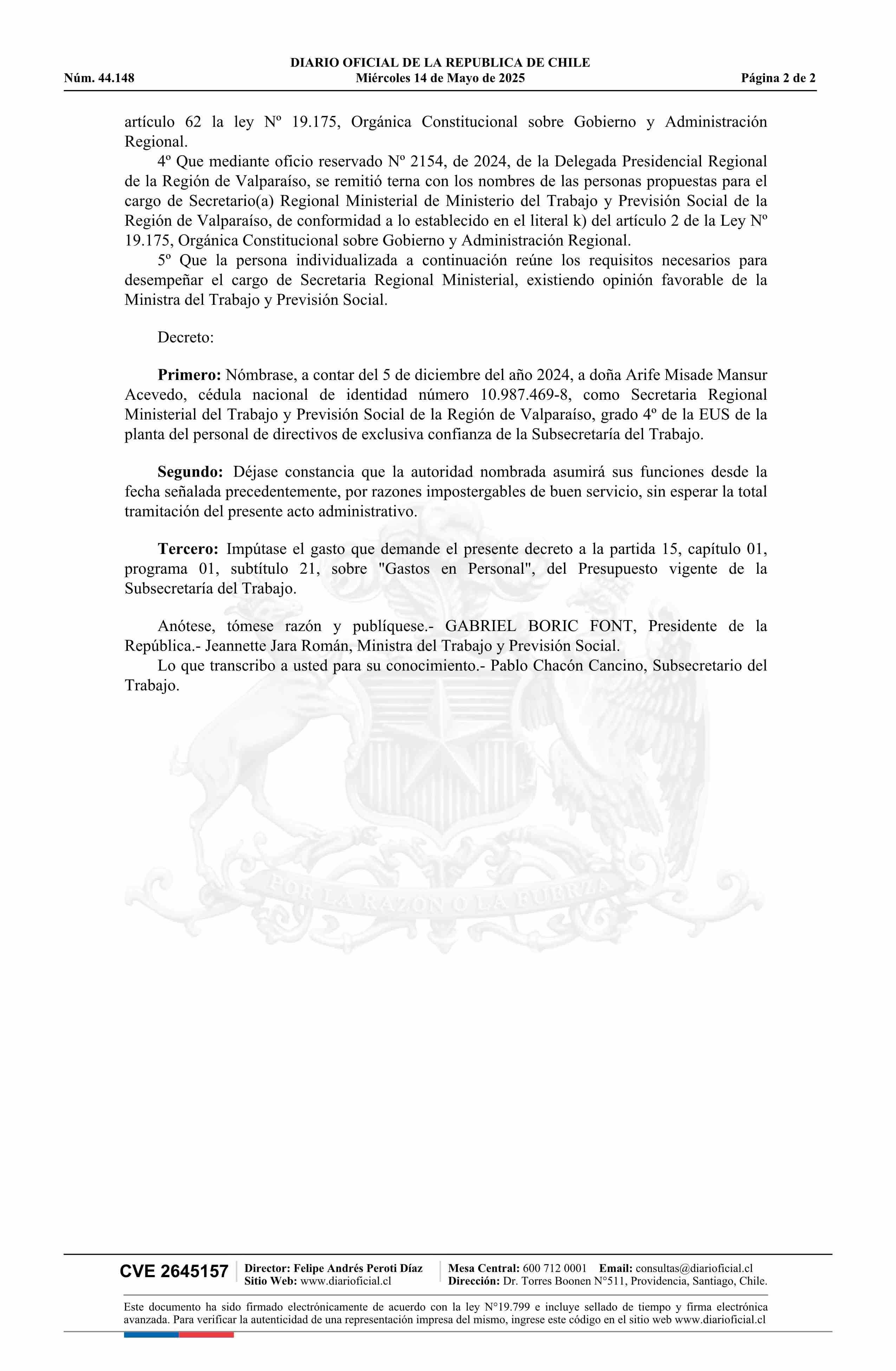 Decreto número 46, de 2024.- Nombra a doña Arife Misade Mansur Acevedo como Secretaria Regional Ministerial del Trabajo y Previsión Social de la Región de Valparaíso 14-05-2025 Diario Oficial Edición Electrónica |