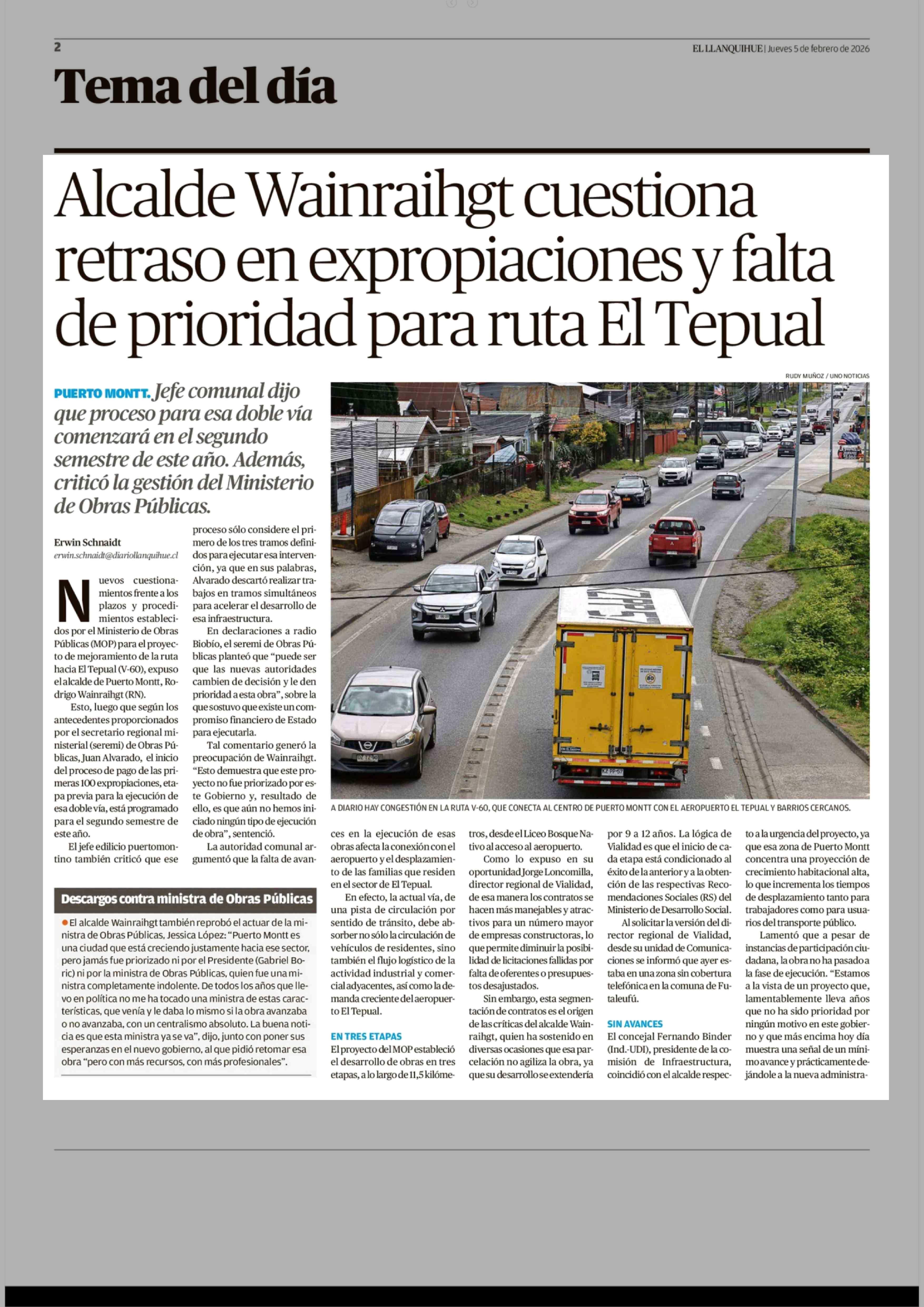 Título: Alcalde Wainraihgt cuestiona retraso en expropiaciones y falta de prioridad para ruta El Tepual