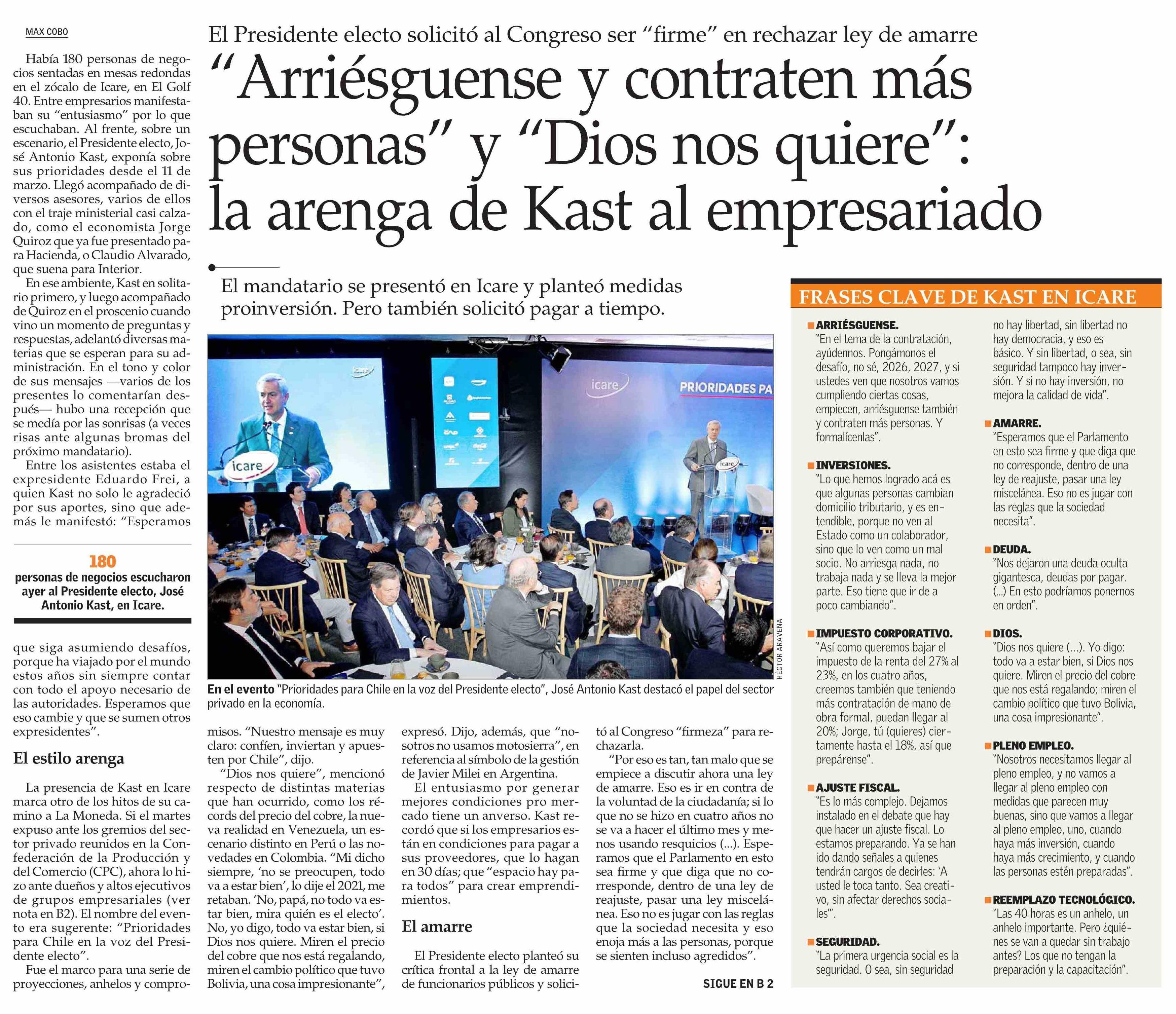Título: “Arriésguense y contraten más personas” y “Dios nos quiere”: la arenga de Kast al empresariado