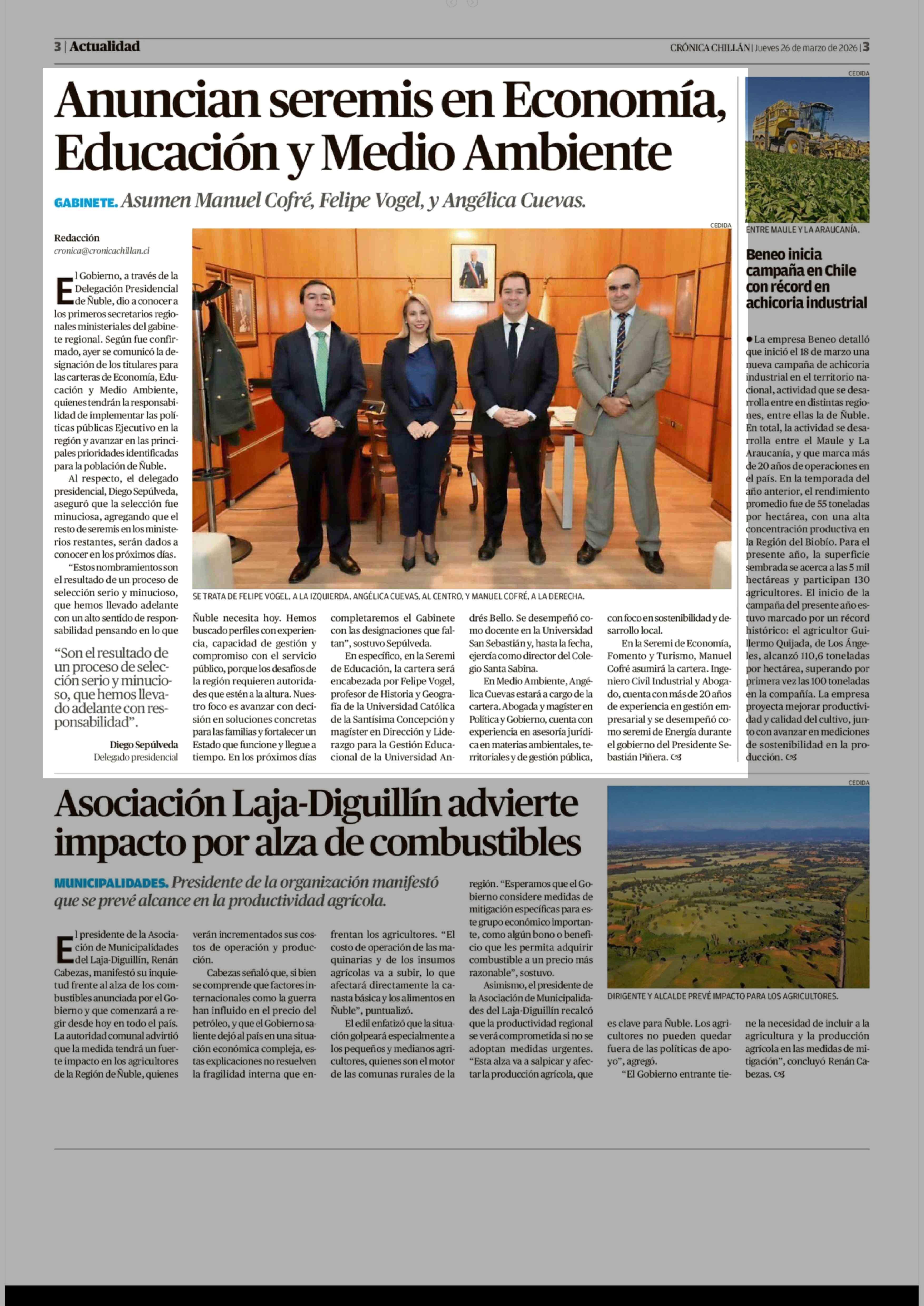 Anuncian seremis en Economía, Educación y Medio Ambiente 26-03-2026 Crónica de Chillán |