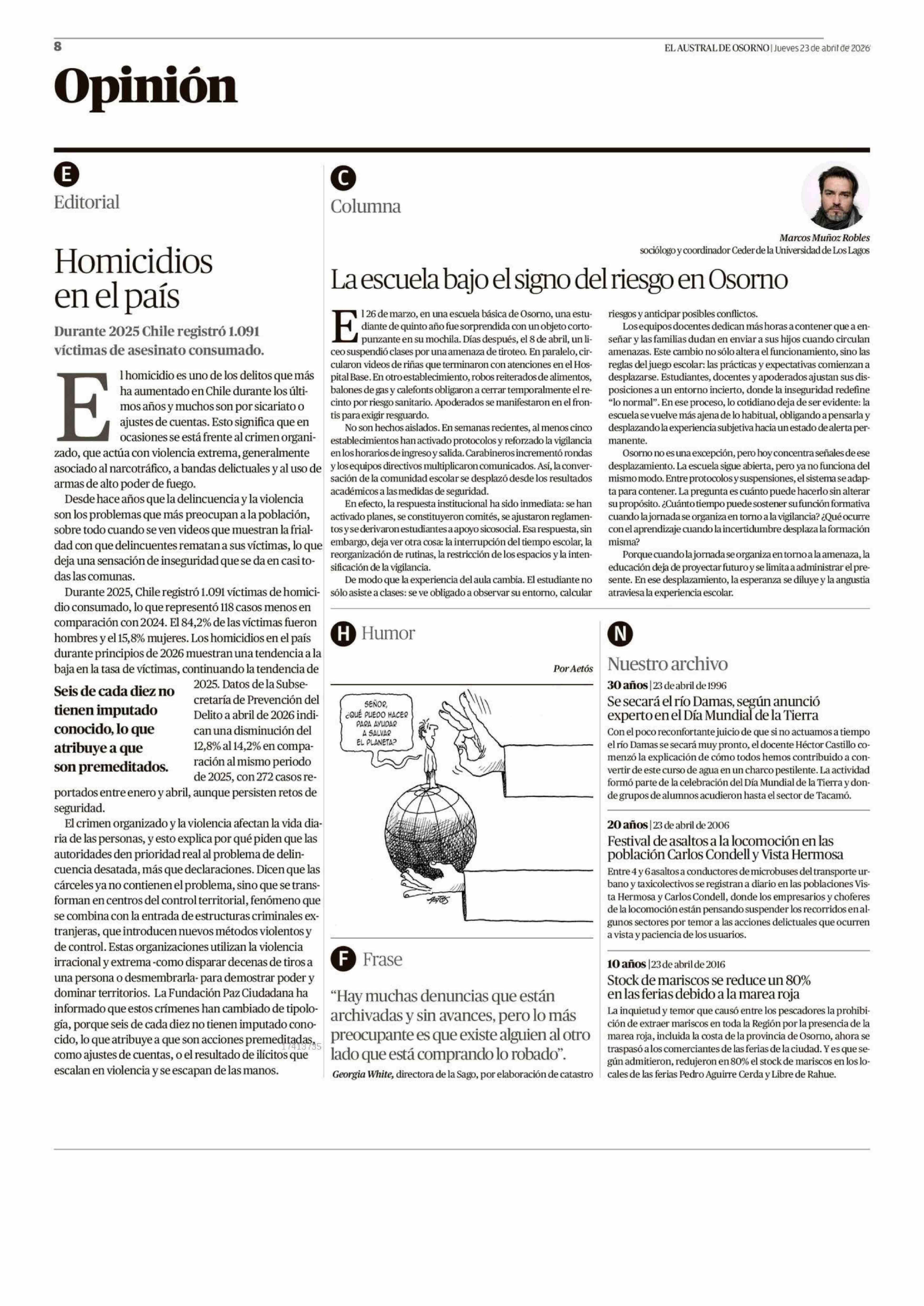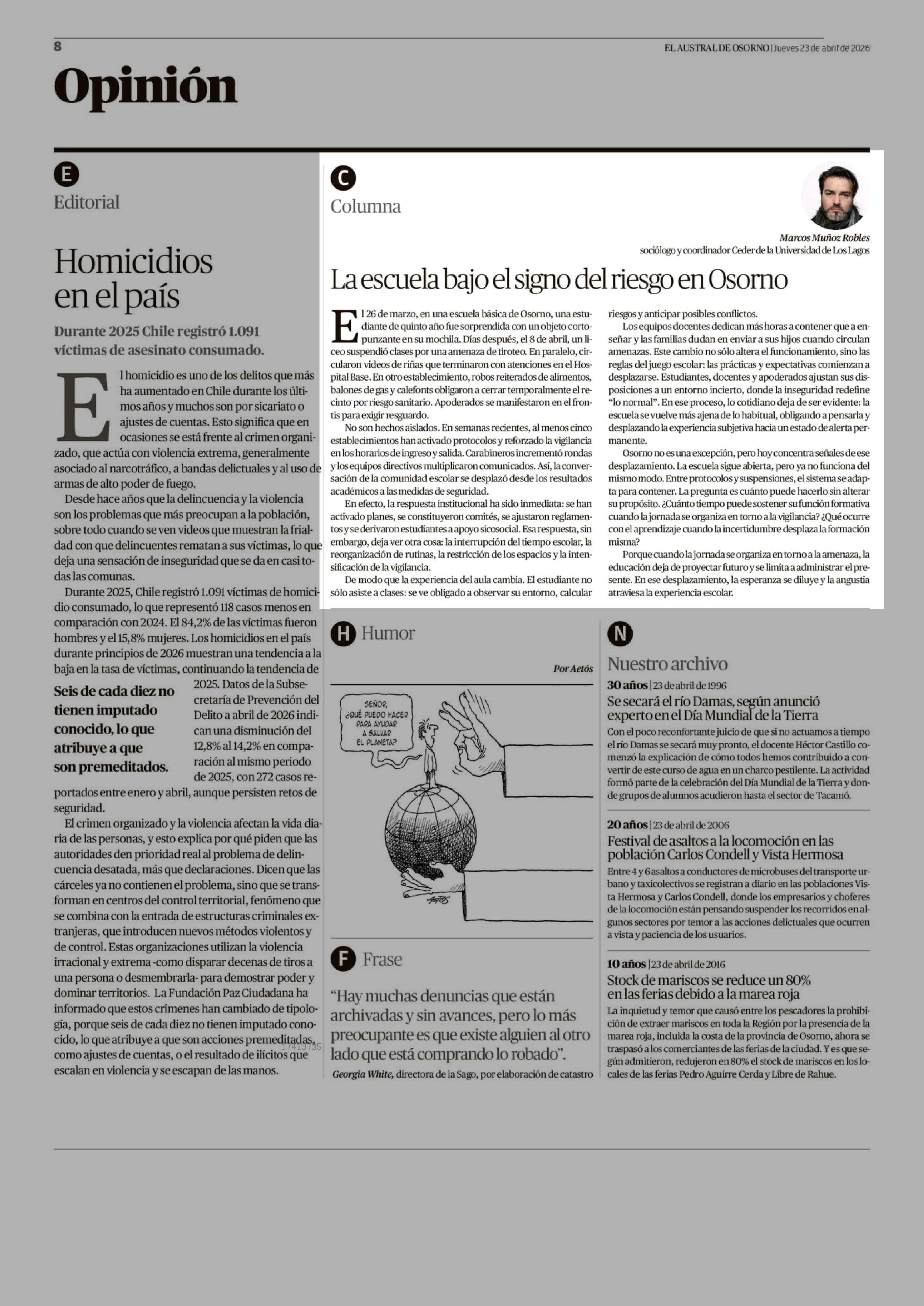Columnas de Opinión: La escuela bajo el signo del riesgo en Osorno 23-04-2026 El Austral de Osorno |