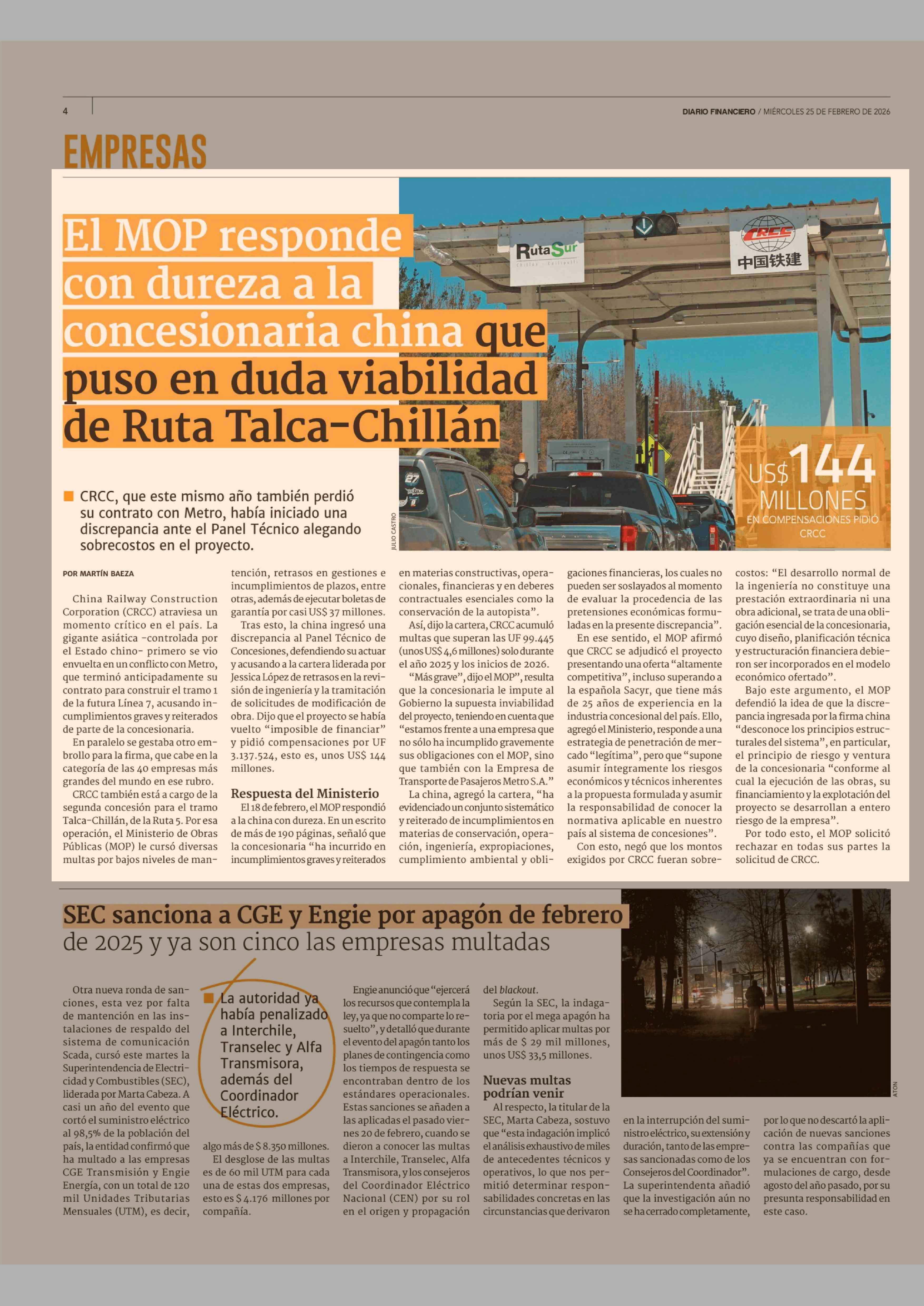El MOP responde con dureza a la concesionaria china que puso en duda viabilidad de Ruta Talca-Chillán 25-02-2026 Diario Financiero |