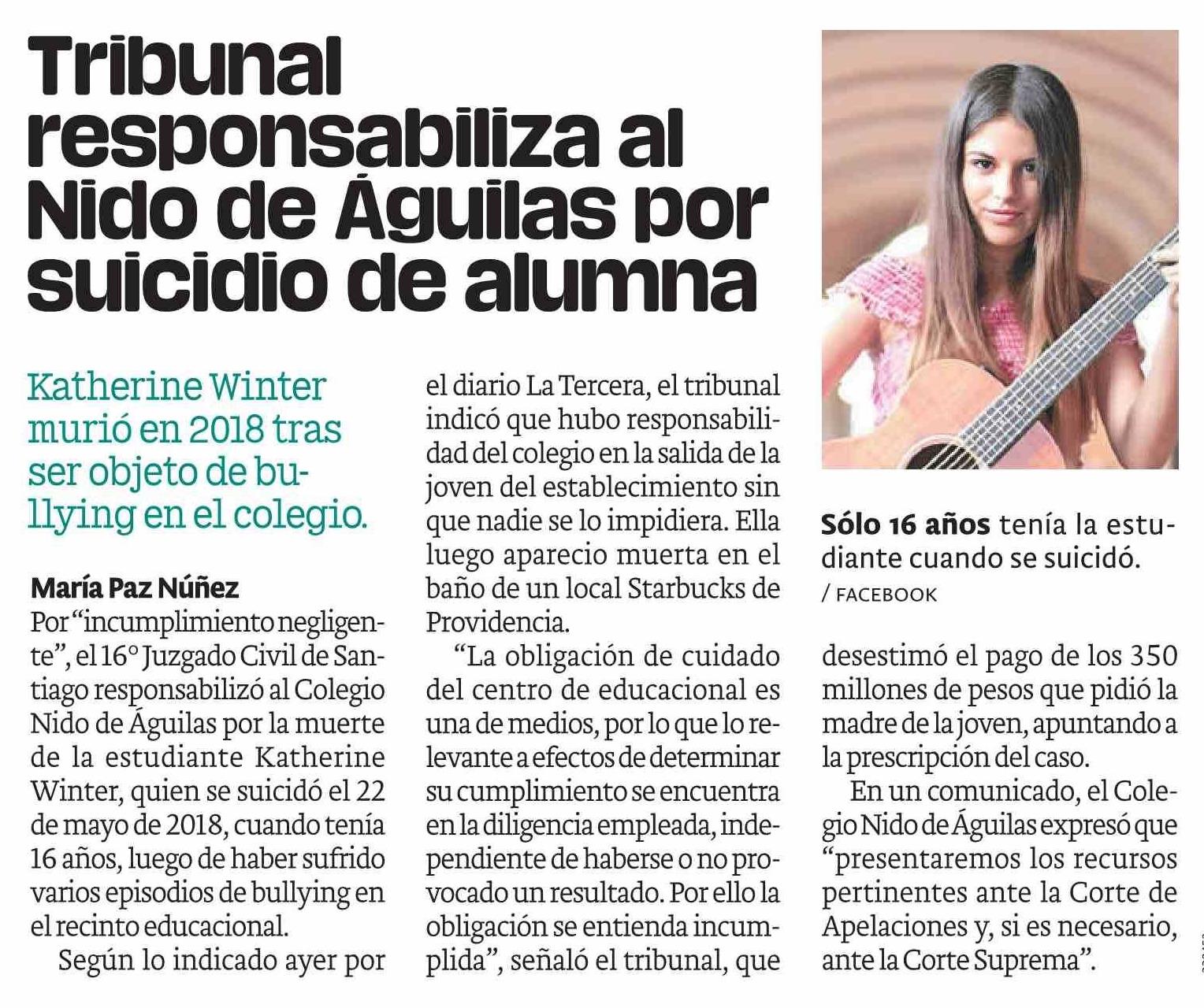 | Título: | Tribunal responsabiliza al Nido de Águilas por suicidio de alumna |