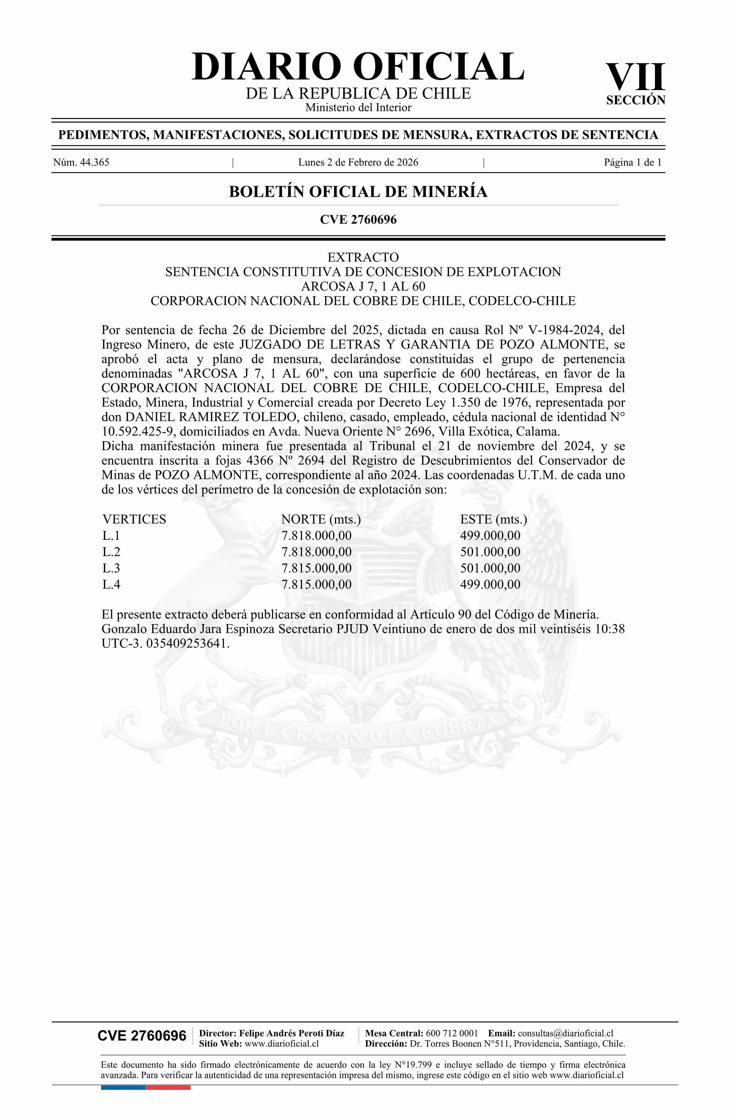 ARCOSA J 7, 1 AL 60 / Corporación Nacional del Cobre de Chile 02-02-2026 DIARIO OFICIAL CHILE - BOLETÍN OFICIAL DE MINERÍA |