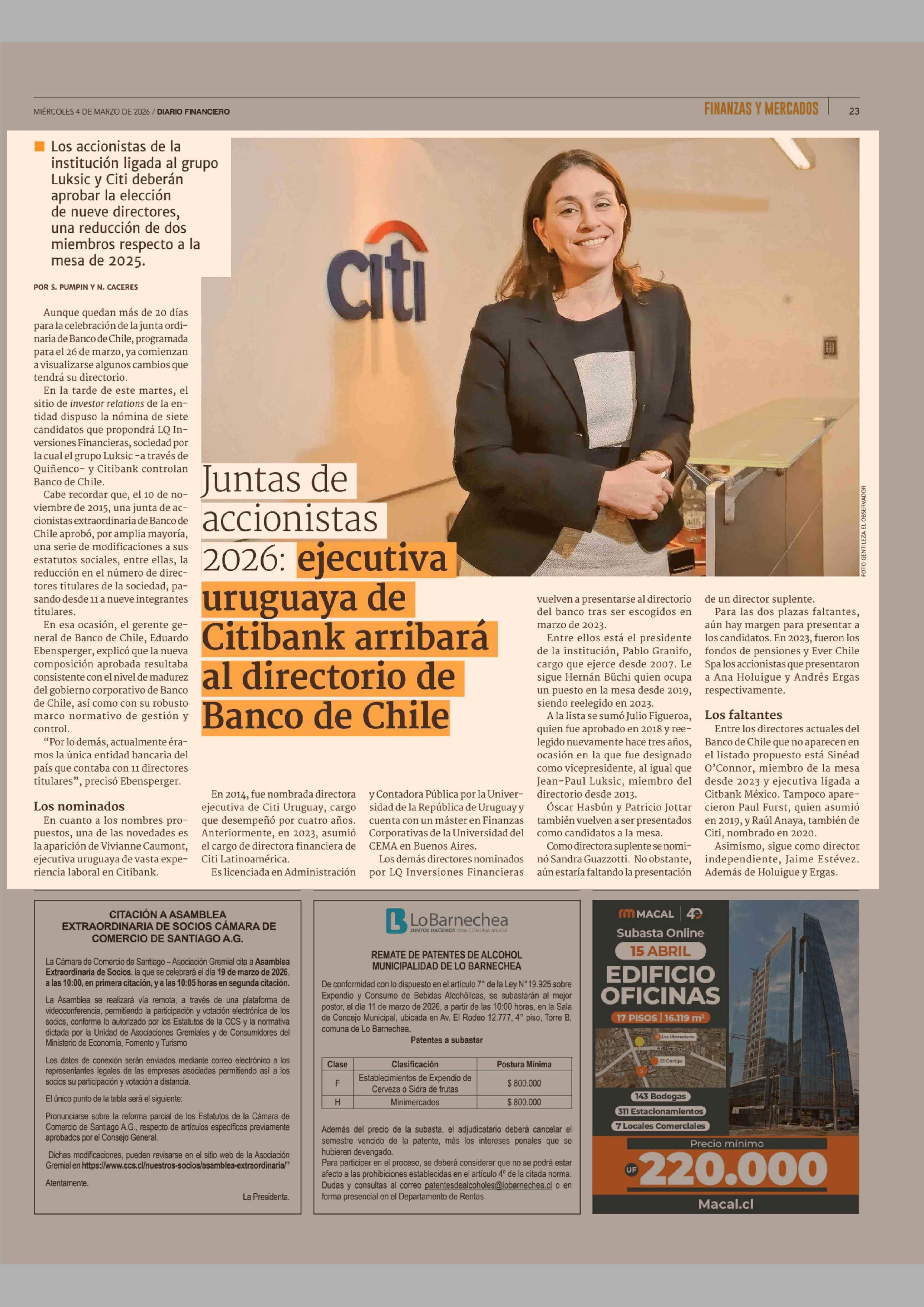 | Título: | Juntas de accionistas 2026: ejecutiva uruguaya de Citibank arribará al directorio de Banco de Chile |