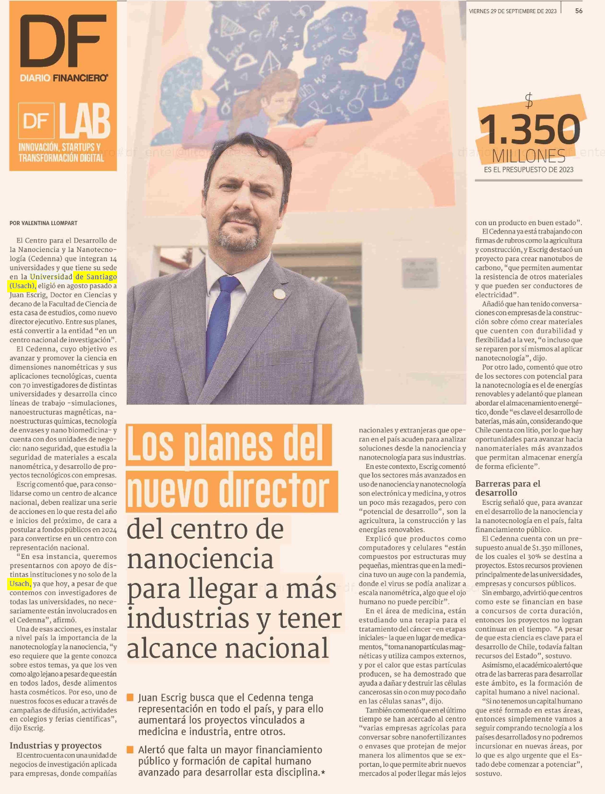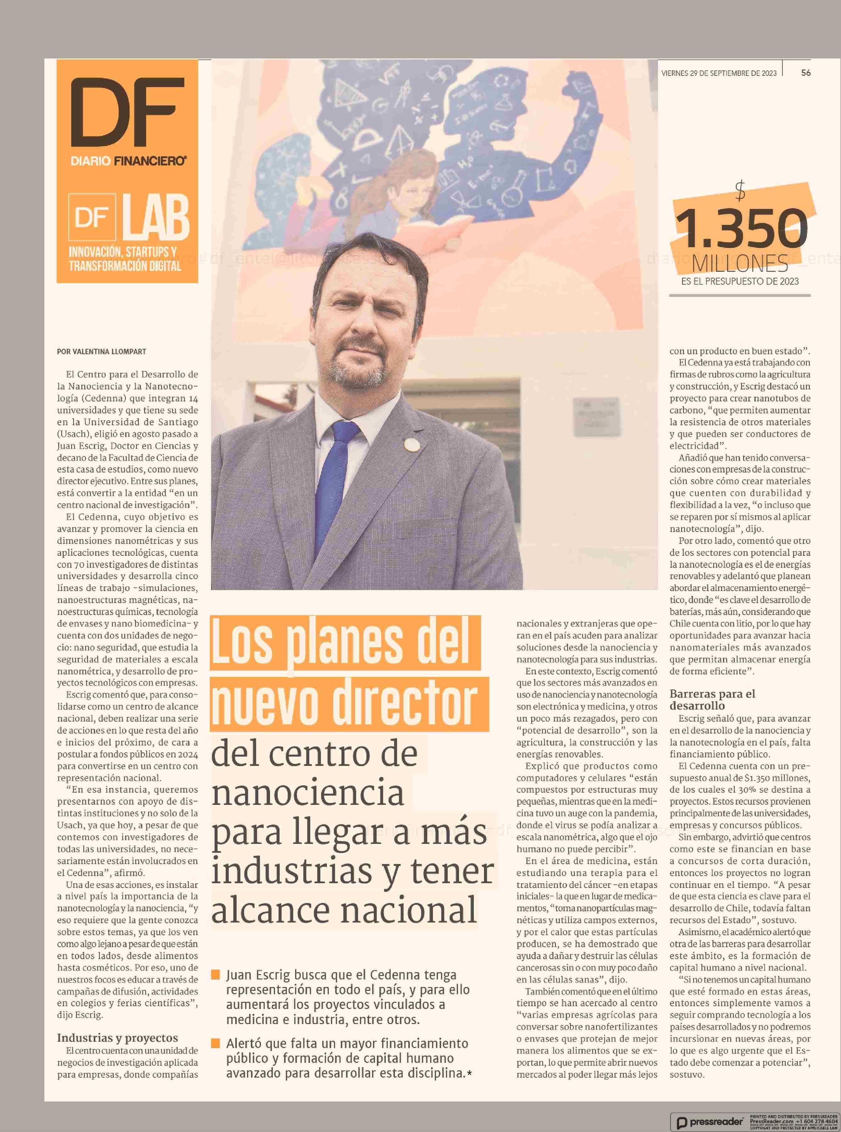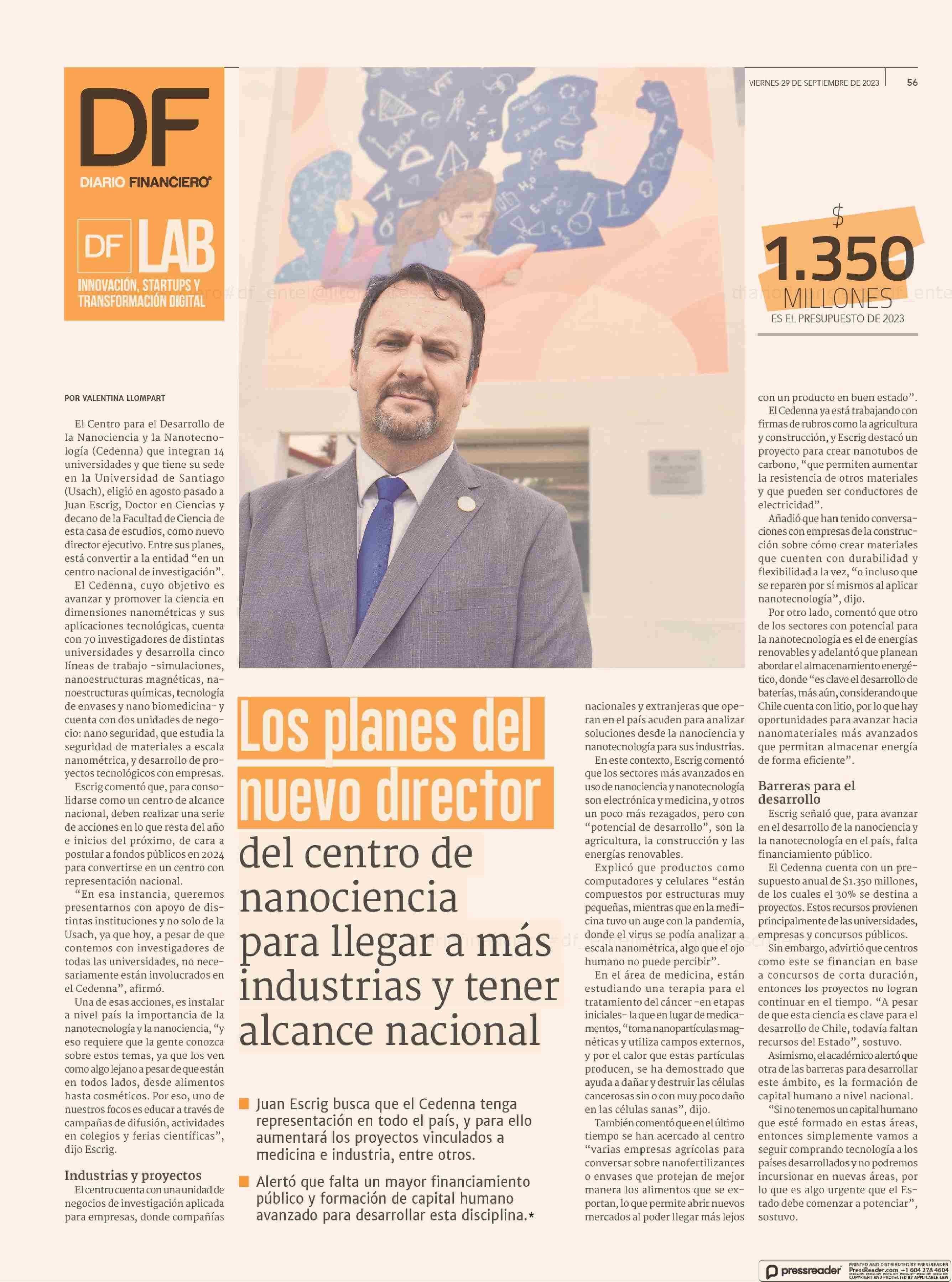 Los planes del nuevo director del centro de nanociencia para llegar a más industrias y tener alcance nacional 29-09-2023 Diario Financiero |