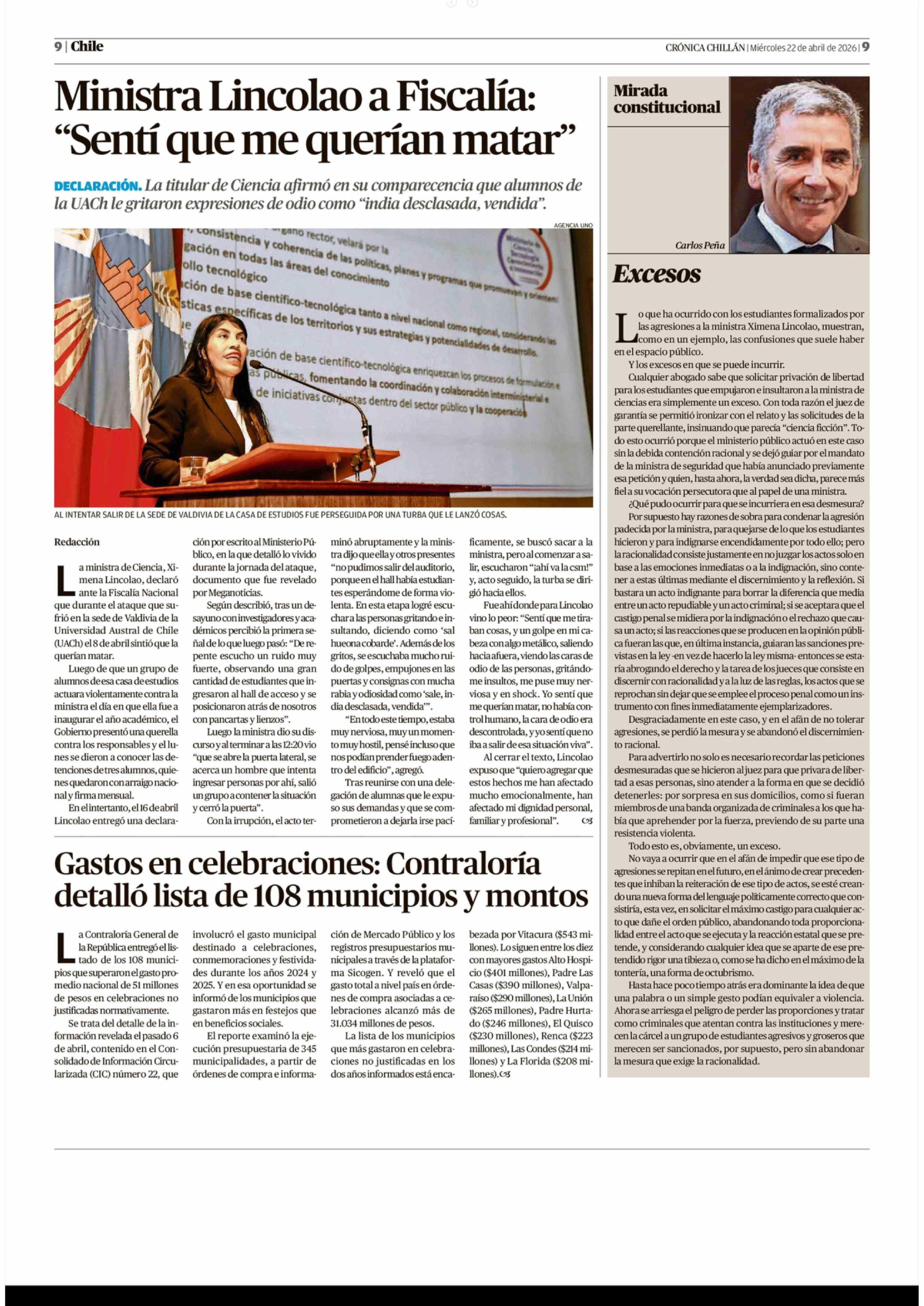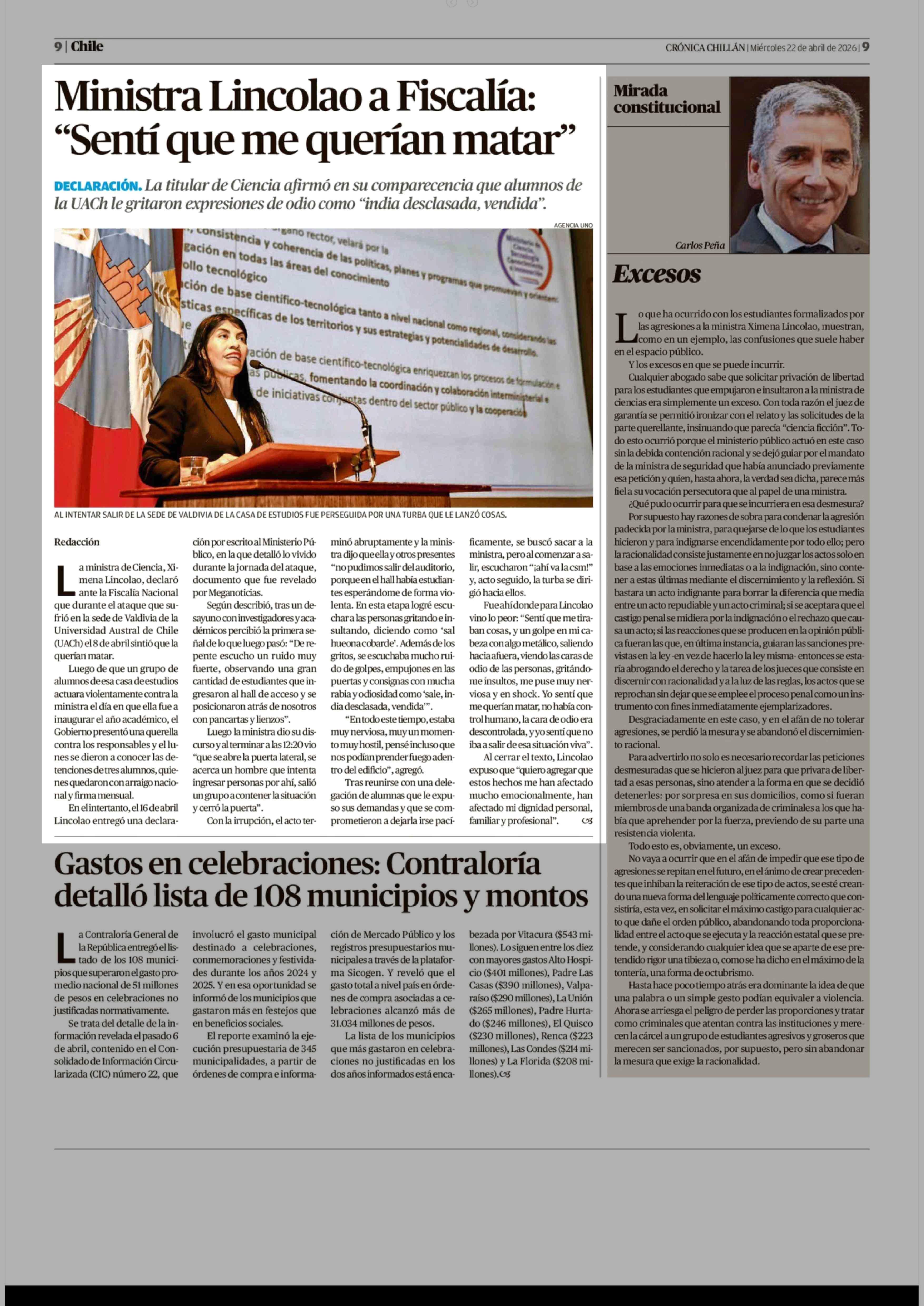 Ministra Lincolao a Fiscalía: "Sentí que me querían matar" 22-04-2026 Crónica de Chillán |
