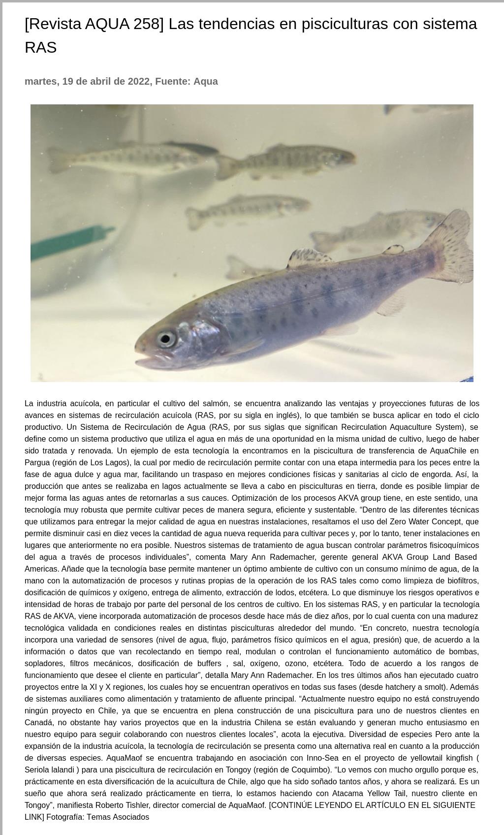 [Revista AQUA 258] Las tendencias en pisciculturas con sistema RAS 19-04-2022 Aqua.cl - Chile |