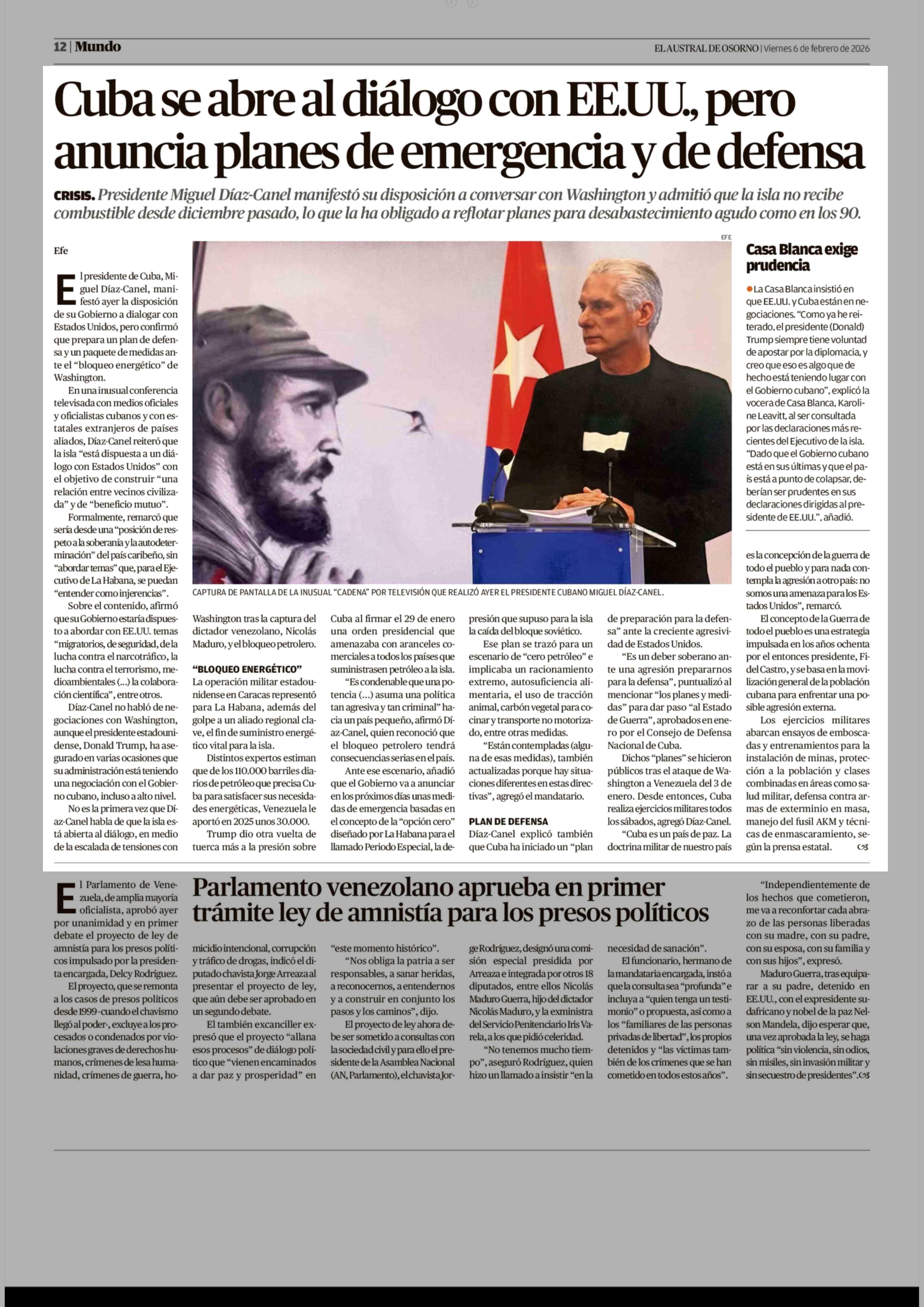 Cuba se abre al diálogo con EE.UU., pero anuncia planes de emergencia y de defensa 06-02-2026 El Austral de Osorno |