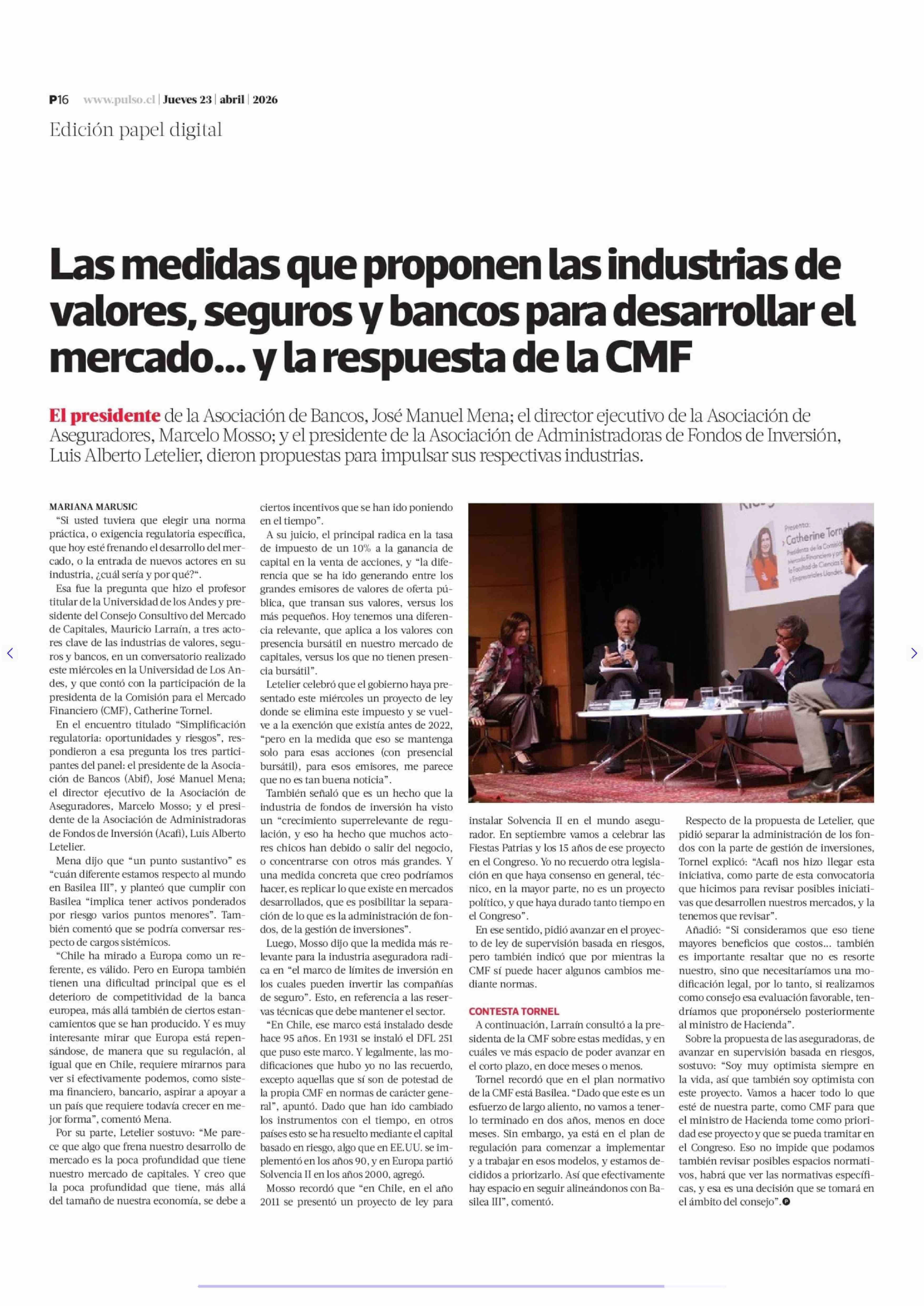 Las medidas que proponen las industrias de valores, seguros y bancos para desarrollar el mercado ... y la respuesta de la CMF 23-04-2026 La Tercera |