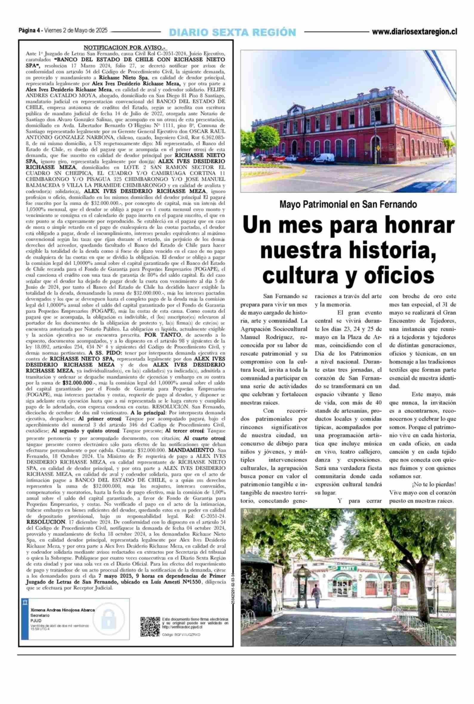 Fuente: Diario VI Región (Diario VI Región) Página(s): 4