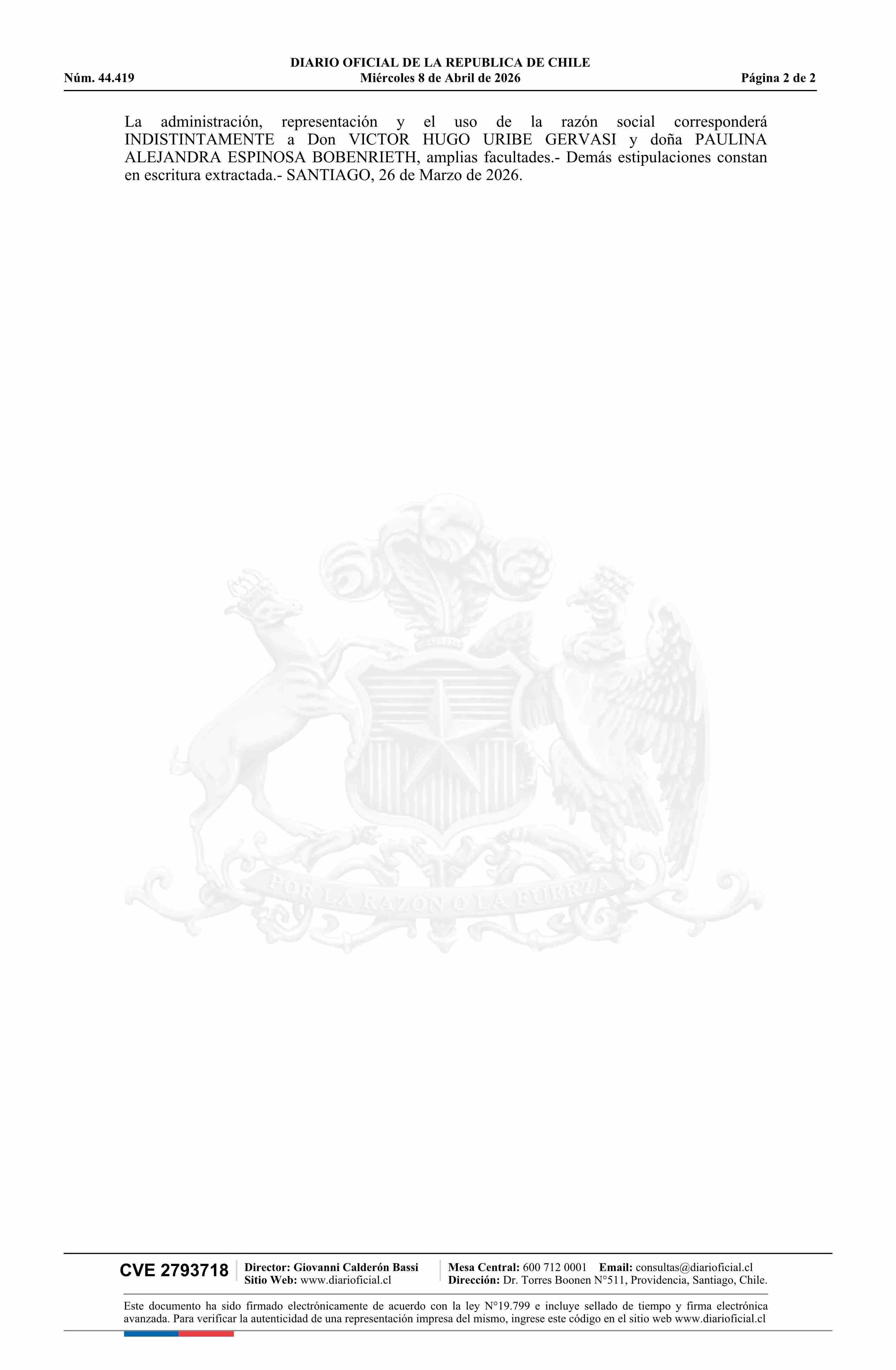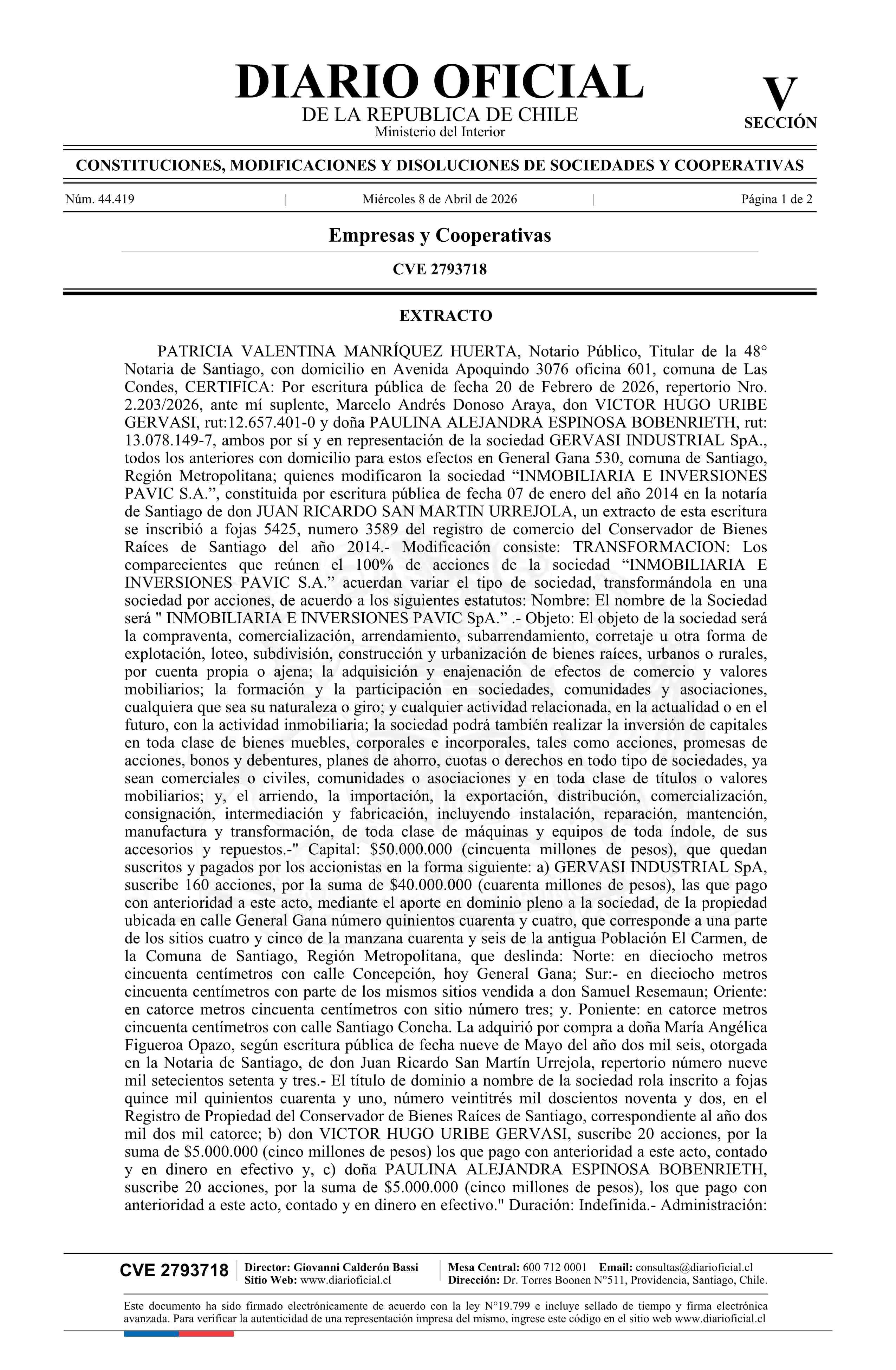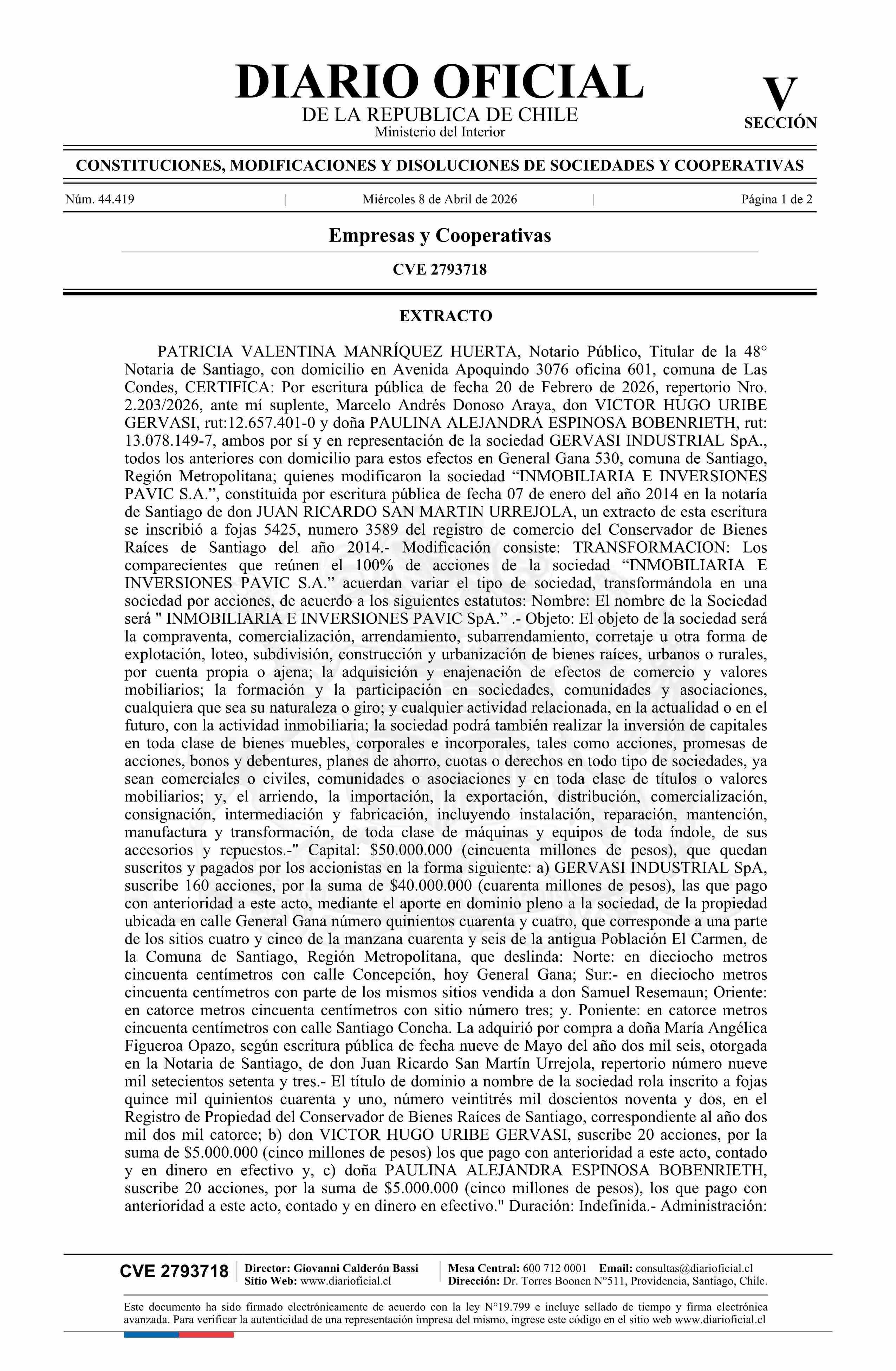 INMOBILIARIA E INVERSIONES PAVIC S.A. 76.360.917-0* 08-04-2026 Diario Oficial Edición Electrónica |